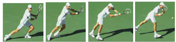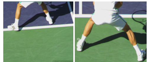 Note that in the photo on the left, showing a return from the deuce service side, Novak's right foot lands ahead of his left foot so that he directly faces the server; and in the photo on the right, showing a return from the ad service side, Novak's left foot lands in front of his right foot so that he directly faces the server.