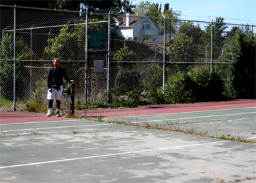 A train tunnel was right next to the courts, and the noise was deafening. This was good concentration practice. Next to the tracks there was a polly wog trench, filled with gooey lime green algae, and lots of frogs.