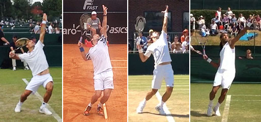 As you might expect, Andy is the quickest in Phase 1. To complete Phase 1--reaching the extension of the tossing arm and the full coiling of the legs--takes him about .44 seconds. Pete takes more time to reach the same position at about .68 seconds. Federer takes the most time .88 seconds, almost twice as much as Andy. At this point all have extended their tossing arms and reached maximum knee bend. But note the differences in the arm and racket.