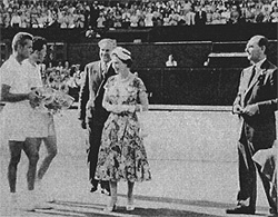 In 1951 Dick Savitt and I had been invited to play an exhibition match at Lady Crossfield's. During the course of the day I was presented to Princess Elizabeth, as she was at the time. I asked her why she never came to Wimbledon, and helpfully offered to get her some tickets.