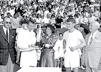 But Roland Garros was an altogether different matter. Seeded No. 2 he was too strong for Art Larsen, defeating the No. 12 seed, 6-4, 7-5, 6-l in the singles final to earn the La Coupe des Mousquetaires. He added the Jacques Brugnon Cup to his Paris trophy collection when he and Seixas swept past Lew Hoad and Ken Rosewall in the doubles, 6-4, 6-2, 6-1.