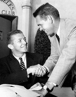Jack Kramer was a slashing serve and volleyer who tempered his aggressive play with savvy tactics. These traits carried over to his professional tennis promotion efforts. Though I never spoke with Jack or Tony directly about this, it seems that the appeal of a Tony Trabert – Richard Gonzalez tour was The Golden Boy Versus Mr. Sullen.