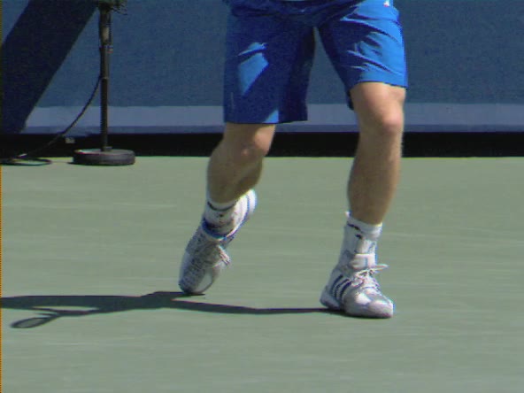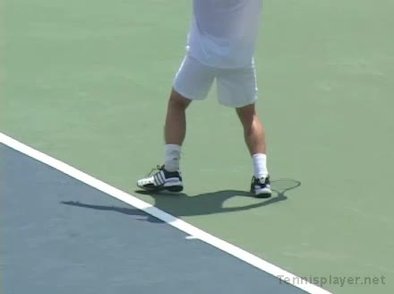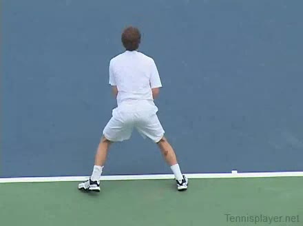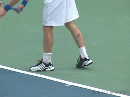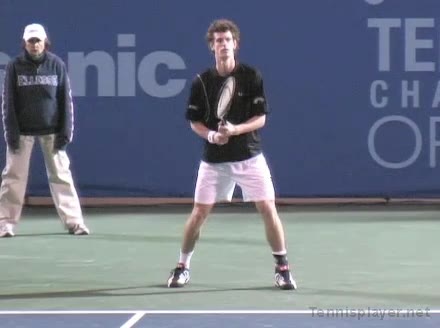 Andy Murray's footwork during interactive drills from the center of the court, filmed from a side angle. His hips stay relatively low with consistent knee flexion as he changes direction, showing clear loading on the outside leg before each push-off.