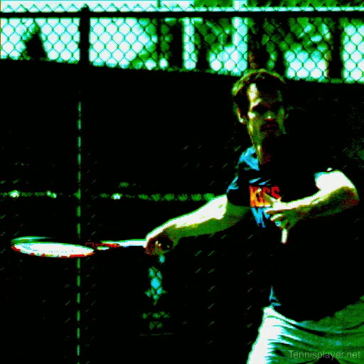 Andy Murray's backhand from a closed stance, filmed from the rear. The contact point is slightly in front of his body with the racket face nearly square to the baseline and the swing path driving upward through the ball.