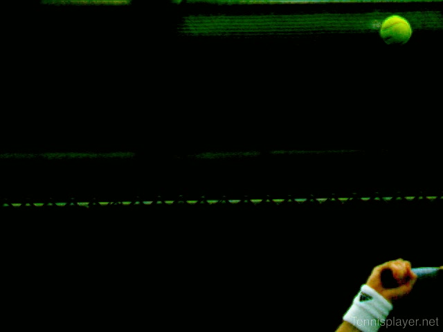 Andy Murray's backhand half-volley from the center of the court, filmed from a front angle. His shoulders stay relatively closed with a compact trunk coil, then uncoil minimally through contact to stabilize the racket face on this low, fast incoming ball.