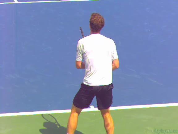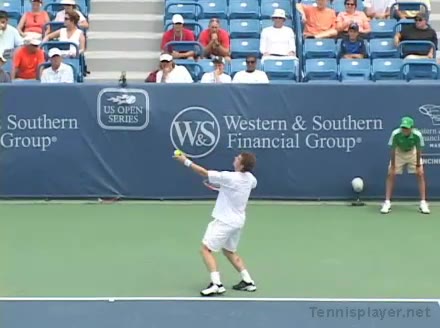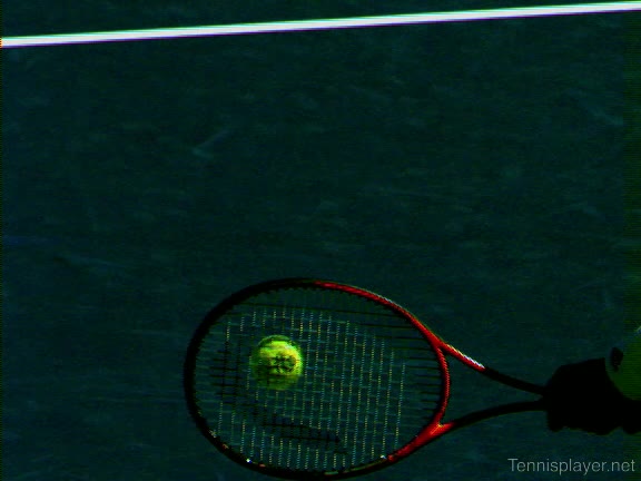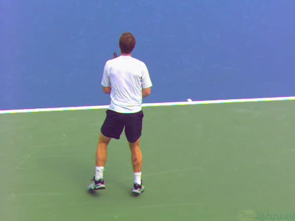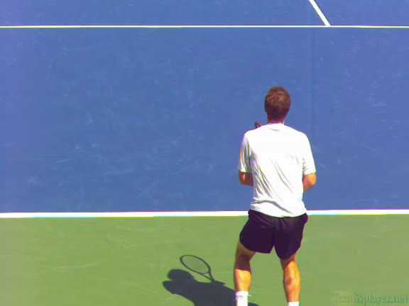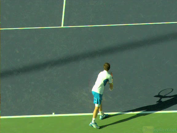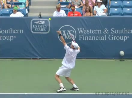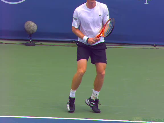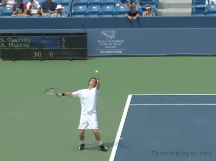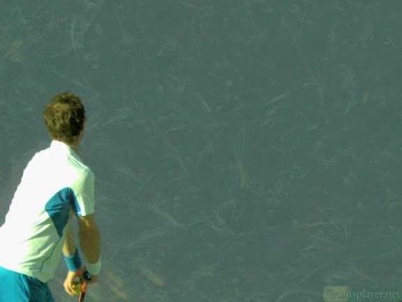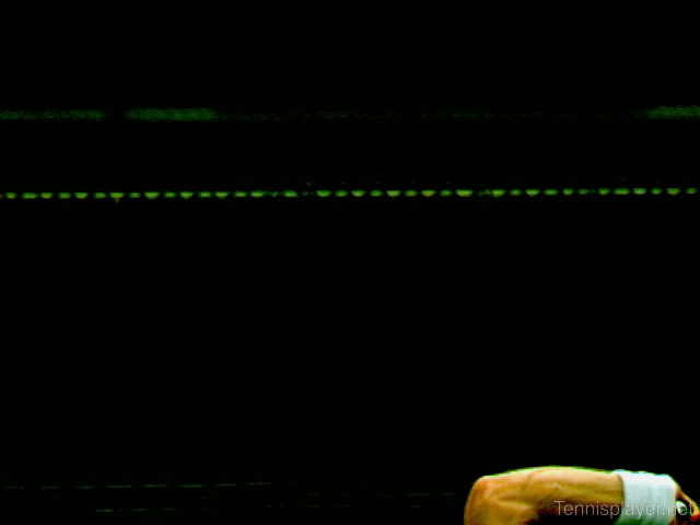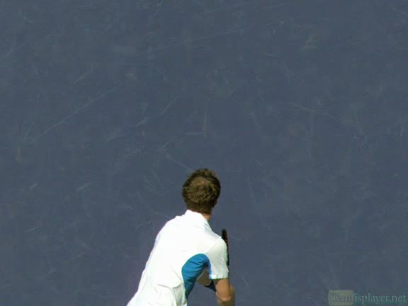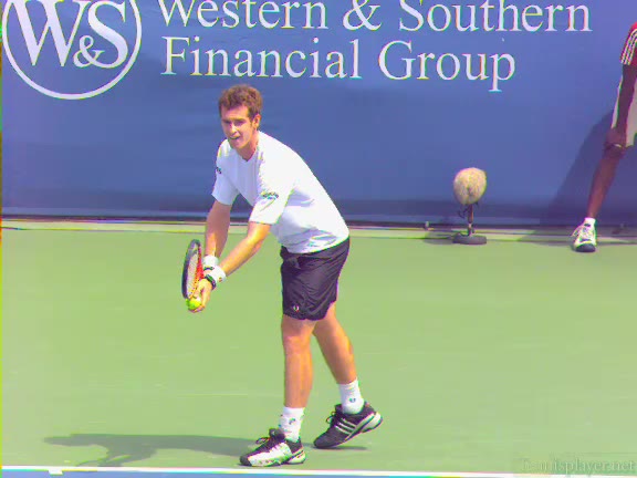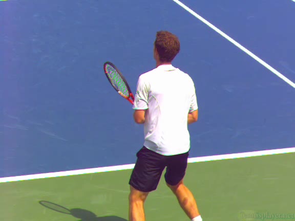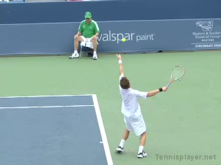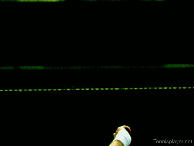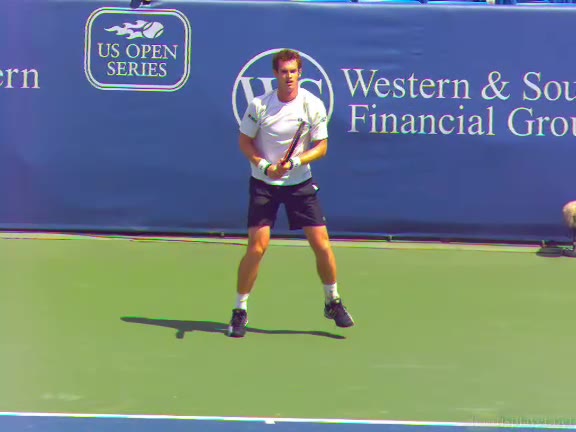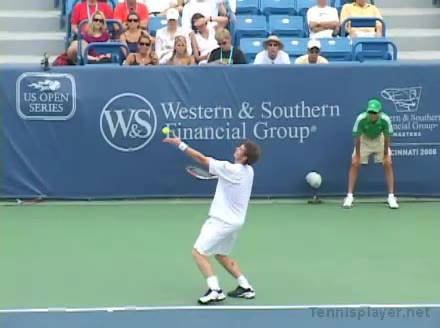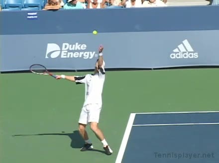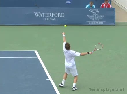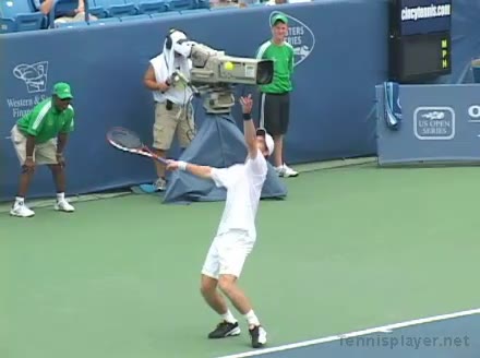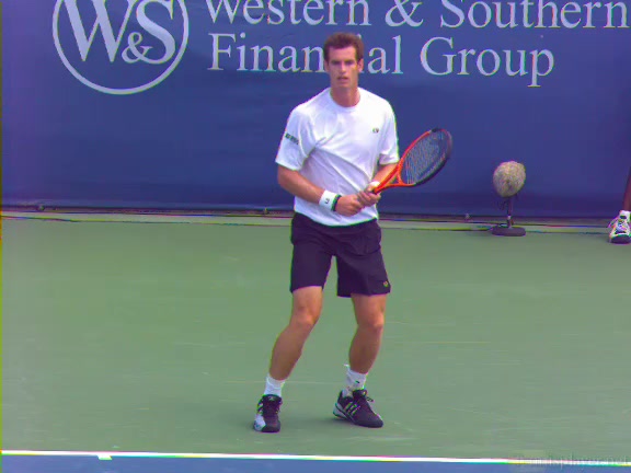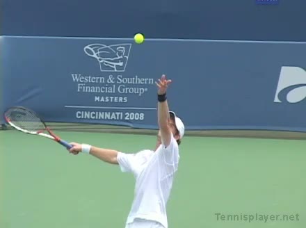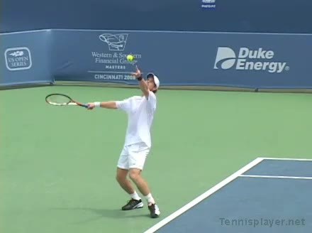 Andy Murray's serve from the center position, filmed from the front at 8388 fps in ultra slow motion. His shoulder line rotates from a closed position into square at contact as the trunk uncoils sequentially from hips to shoulders, making the timing of upper-body rotation very clear.