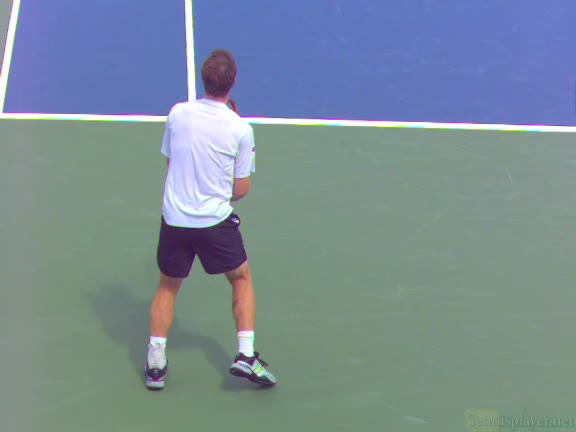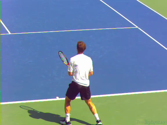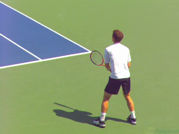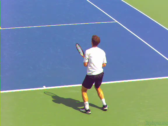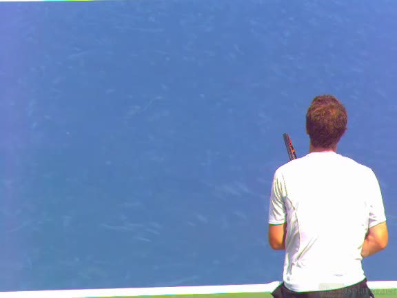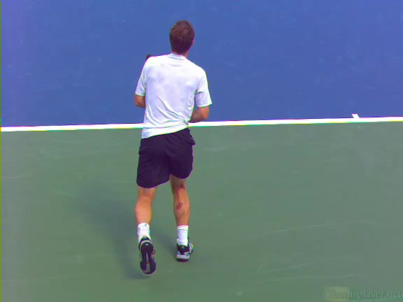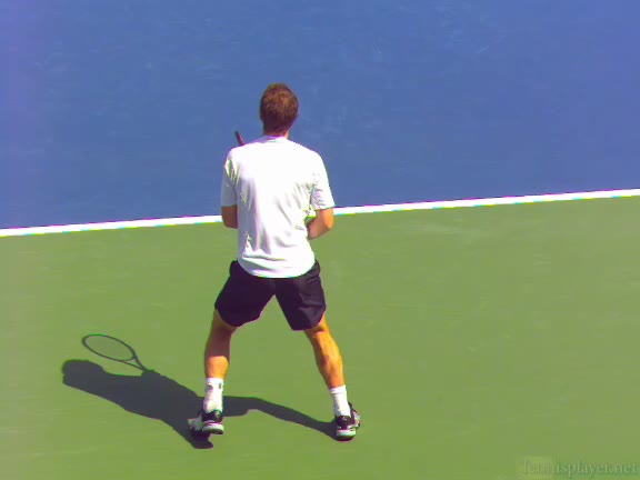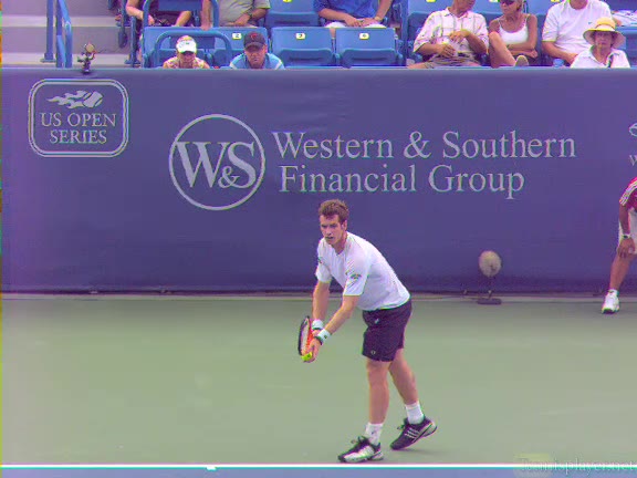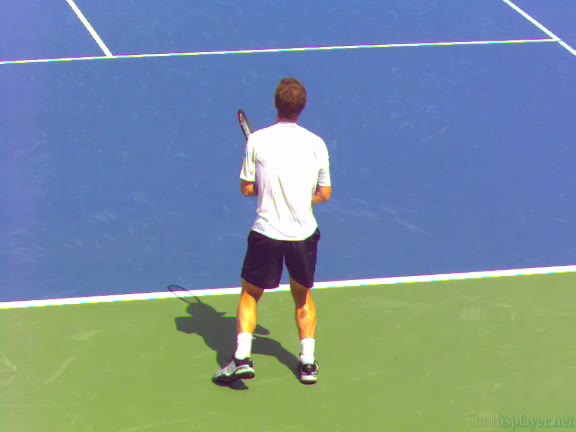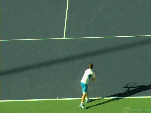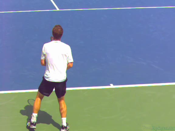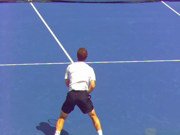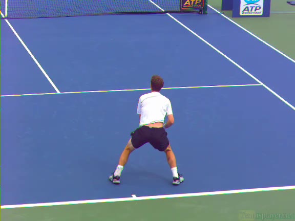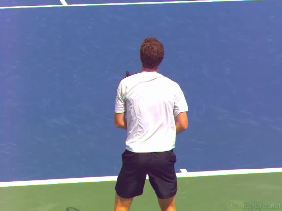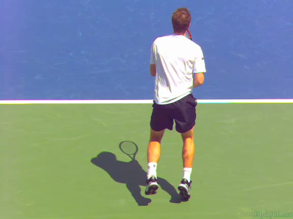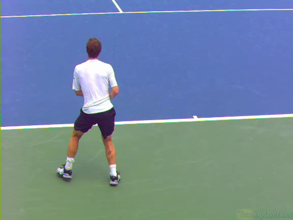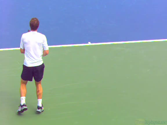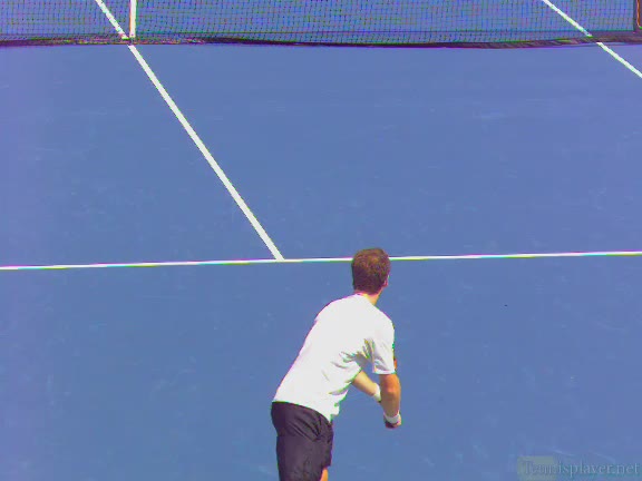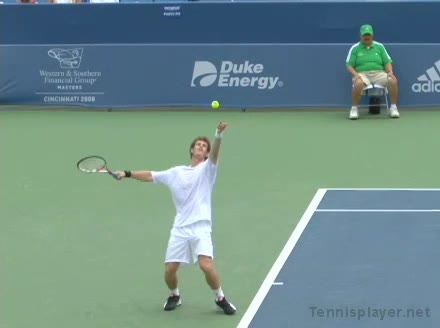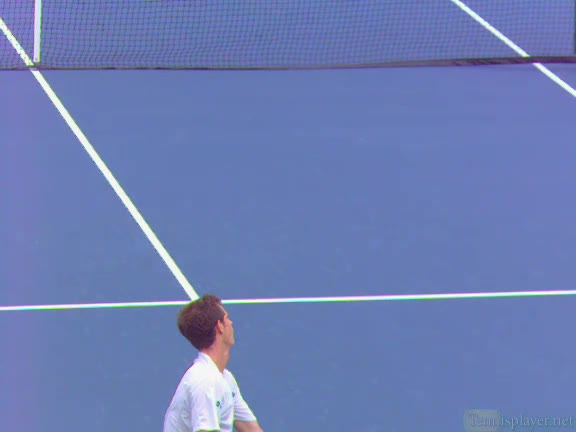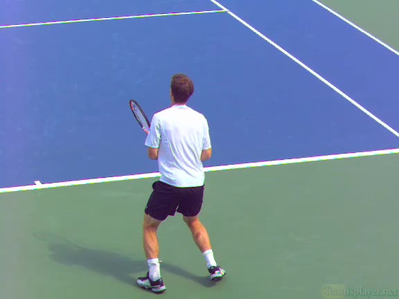 Andy Murray's serve from the center position, filmed from the front at 8388 fps in ultra slow motion. His shoulder line rotates from a closed position into square at contact as the trunk uncoils sequentially from hips to shoulders, making the timing of upper-body rotation very clear.