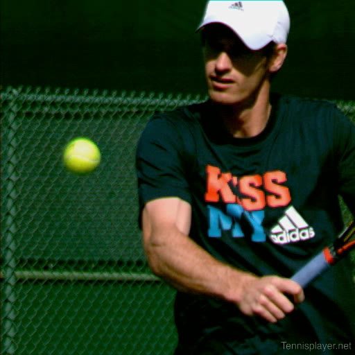 Andy Murray's two-handed backhand from the center of the court in a closed stance, filmed from the front at 250 fps. His semi-western left-hand grip and firm right-hand support keep the wrists quiet through the backswing, with a pronounced but controlled wrist lag that unwinds into a compact, late snap right at contact.