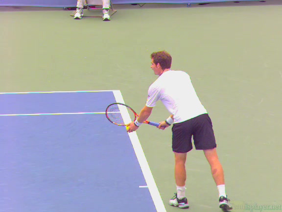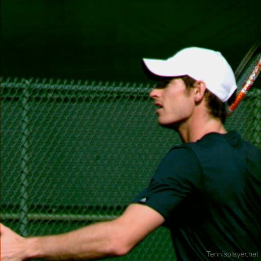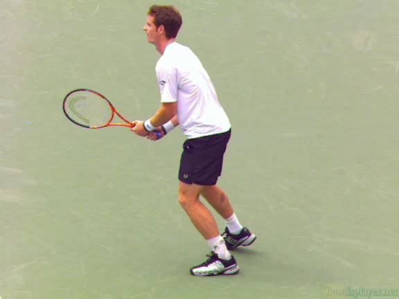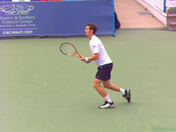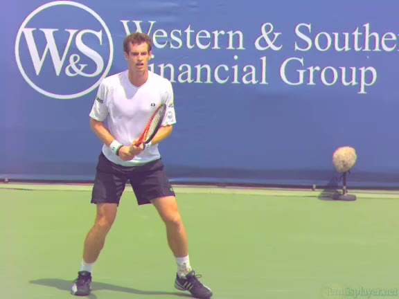 Andy Murray's running forehand slice from the side, filmed from a side angle. His continental grip stays firm with minimal grip change while the wrist remains laid back through the swing, creating a late, controlled carve at contact.