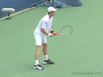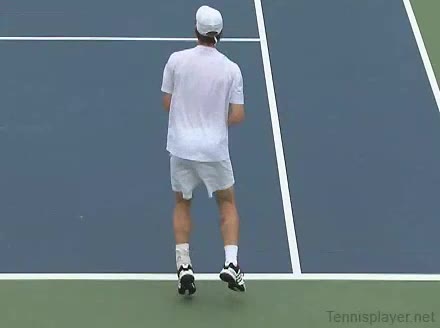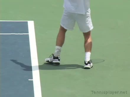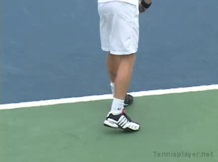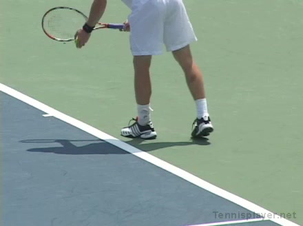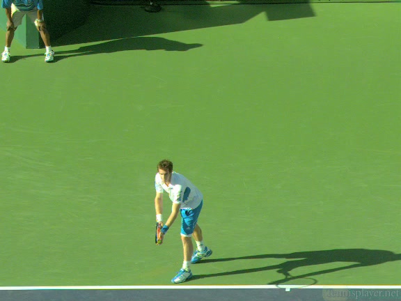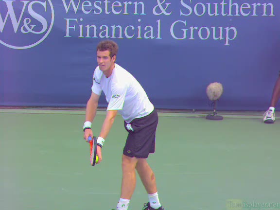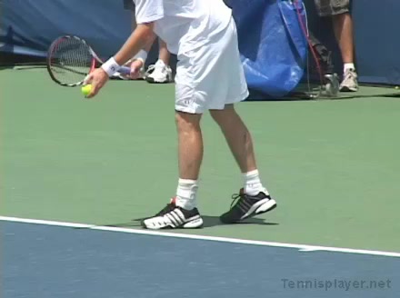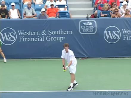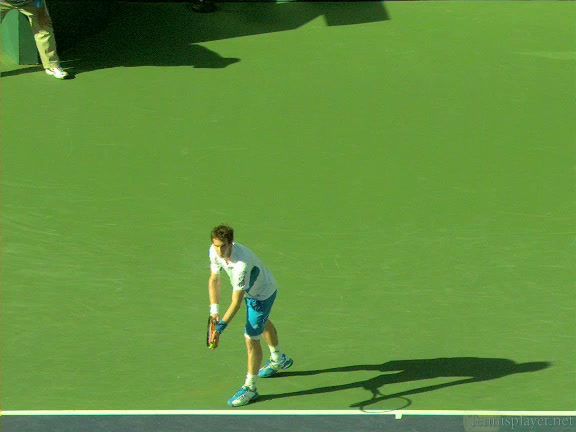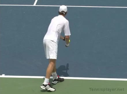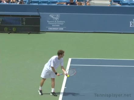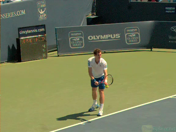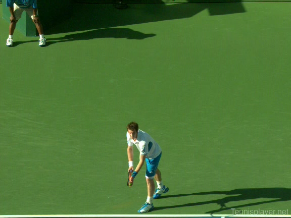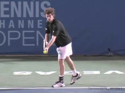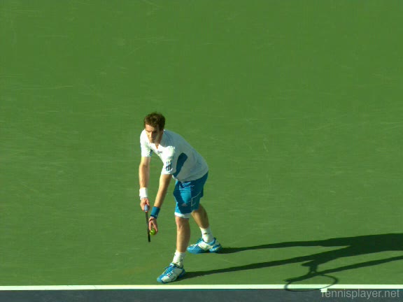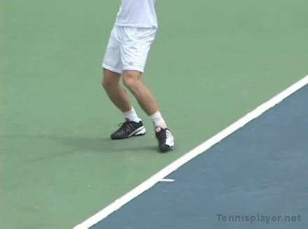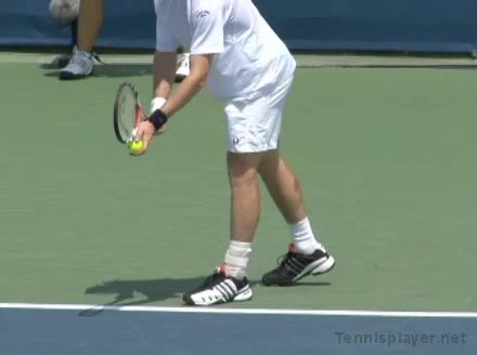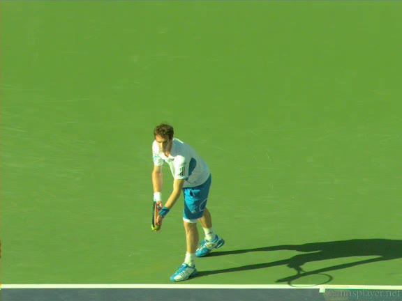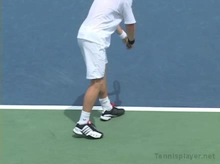 Andy Murray's serve from a central position, filmed from the side. His footwork into the serve uses a controlled platform stance with a clear knee bend and weight transfer from back foot to front foot before landing inside the court.