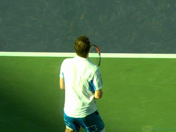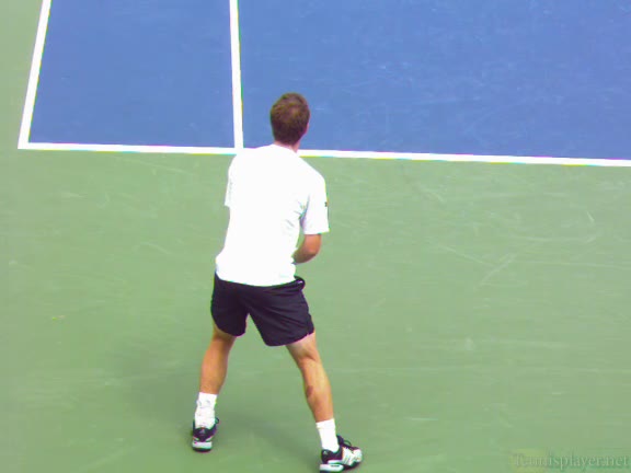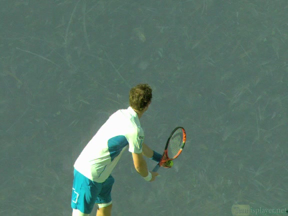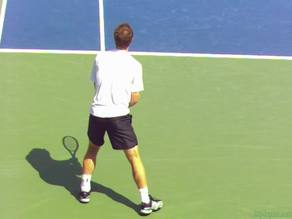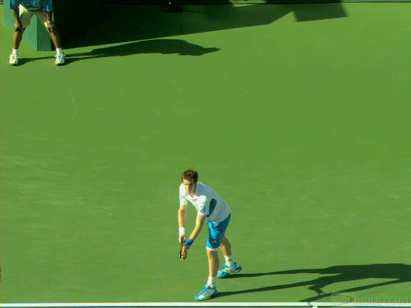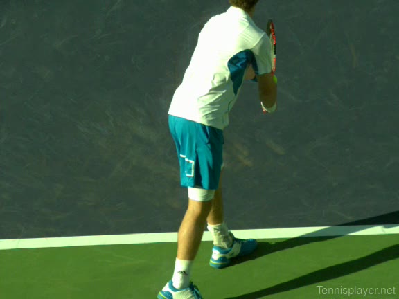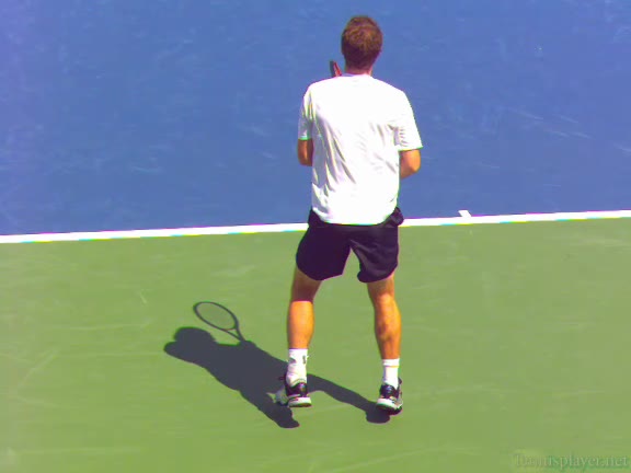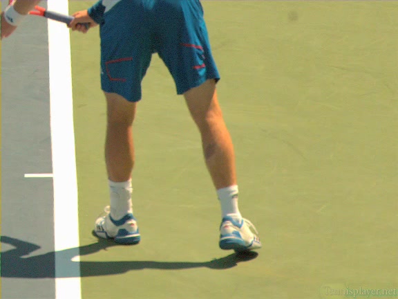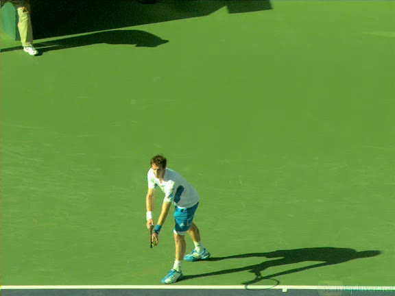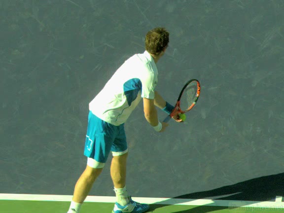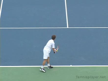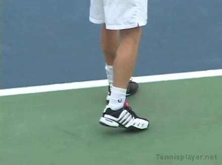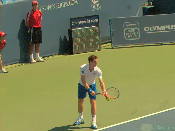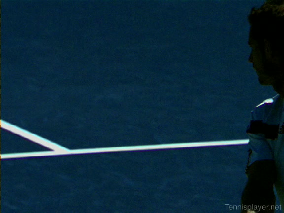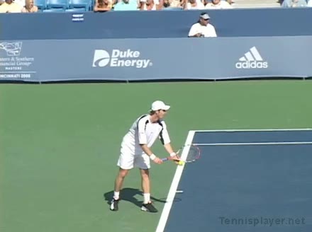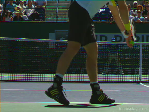 Andy Murray's serve from a central position, filmed from the side. His footwork into the serve uses a controlled platform stance with a clear knee bend and weight transfer from back foot to front foot before landing inside the court.