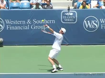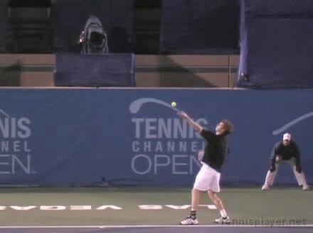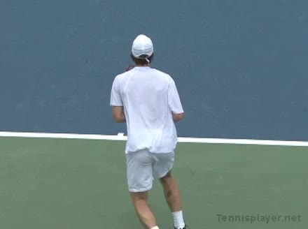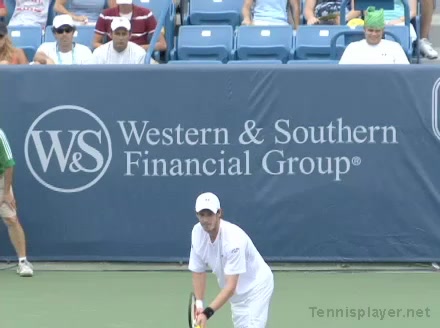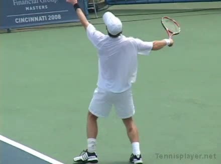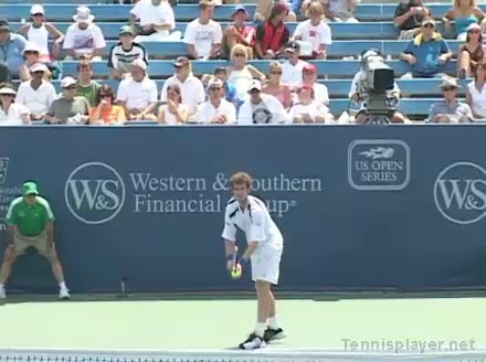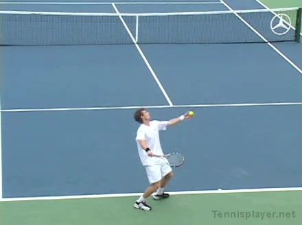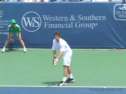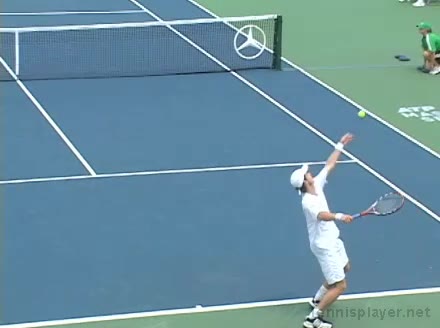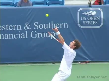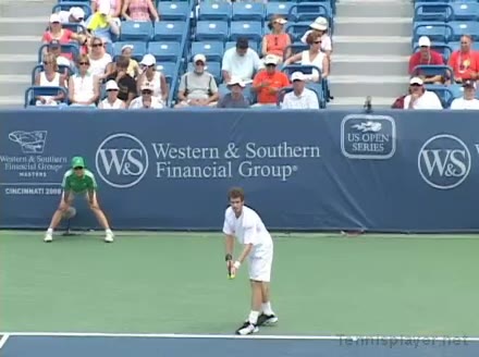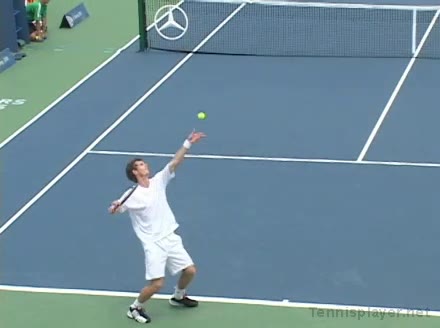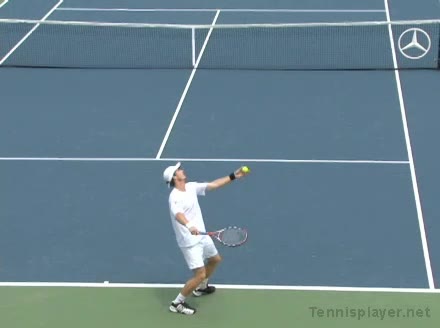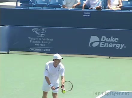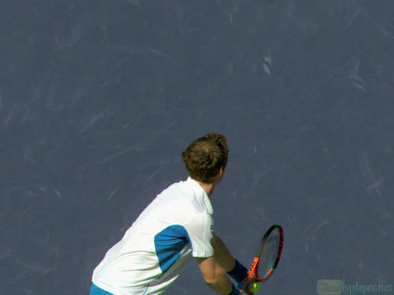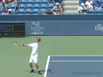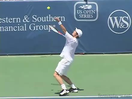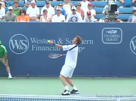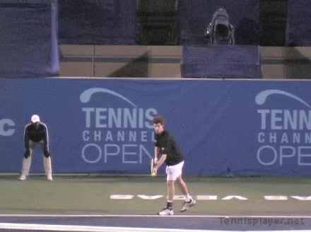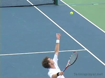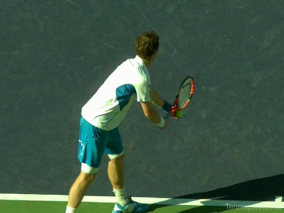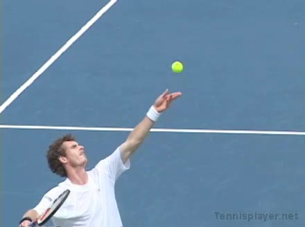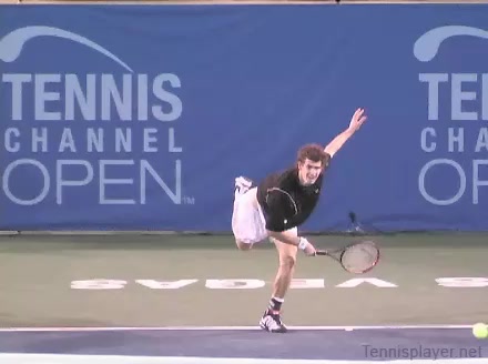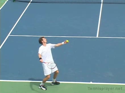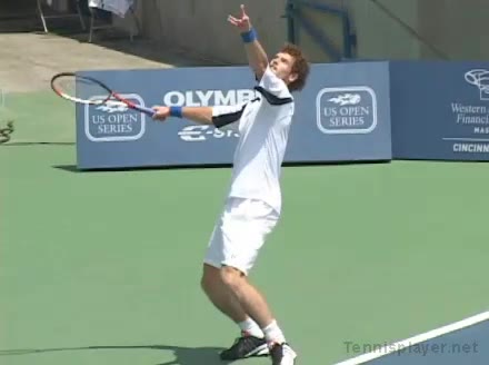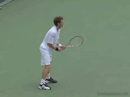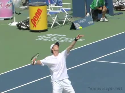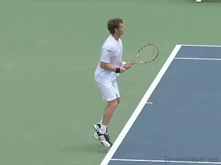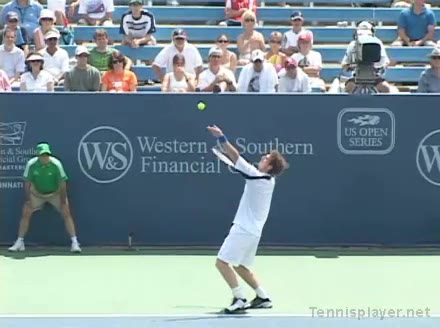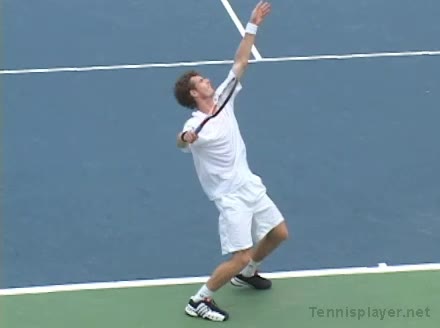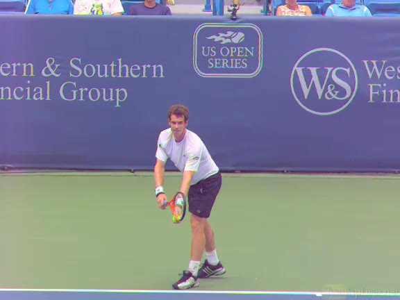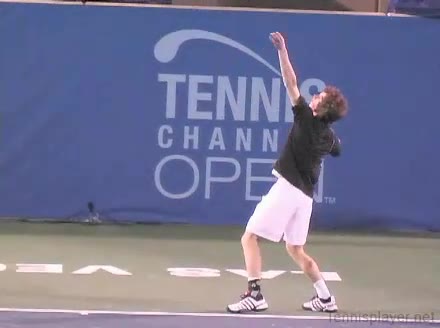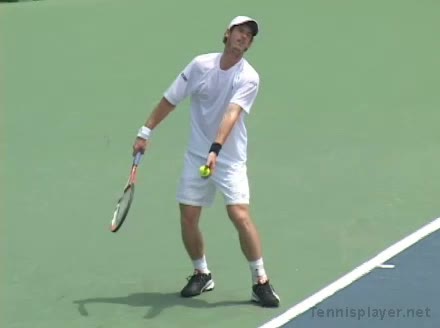 Andy Murray's serve from the center position, filmed from a front angle. His shoulders and trunk are clearly seen coiling away from the target before uncoiling in sequence, with the torso rotation leading the arm swing into contact.
