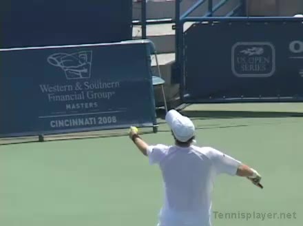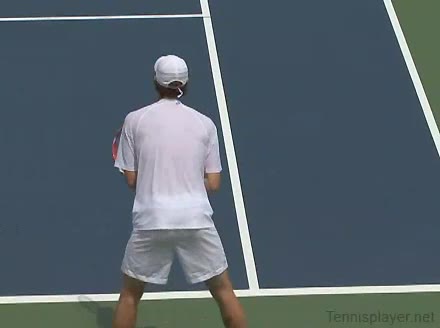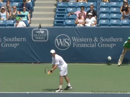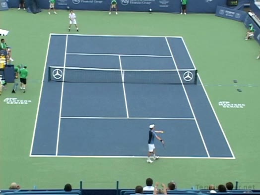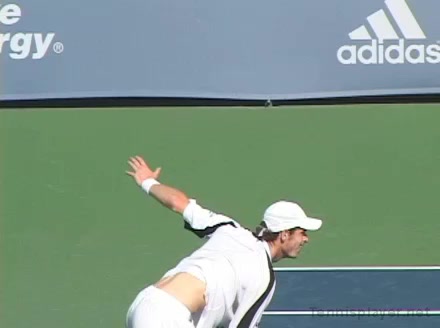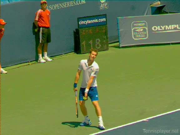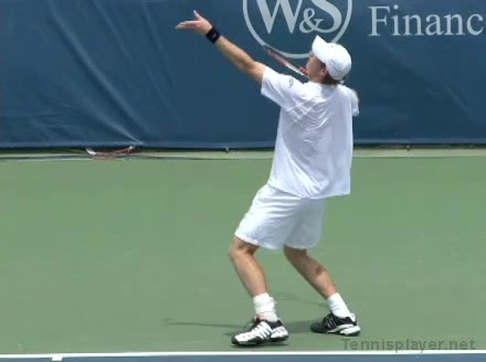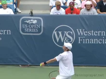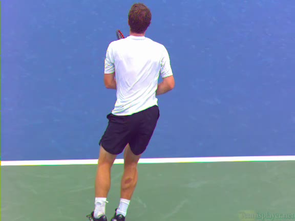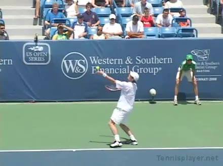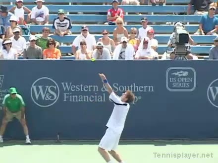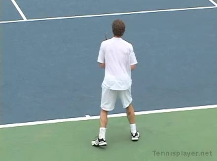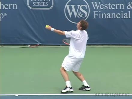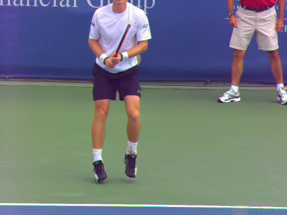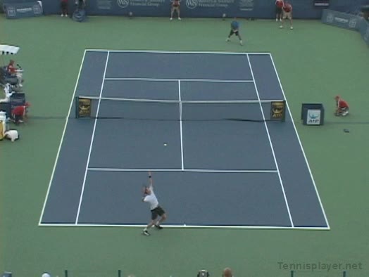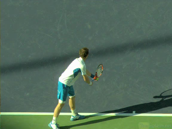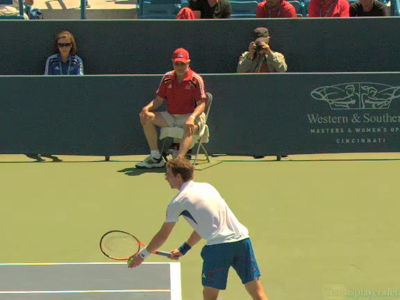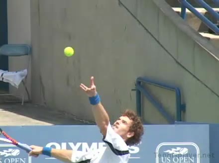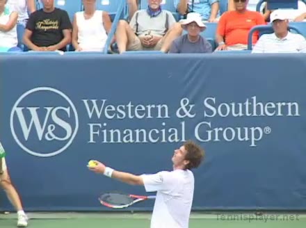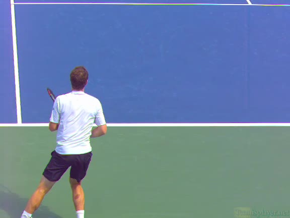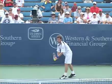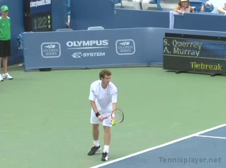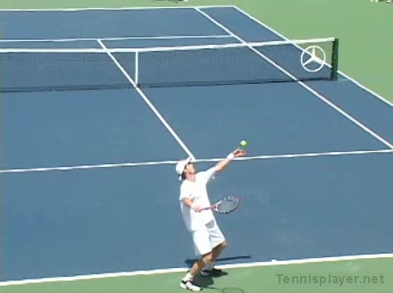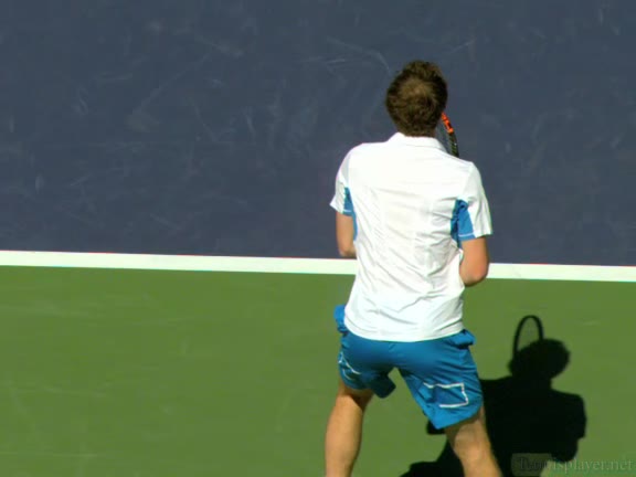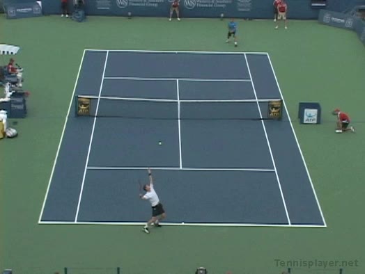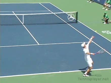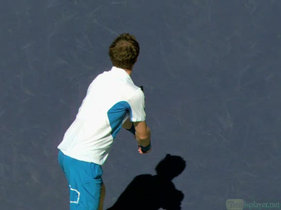 Andy Murray's serve from the center position, filmed from a front angle. His shoulders and trunk are clearly seen coiling away from the target before uncoiling in sequence, with the torso rotation leading the arm swing into contact.