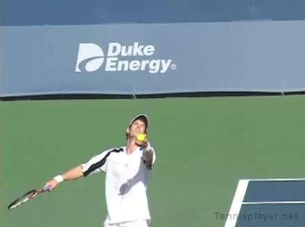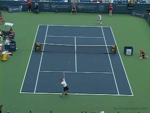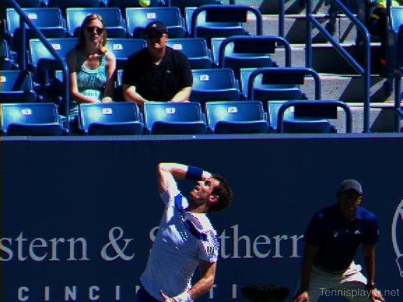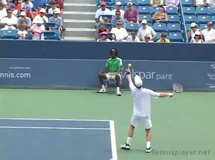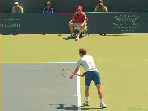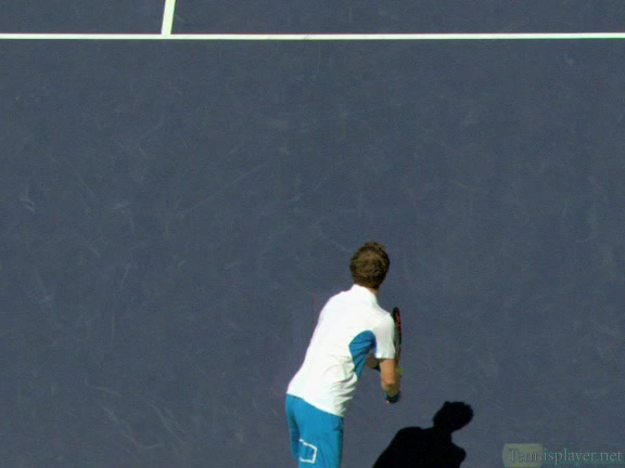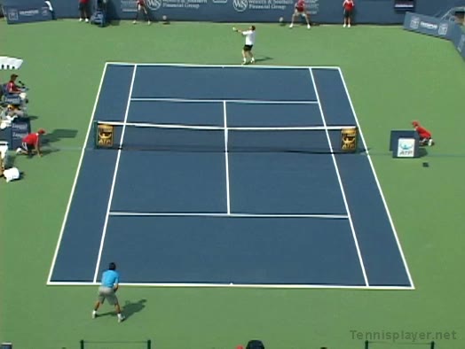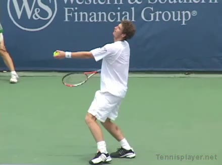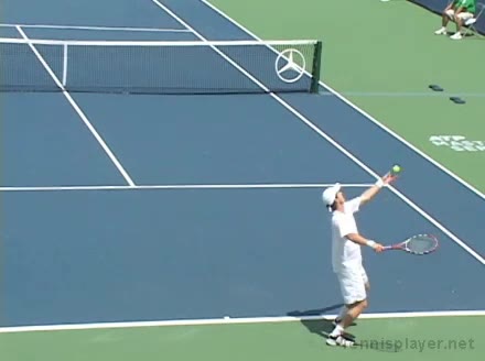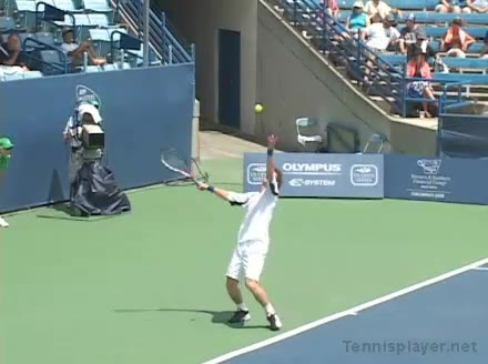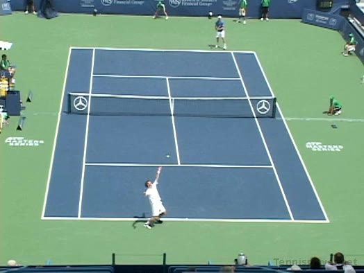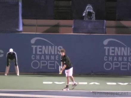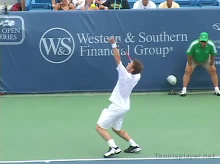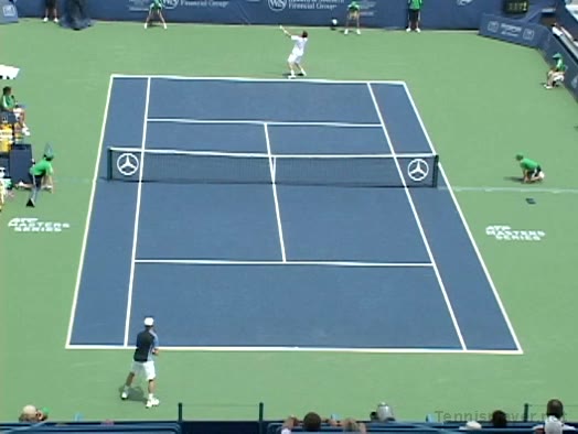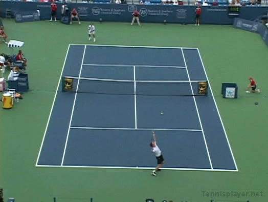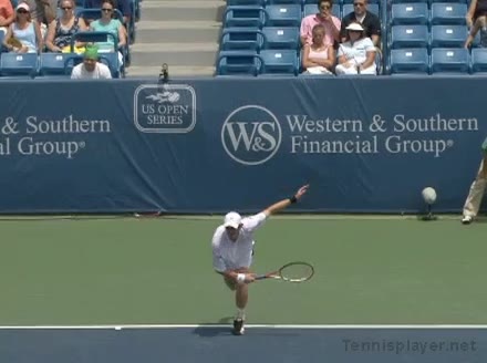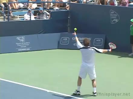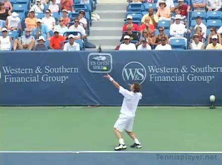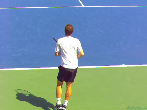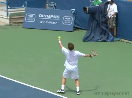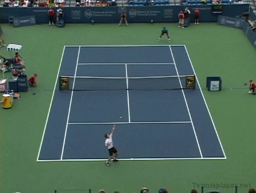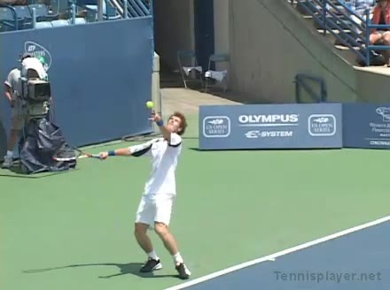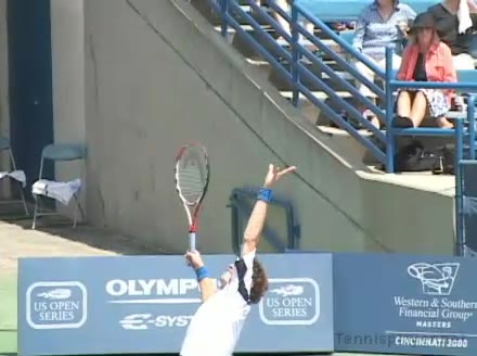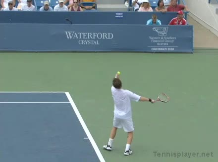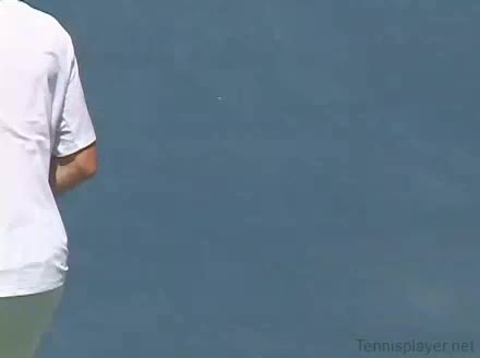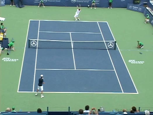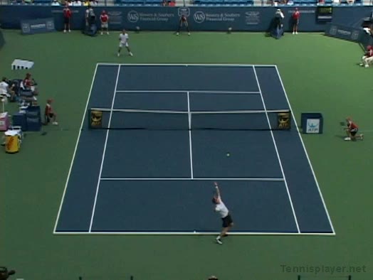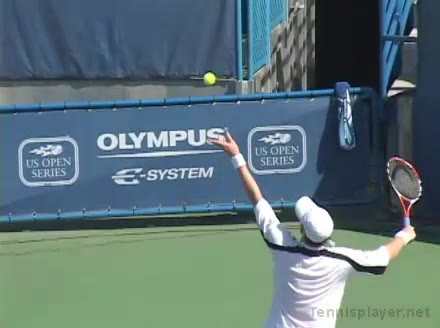 Andy Murray's serve from the center position, filmed from a front angle. His shoulders and trunk are clearly seen coiling away from the target before uncoiling in sequence, with the torso rotation leading the arm swing into contact.