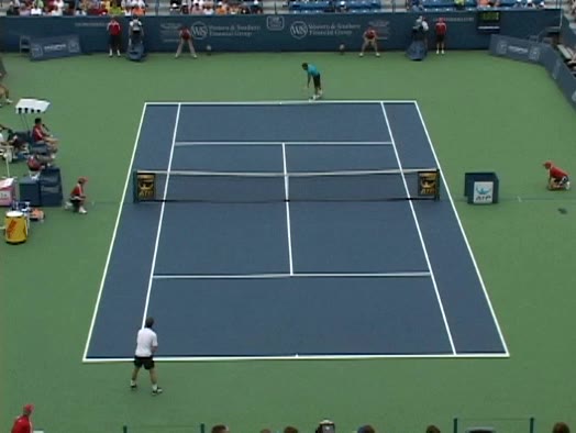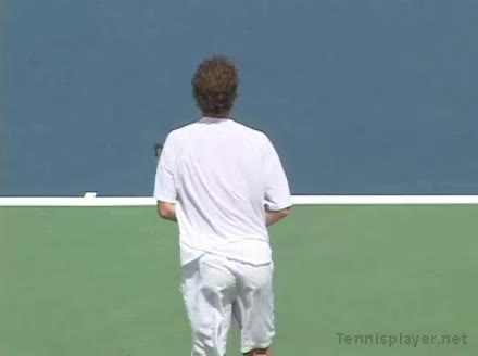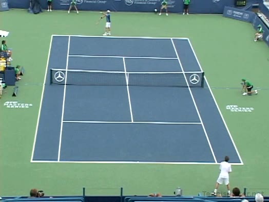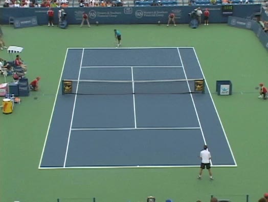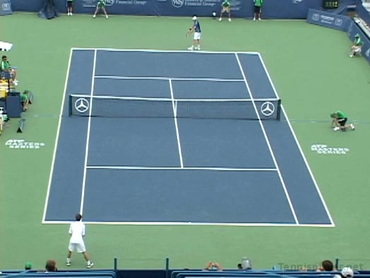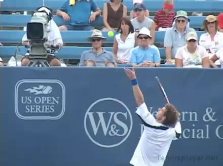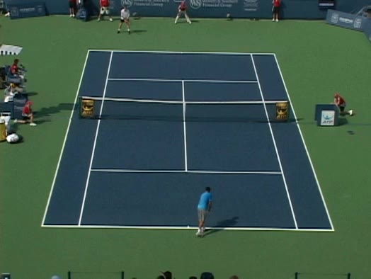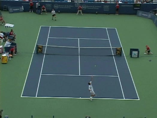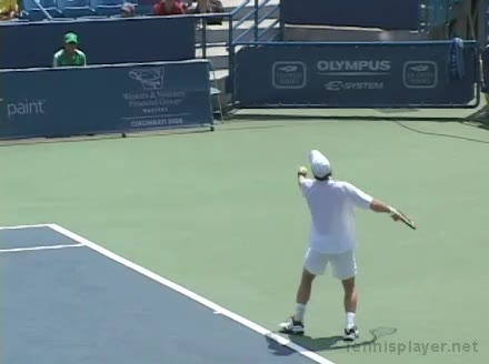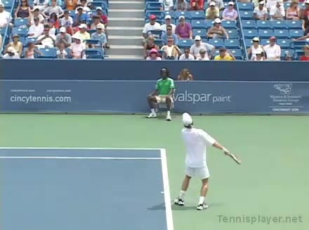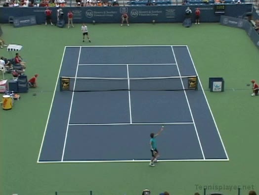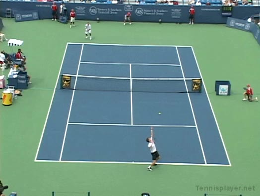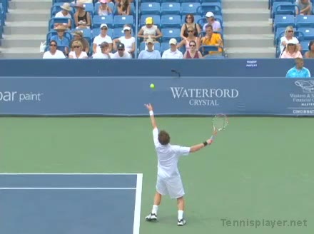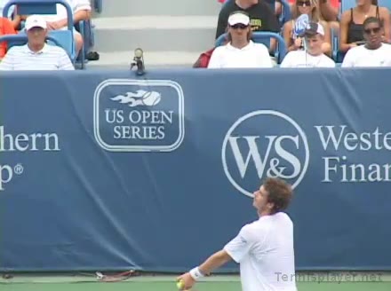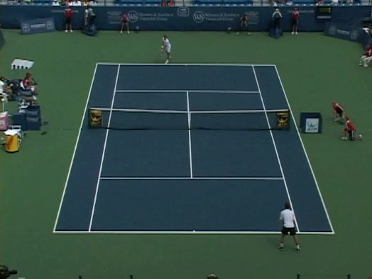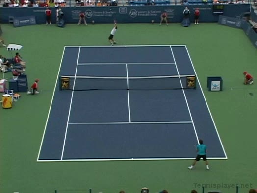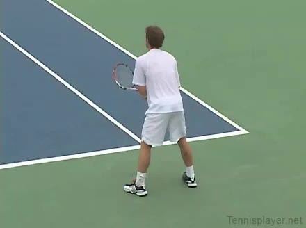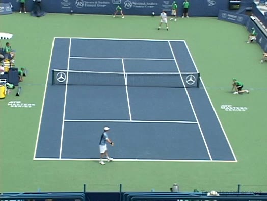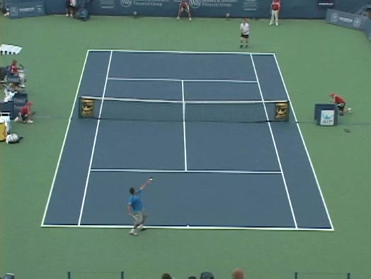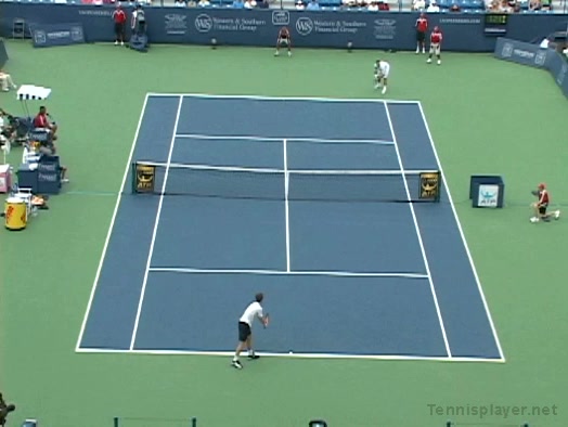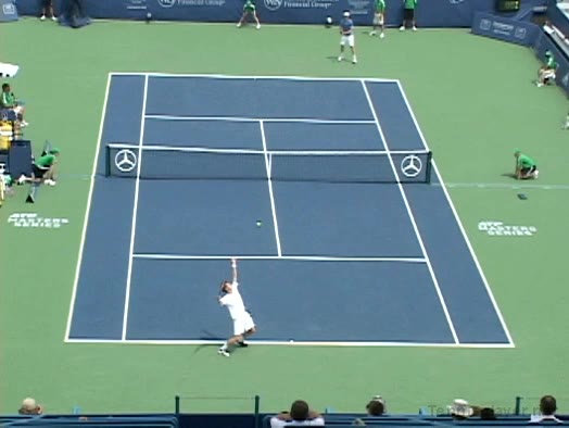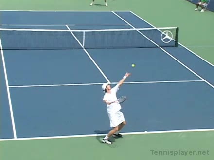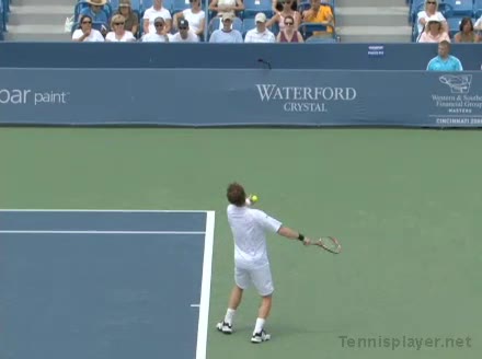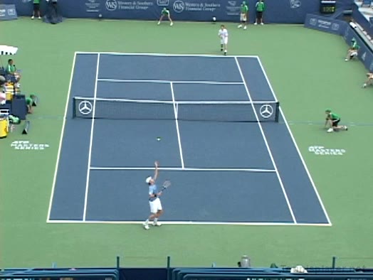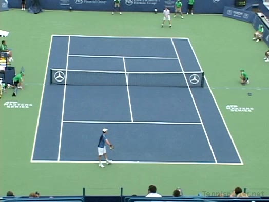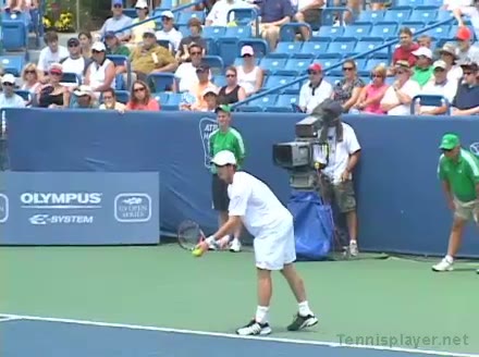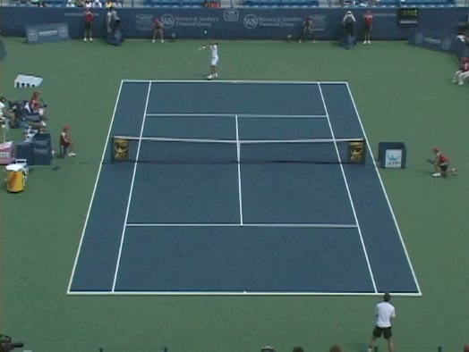 Andy Murray's serve from the center position, filmed from a front angle. His shoulders and trunk are clearly seen coiling away from the target before uncoiling in sequence, with the torso rotation leading the arm swing into contact.