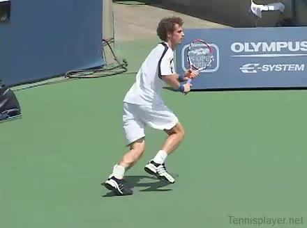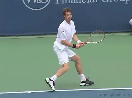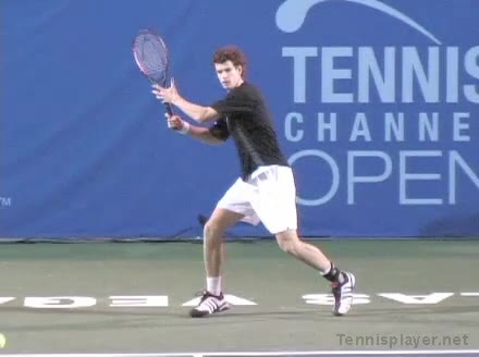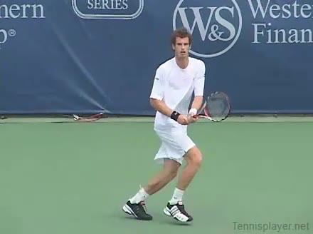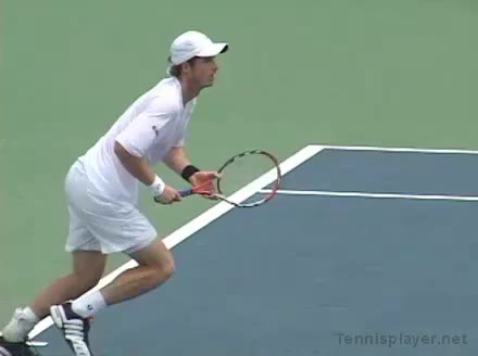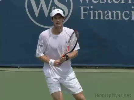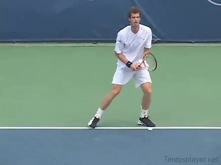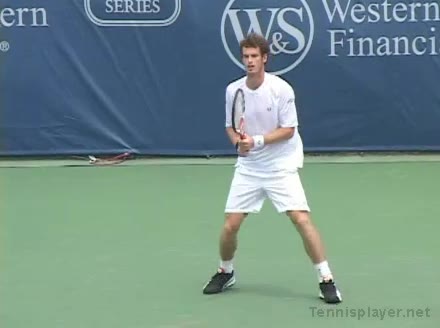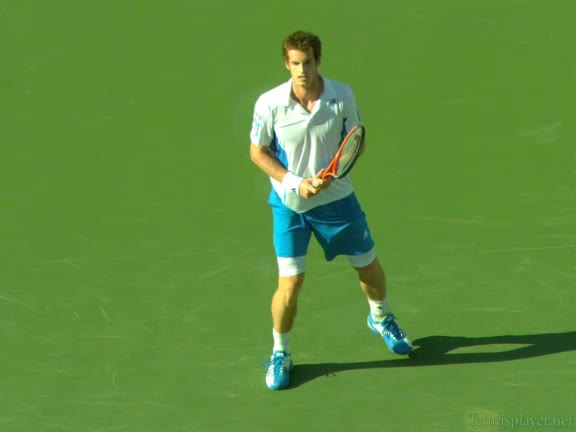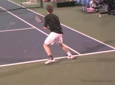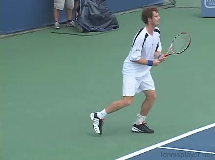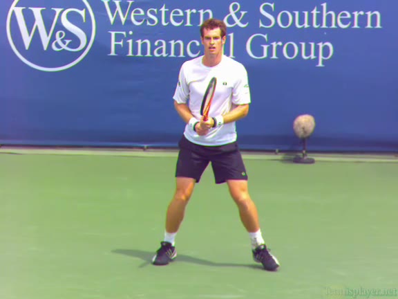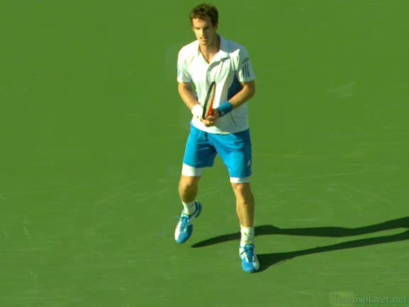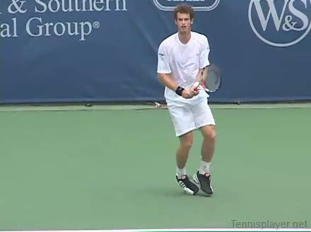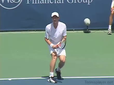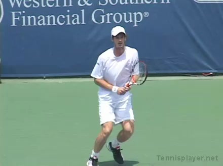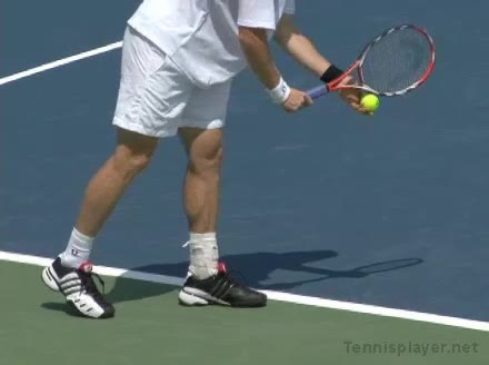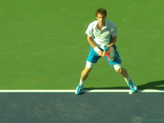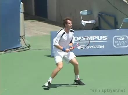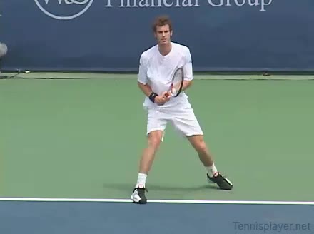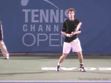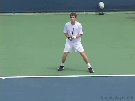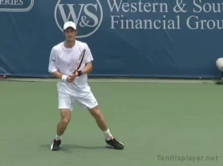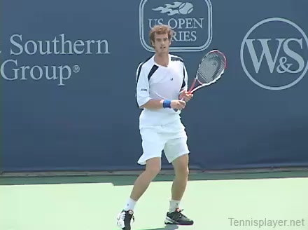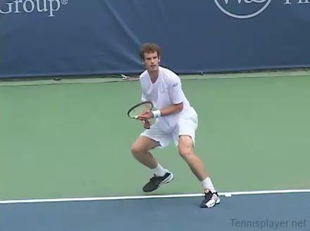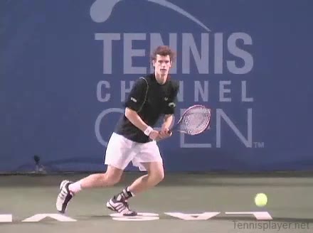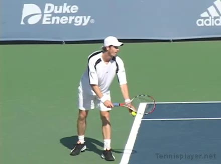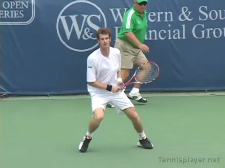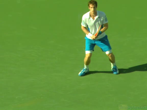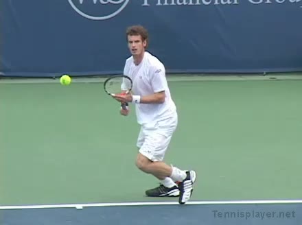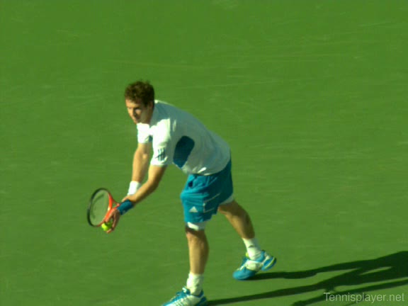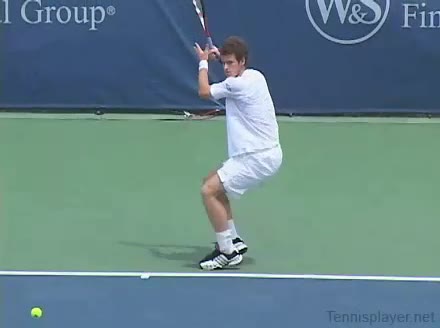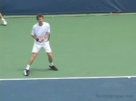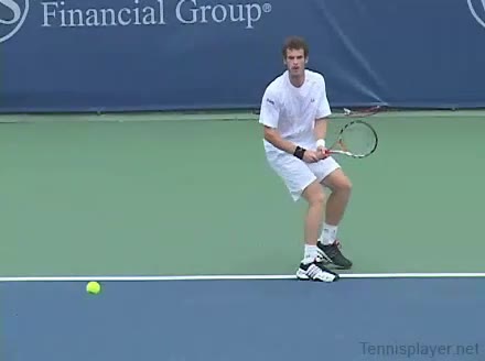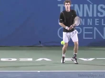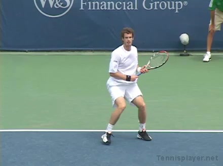 Andy Murray's forehand approach shot followed by a forehand half volley from the front. His semi-western forehand grip is maintained into the half volley, with a stable wrist and minimal wrist snap to soften the ball at contact.