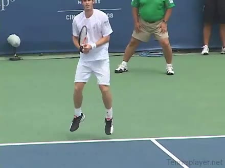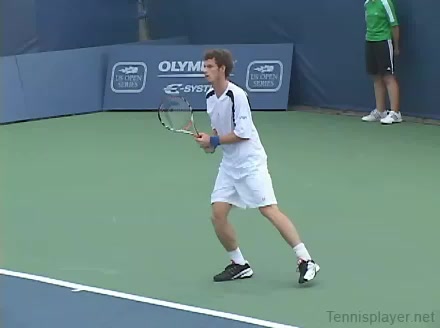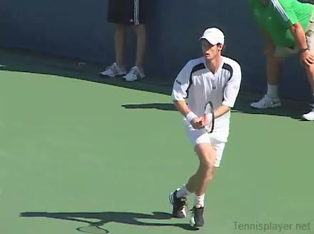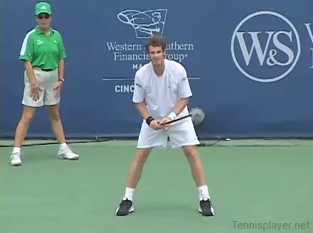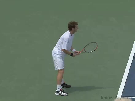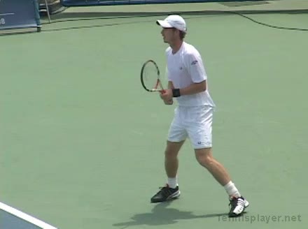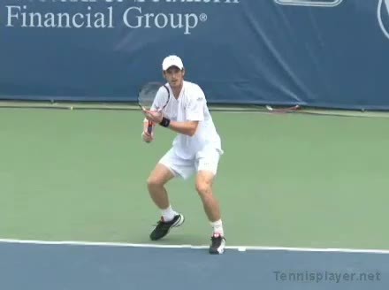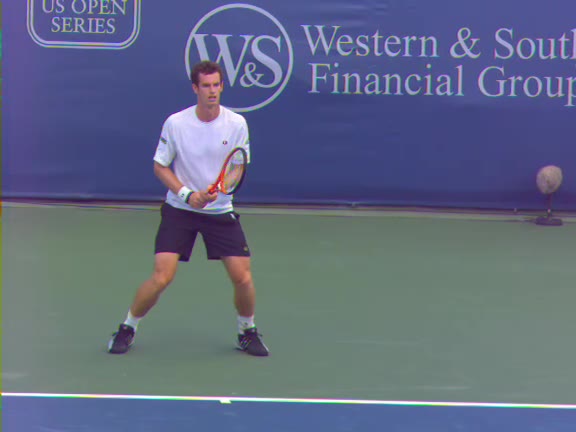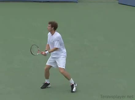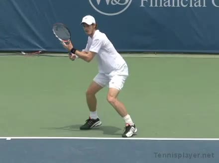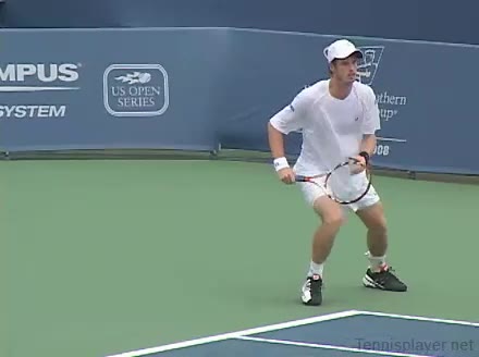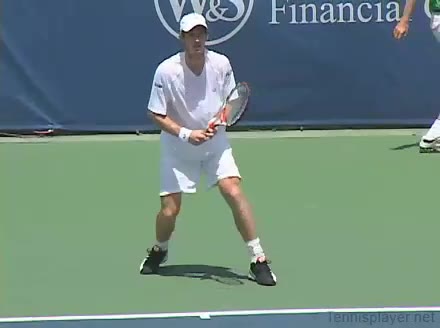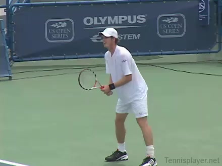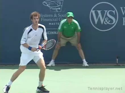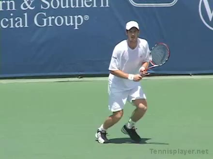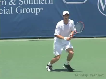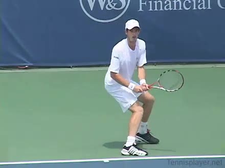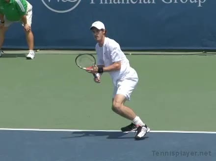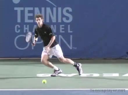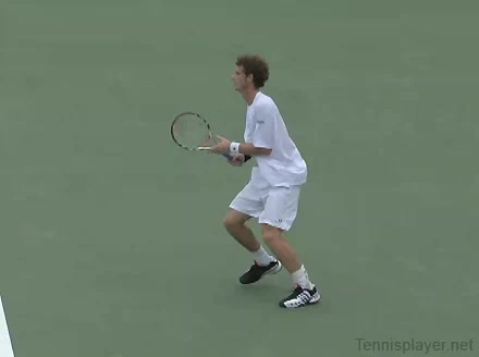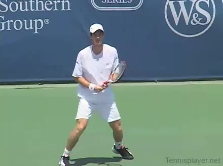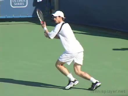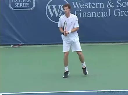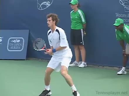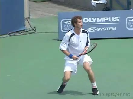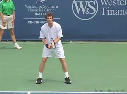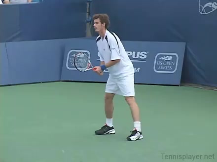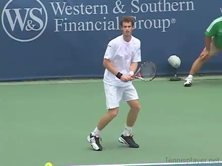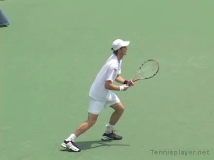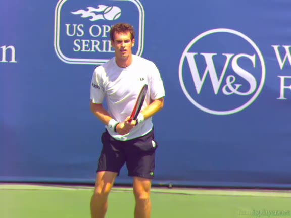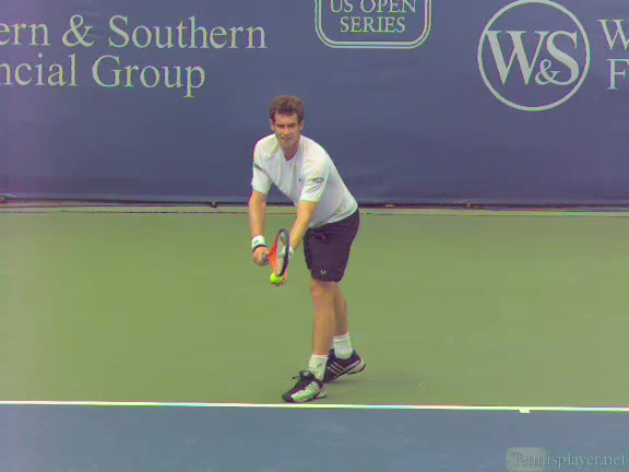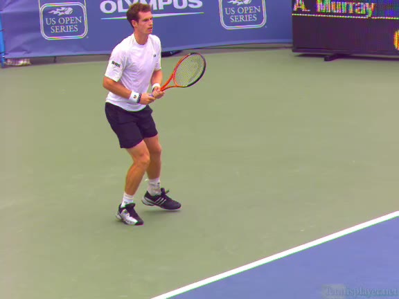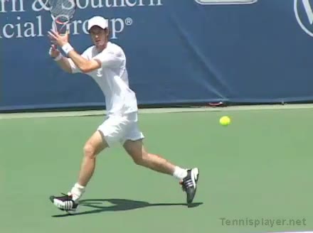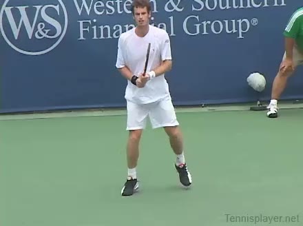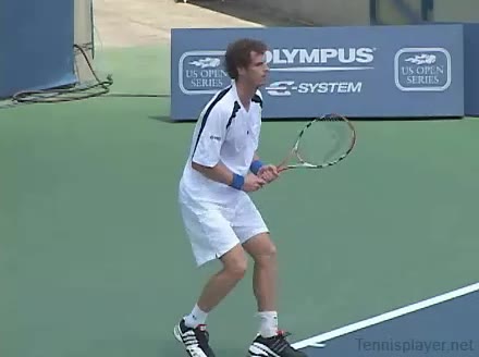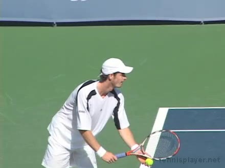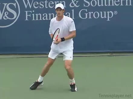 Andy Murray's forehand approach shot followed by a forehand half volley from the front. His semi-western forehand grip is maintained into the half volley, with a stable wrist and minimal wrist snap to soften the ball at contact.