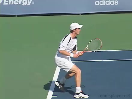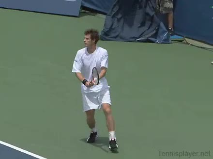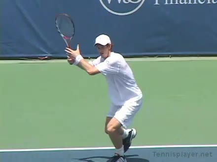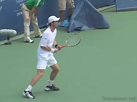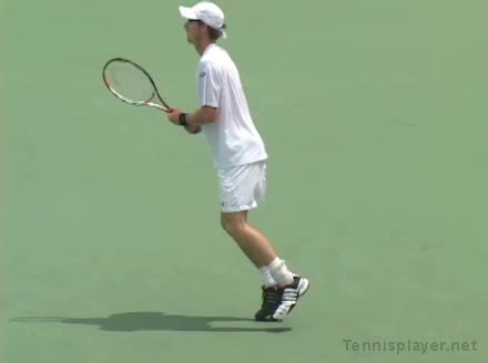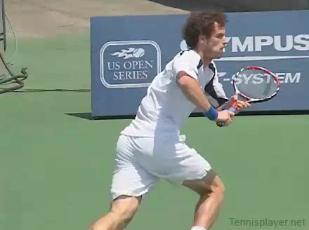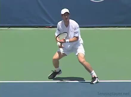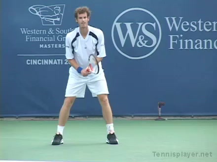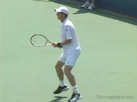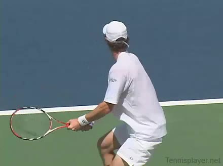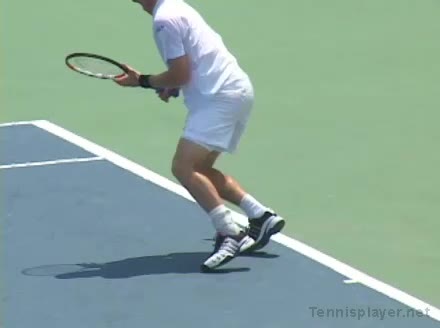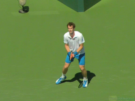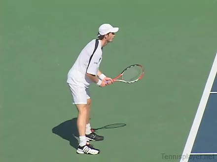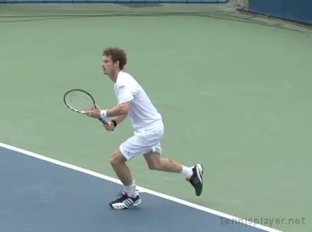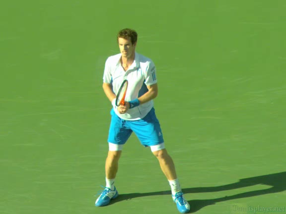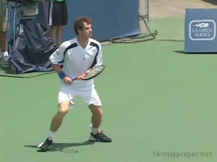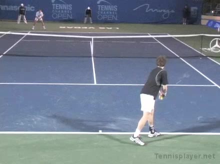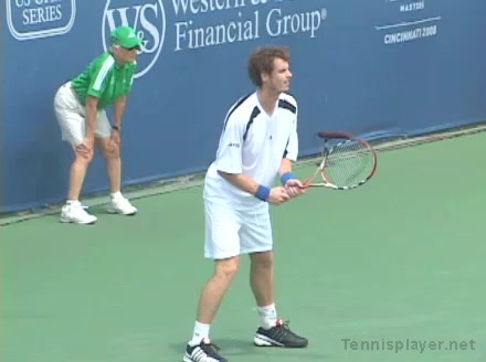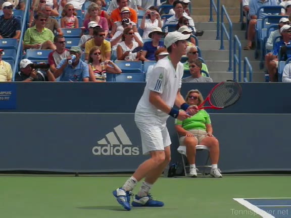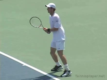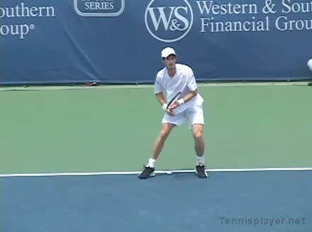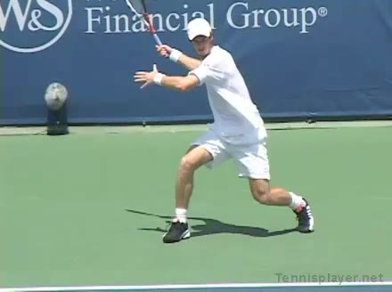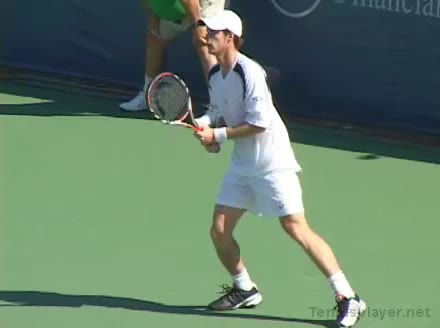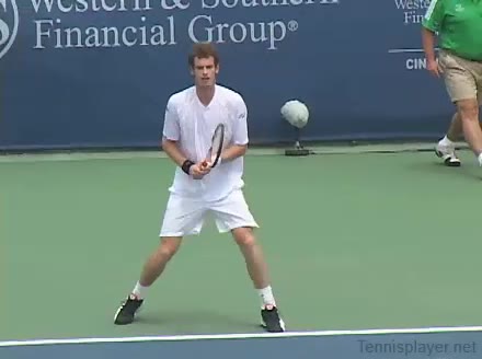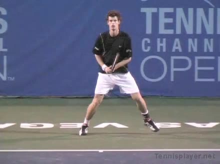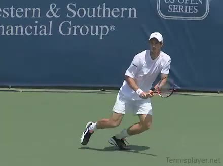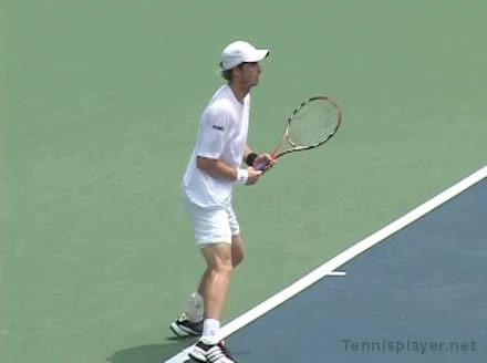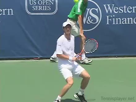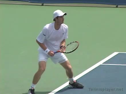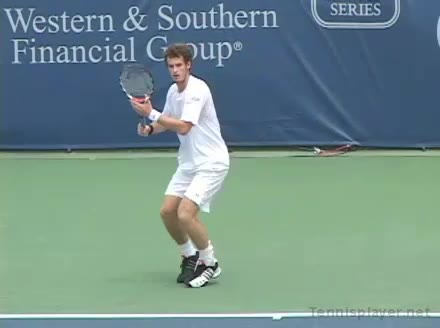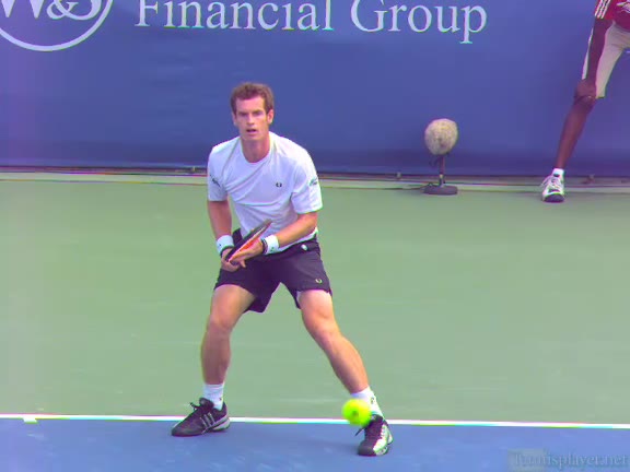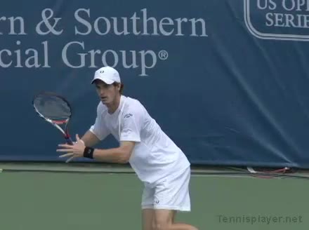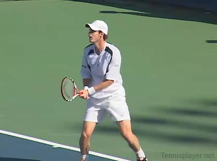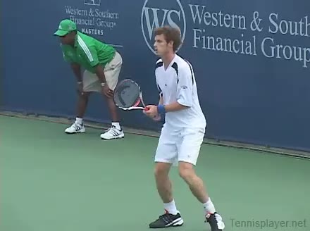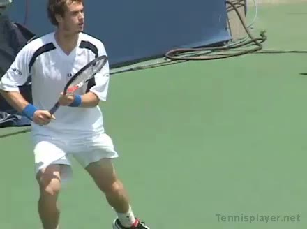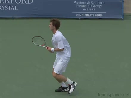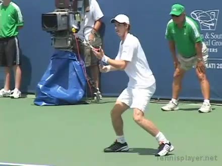 Andy Murray's forehand approach shot followed by a forehand half volley from the front. His semi-western forehand grip is maintained into the half volley, with a stable wrist and minimal wrist snap to soften the ball at contact.