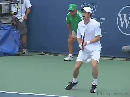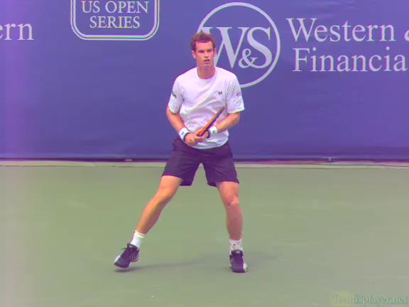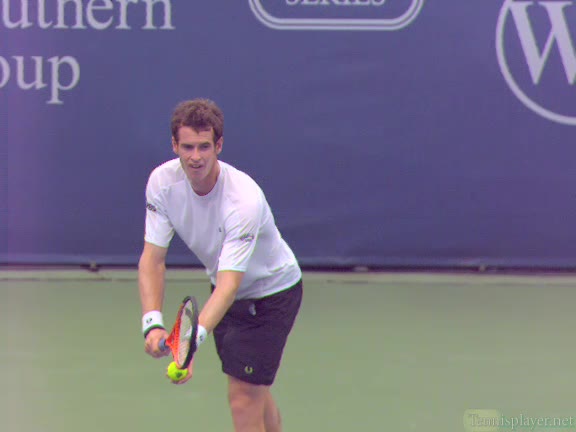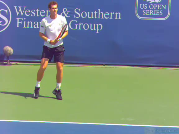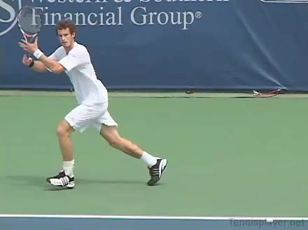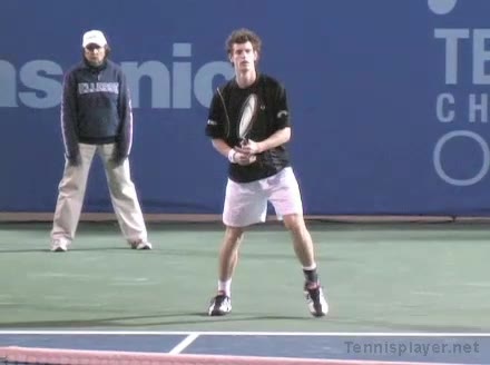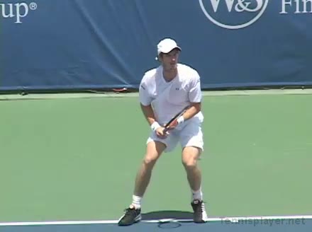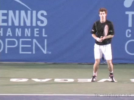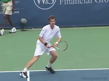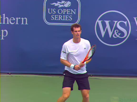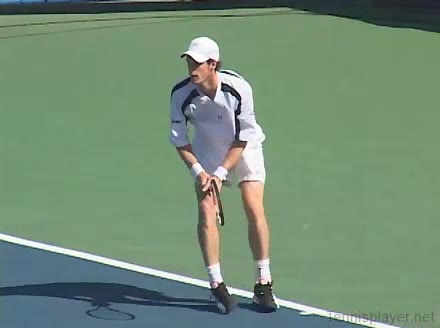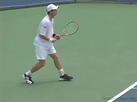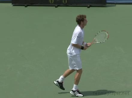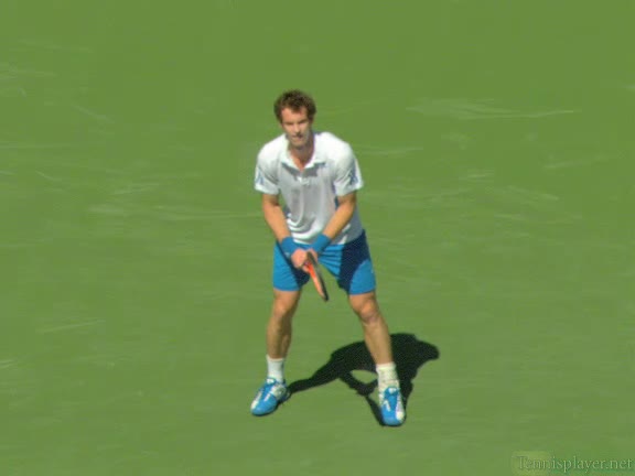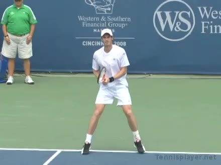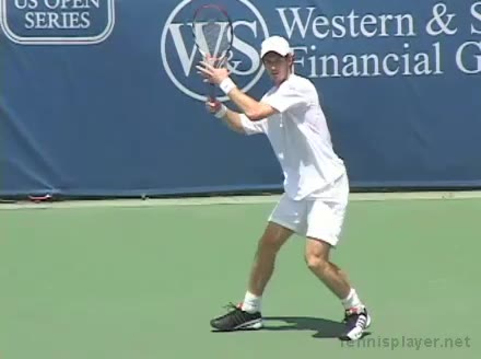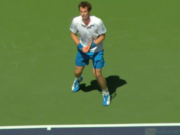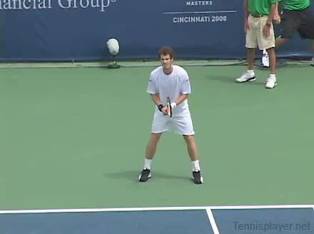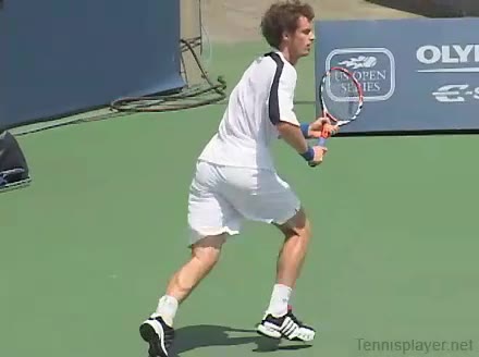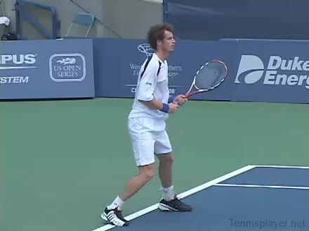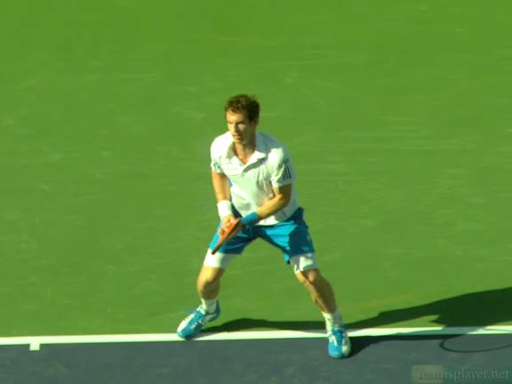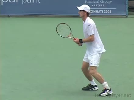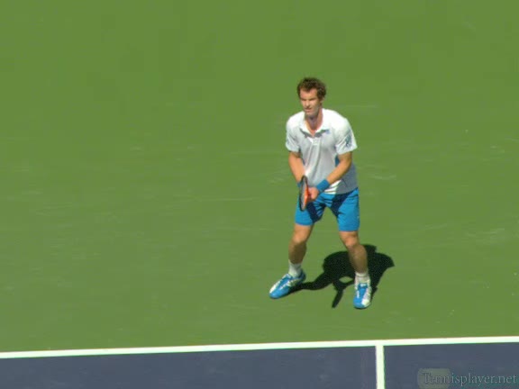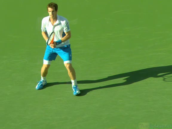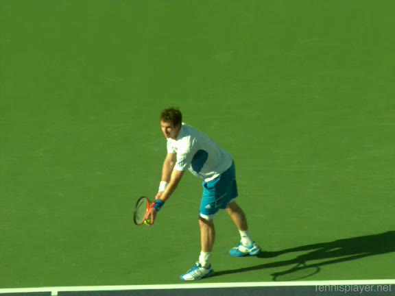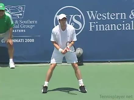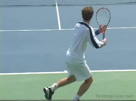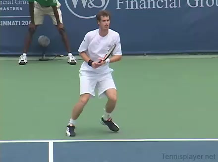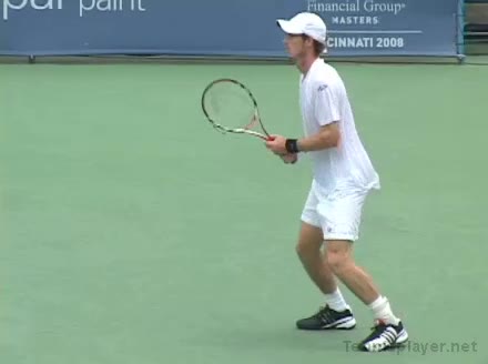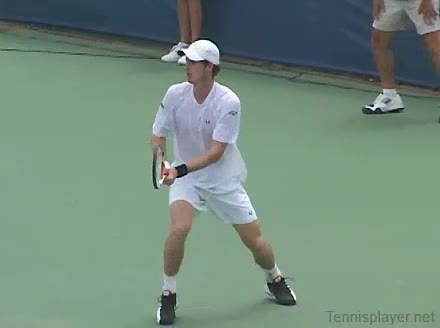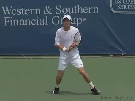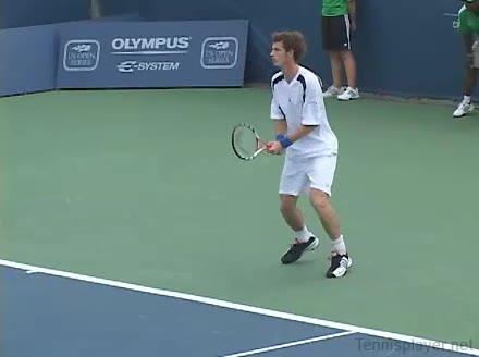 Andy Murray's forehand approach shot followed by a forehand half volley from the front. His semi-western forehand grip is maintained into the half volley, with a stable wrist and minimal wrist snap to soften the ball at contact.