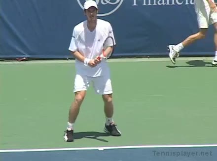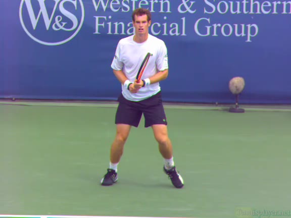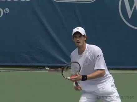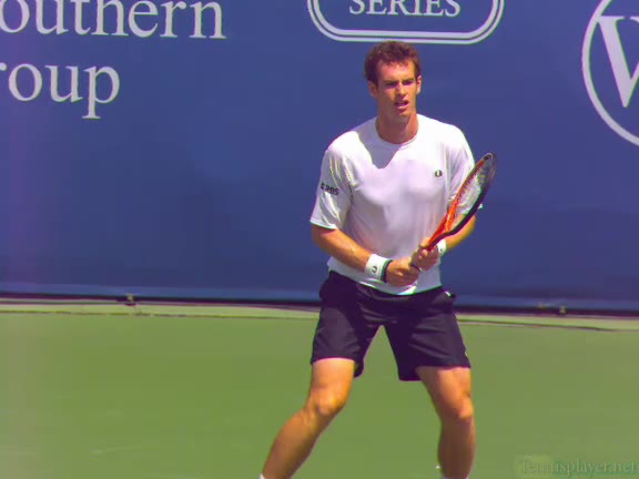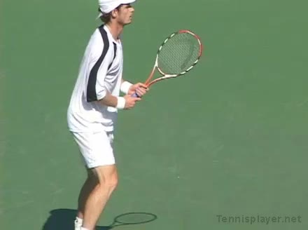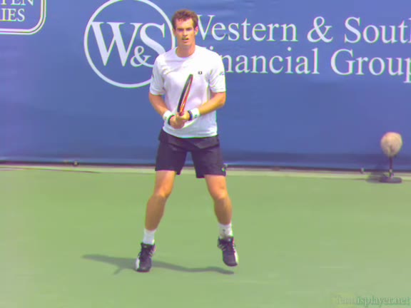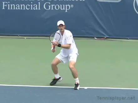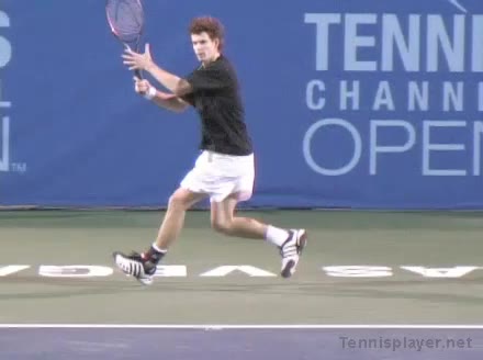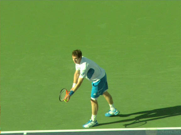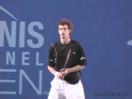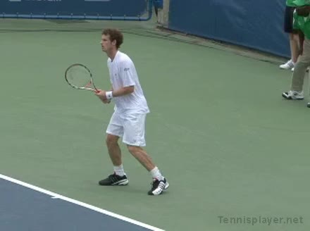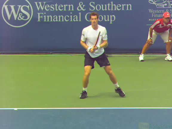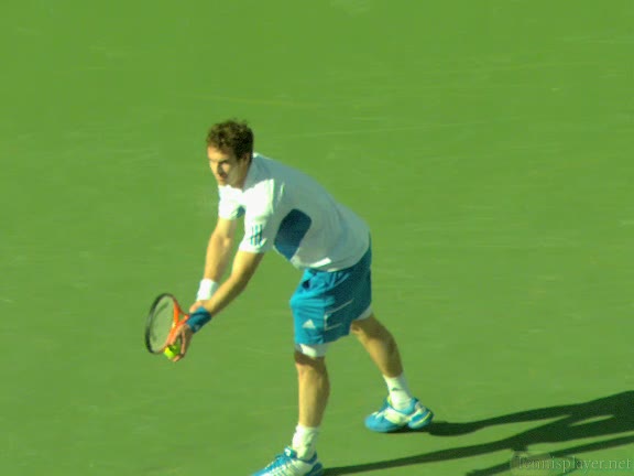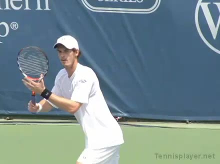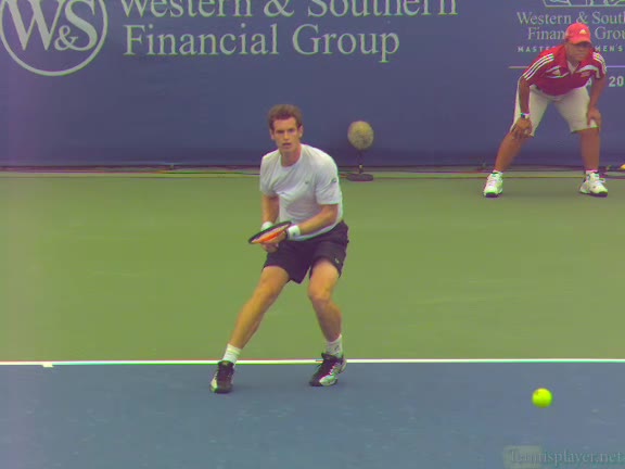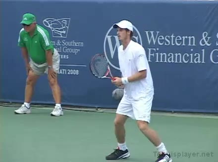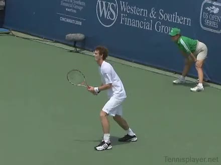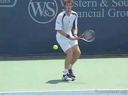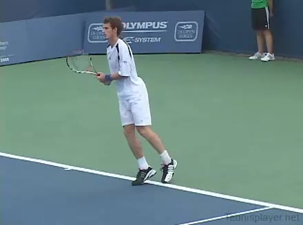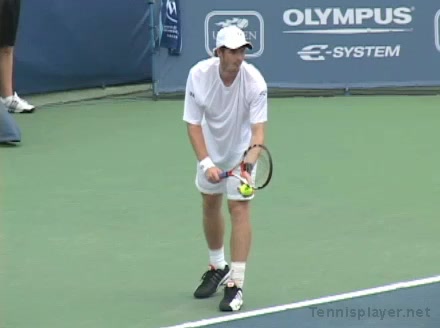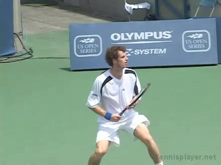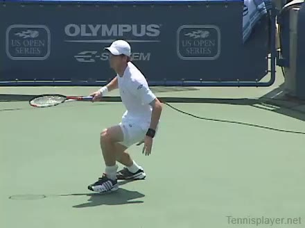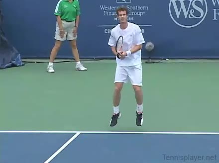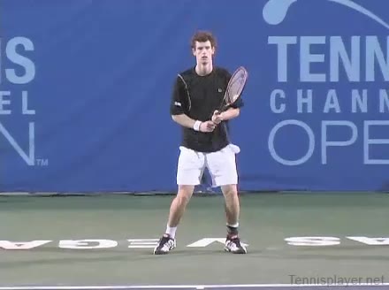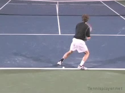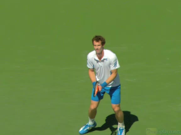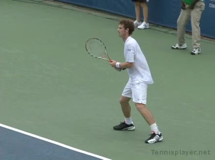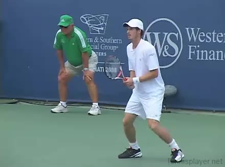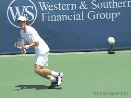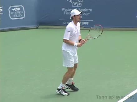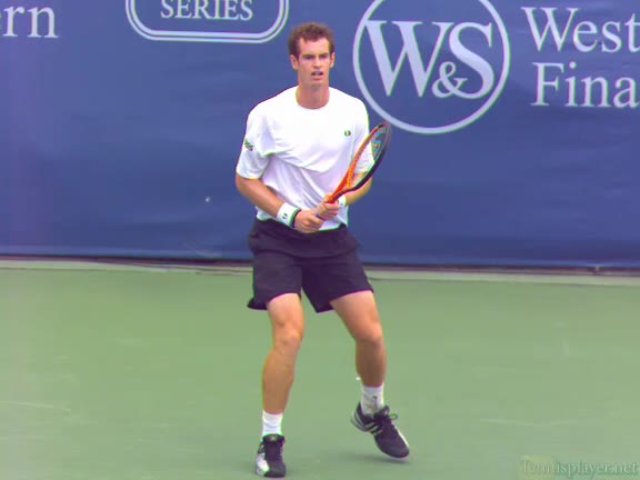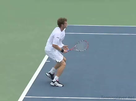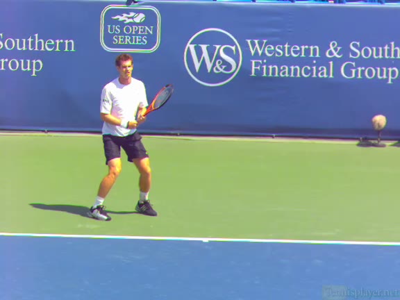 Andy Murray's forehand approach shot followed by a forehand half volley from the front. His semi-western forehand grip is maintained into the half volley, with a stable wrist and minimal wrist snap to soften the ball at contact.