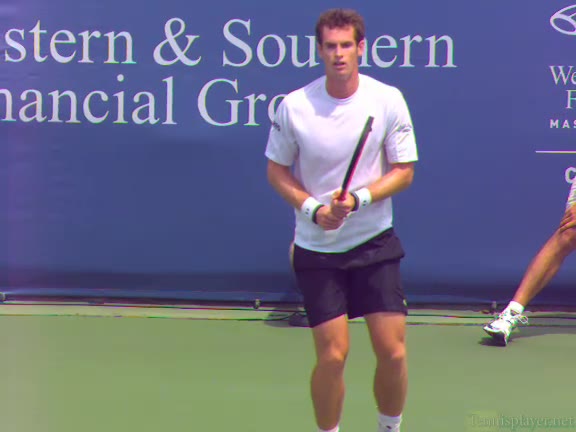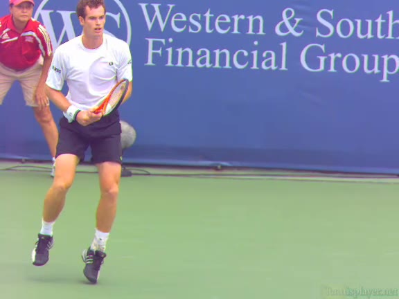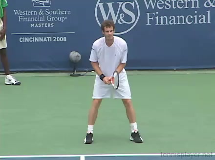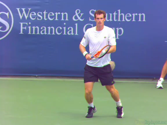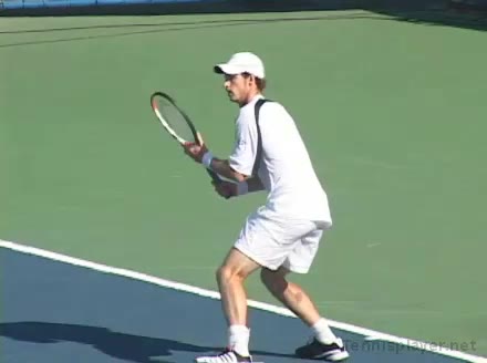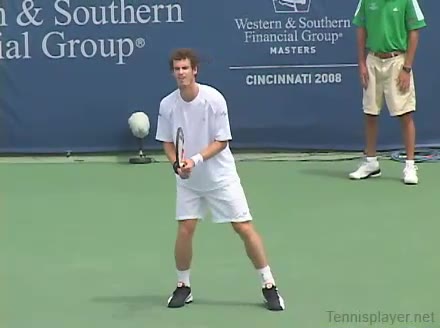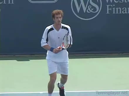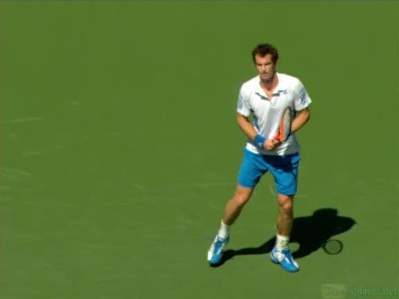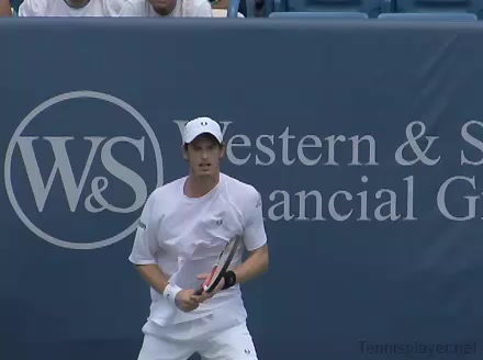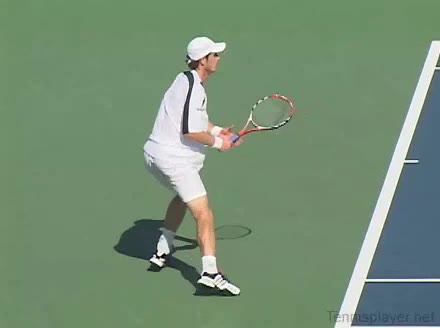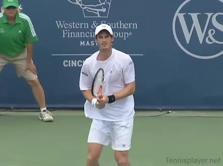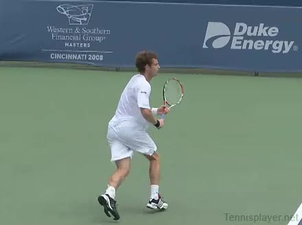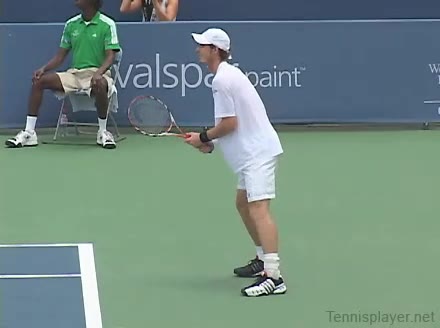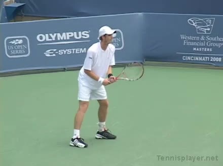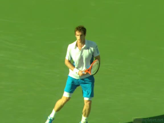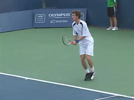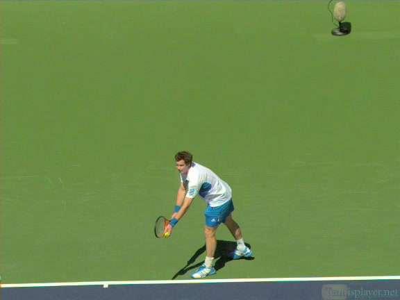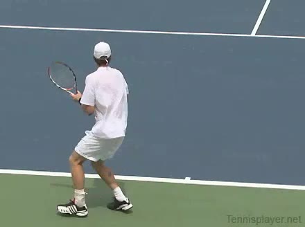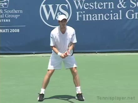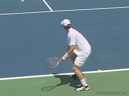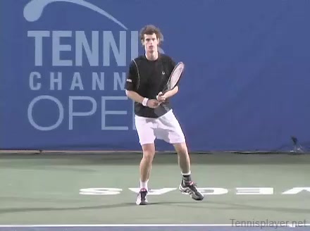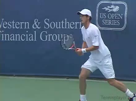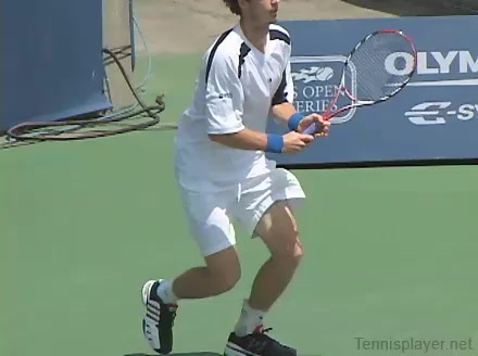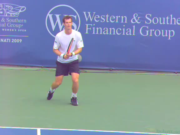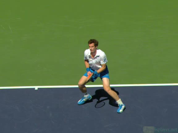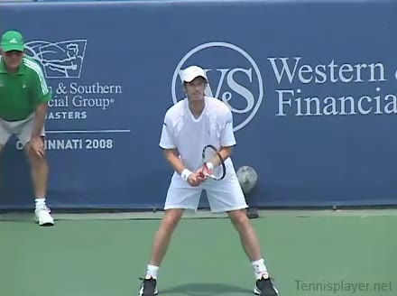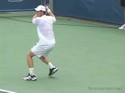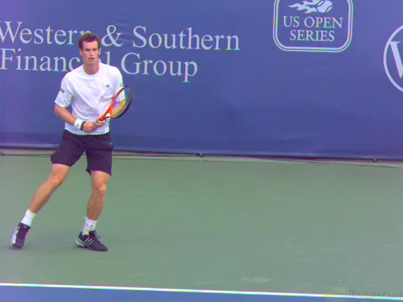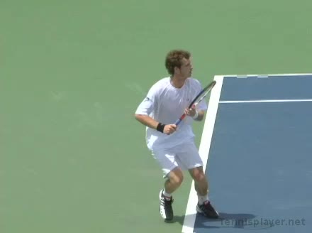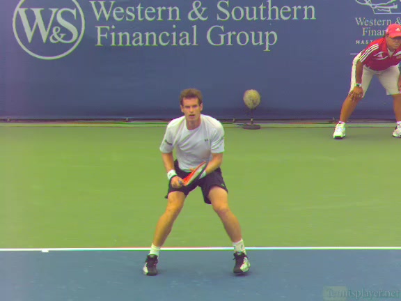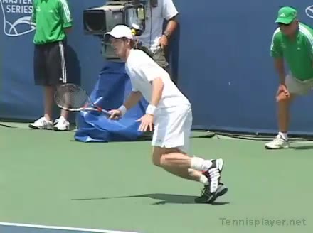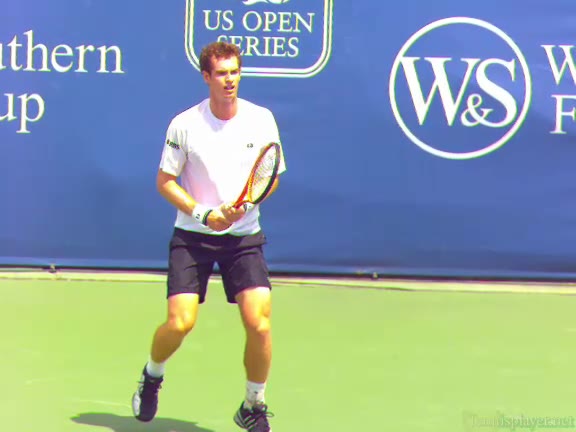 Andy Murray's forehand approach shot followed by a forehand half volley from the front. His semi-western forehand grip is maintained into the half volley, with a stable wrist and minimal wrist snap to soften the ball at contact.