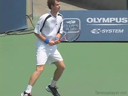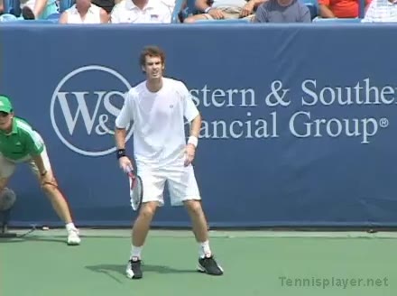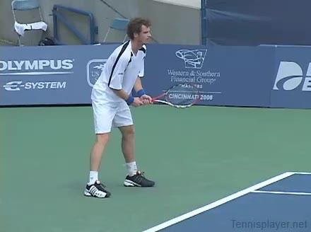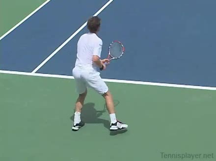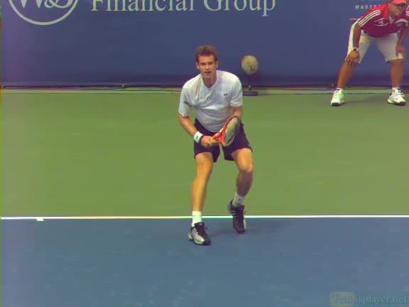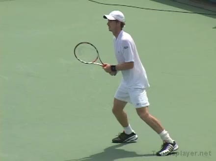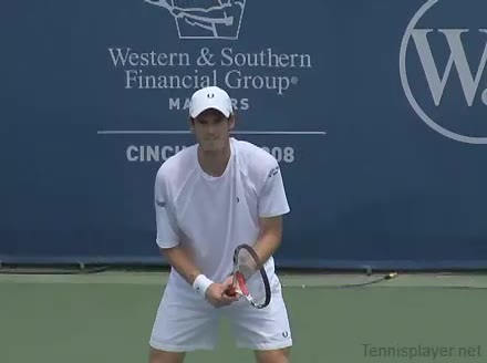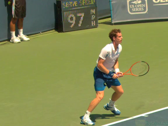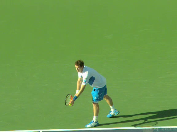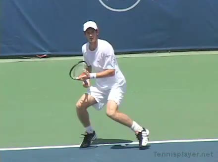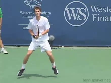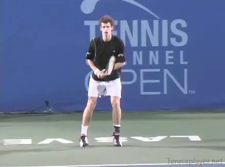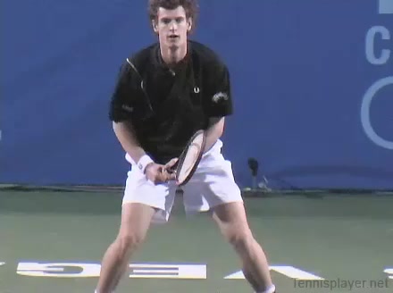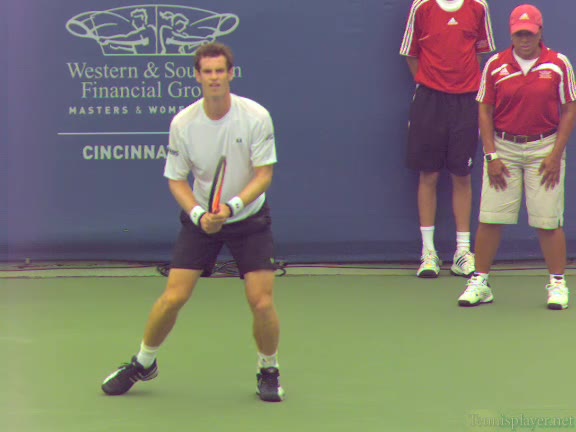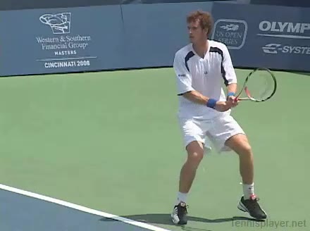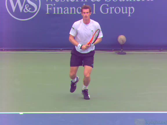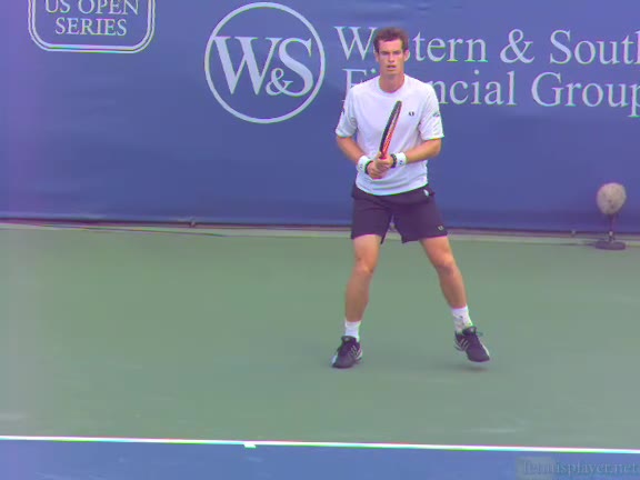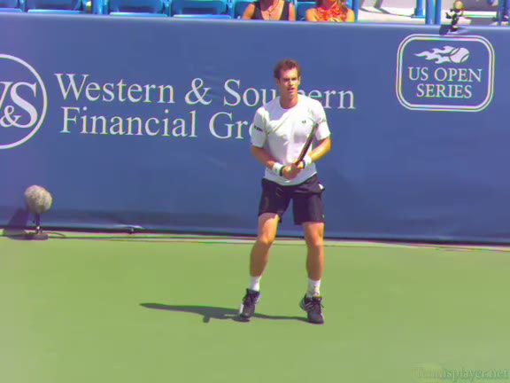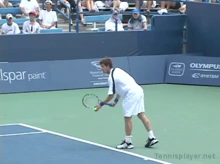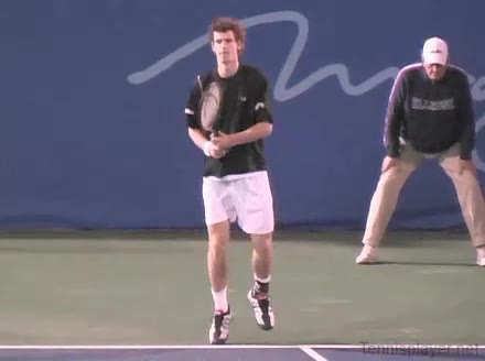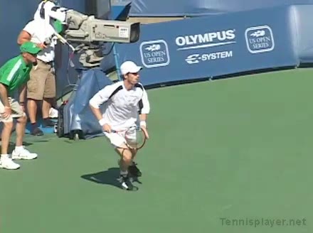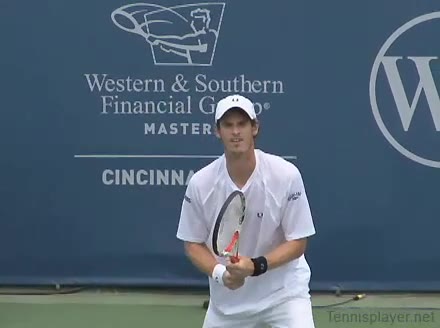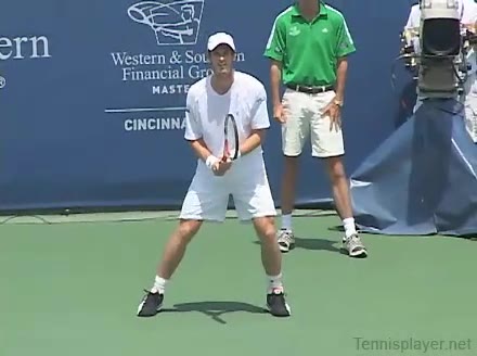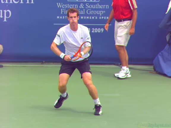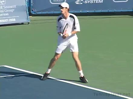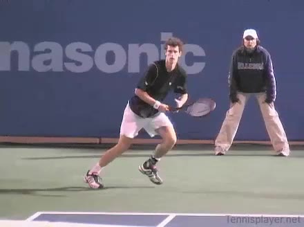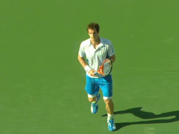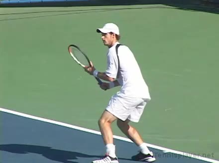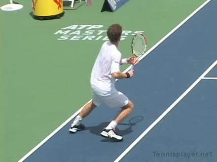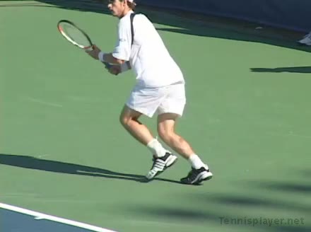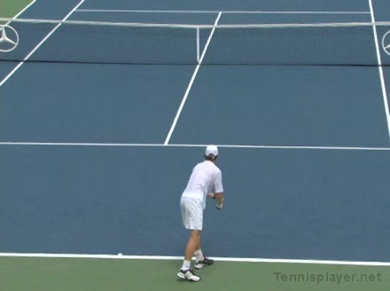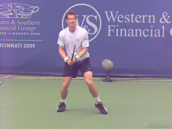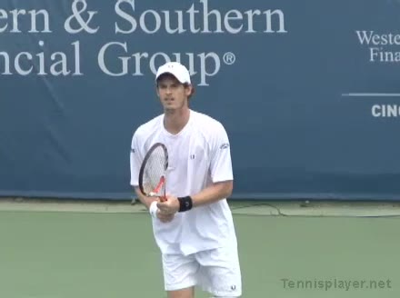 Andy Murray's forehand approach shot followed by a forehand half volley from the front. His semi-western forehand grip is maintained into the half volley, with a stable wrist and minimal wrist snap to soften the ball at contact.