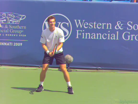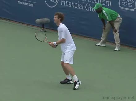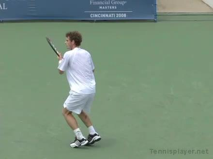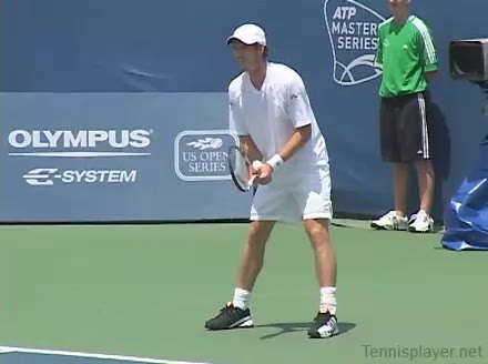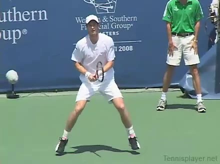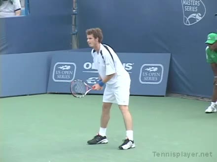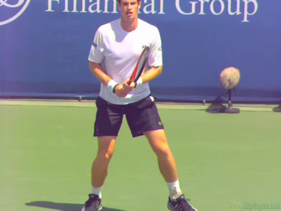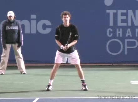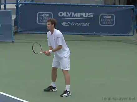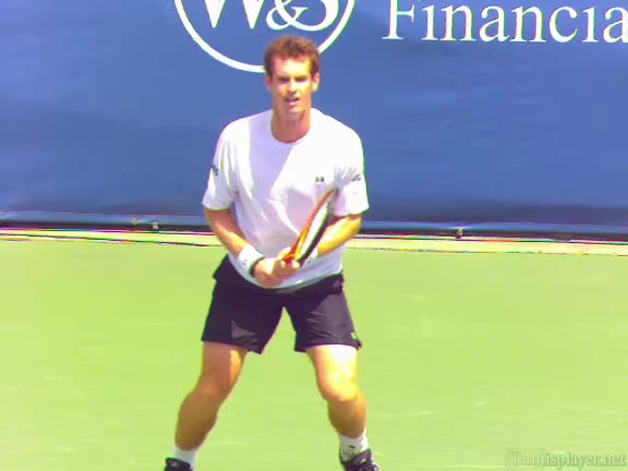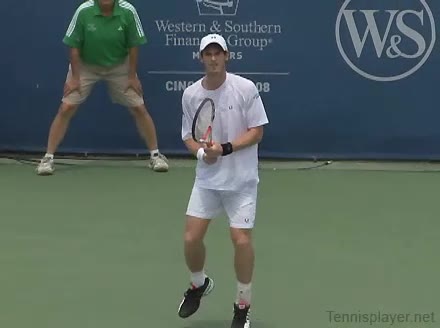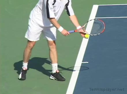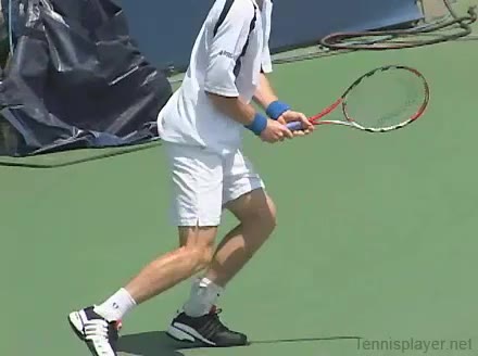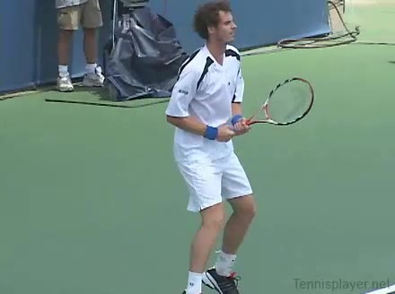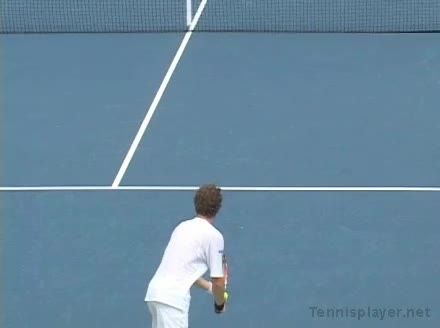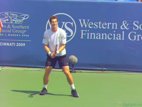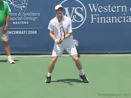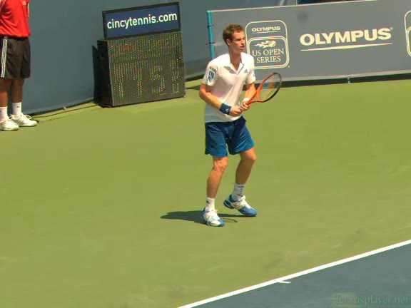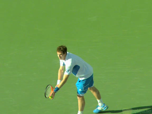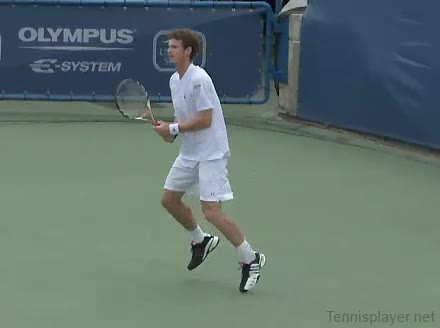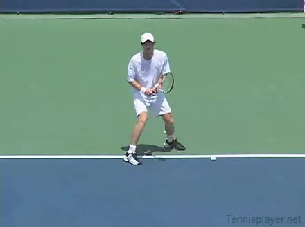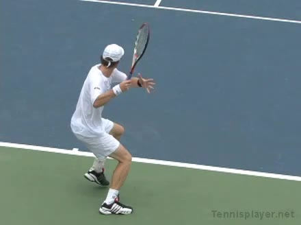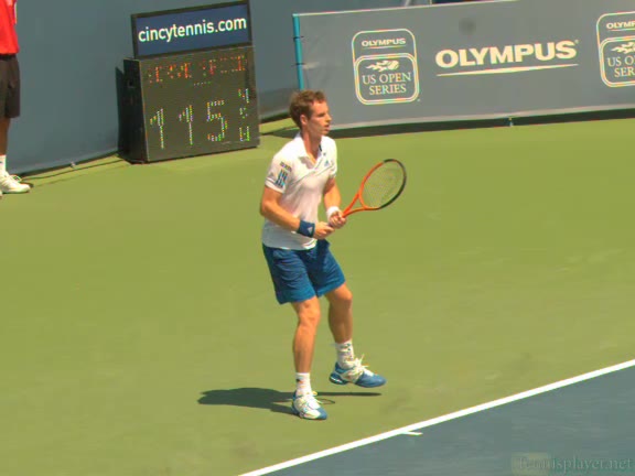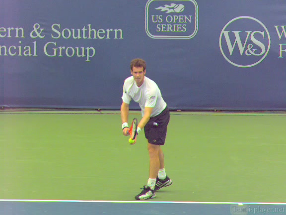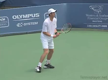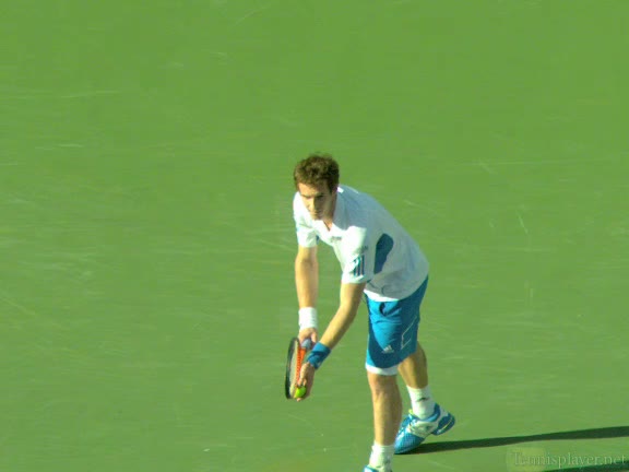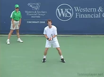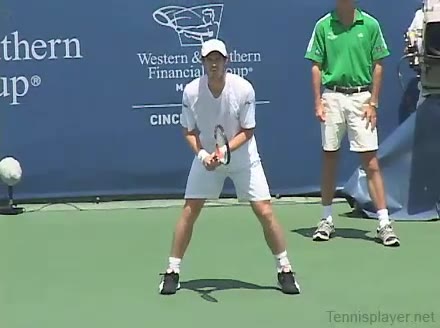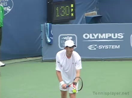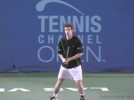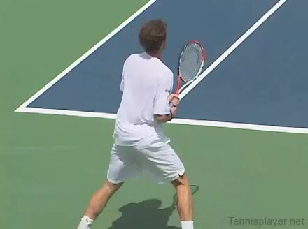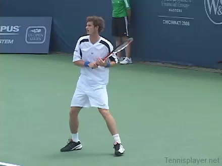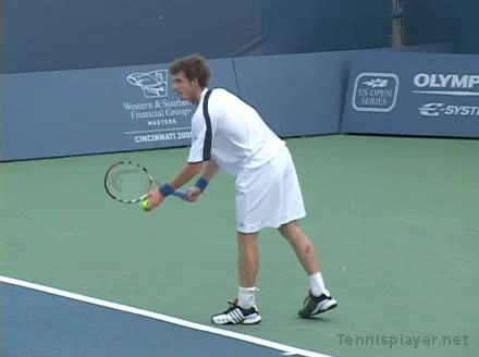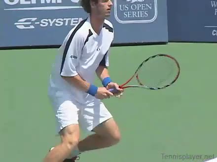Andy Murray's forehand approach shot followed by a forehand half volley from the front. His semi-western forehand grip is maintained into the half volley, with a stable wrist and minimal wrist snap to soften the ball at contact.