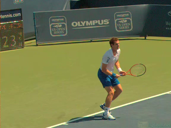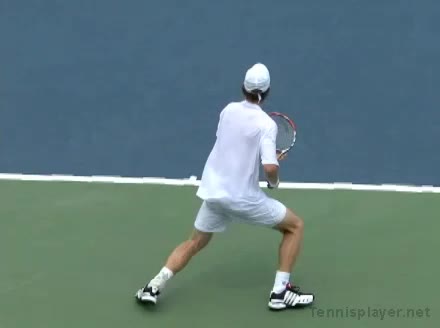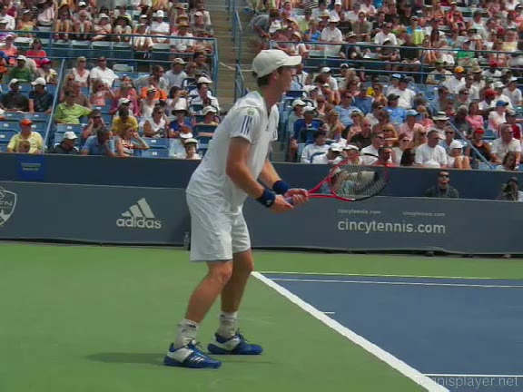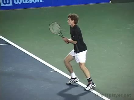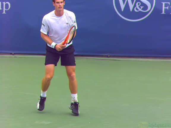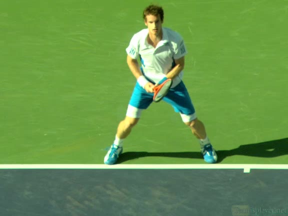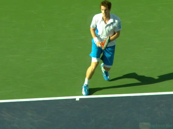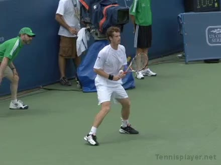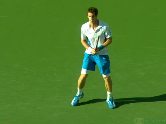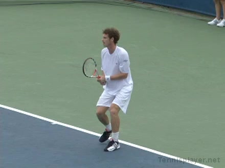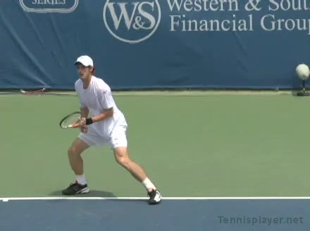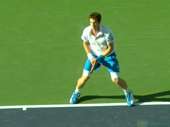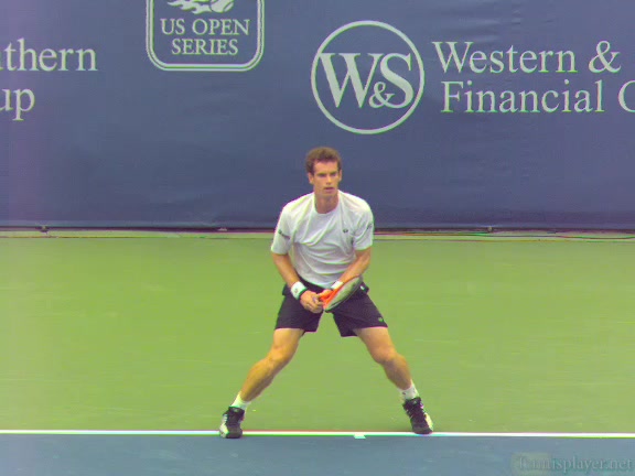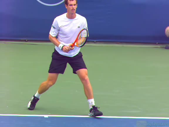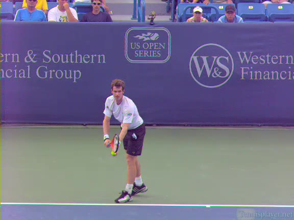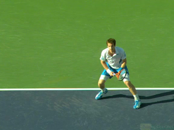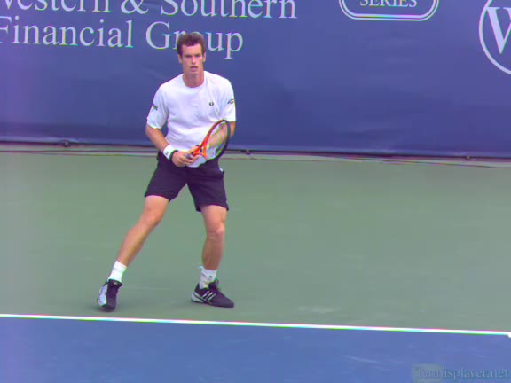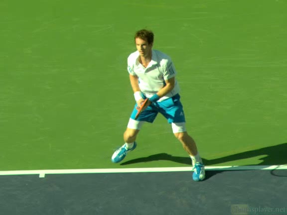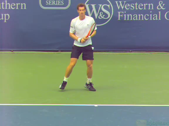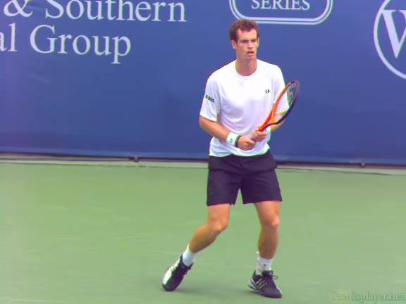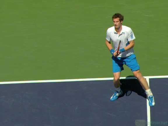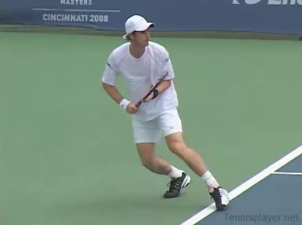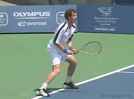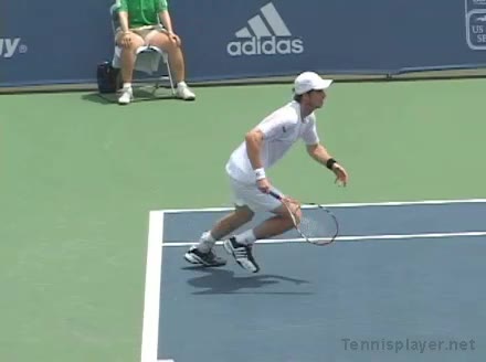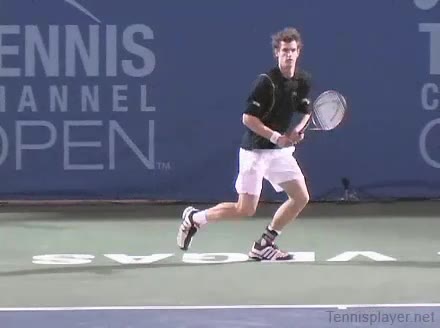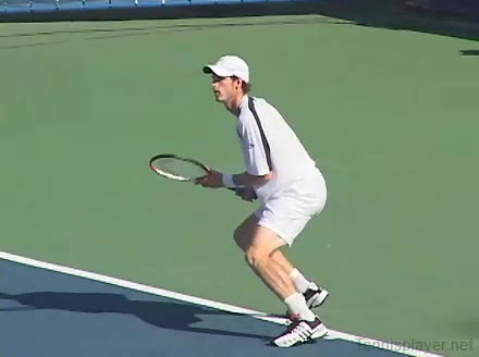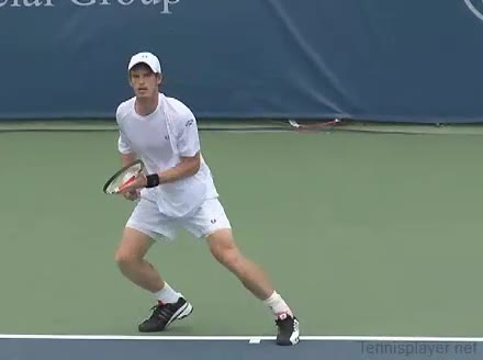 Andy Murray's forehand approach pattern from the ad court, filmed from a court-level angle. His hips stay relatively closed through the first forehand before driving more open on the approach, with a noticeable increase in knee bend and forward leg drive as he moves into the court.