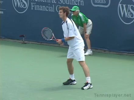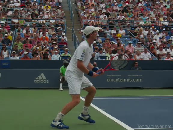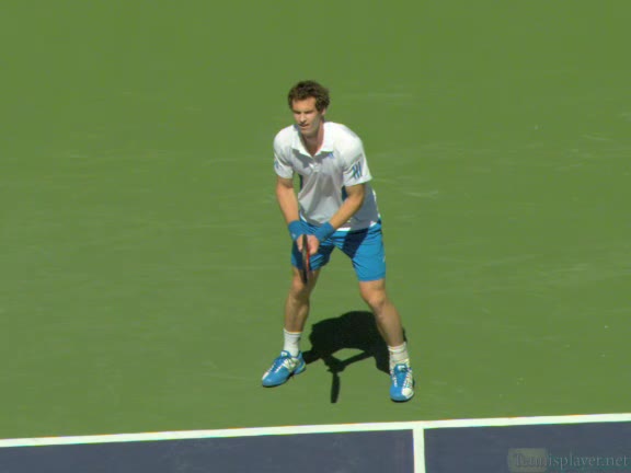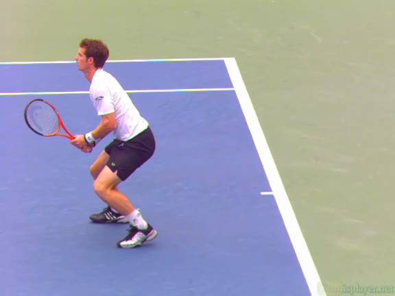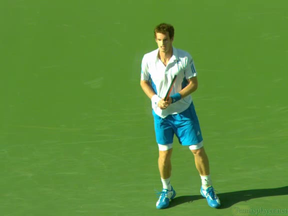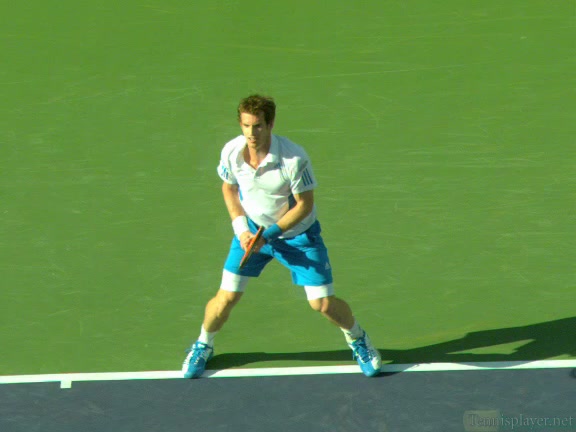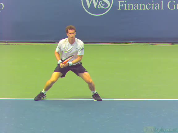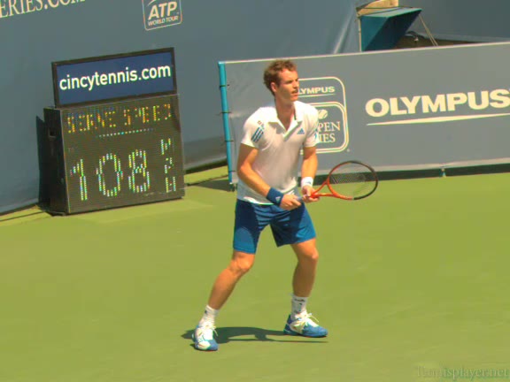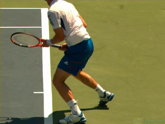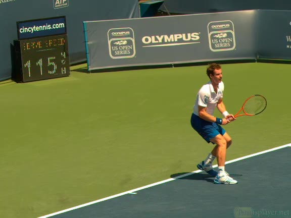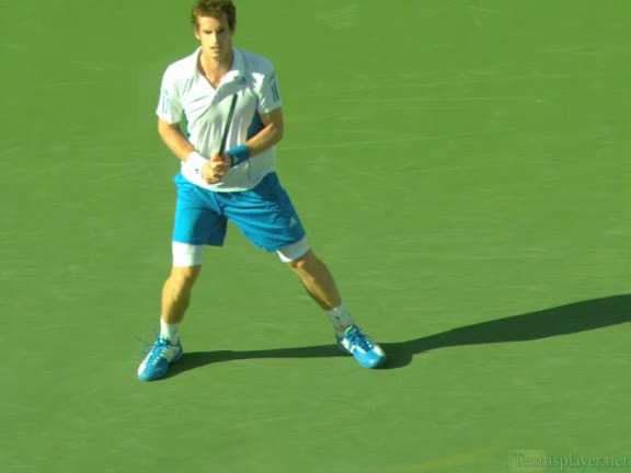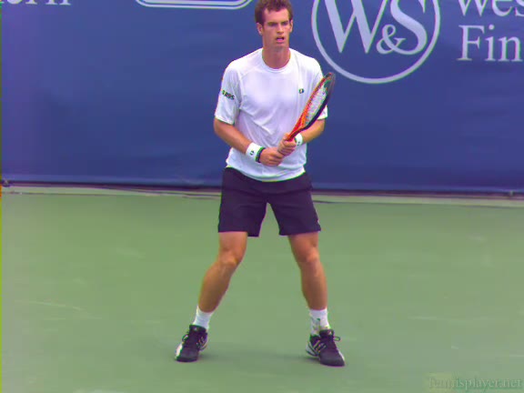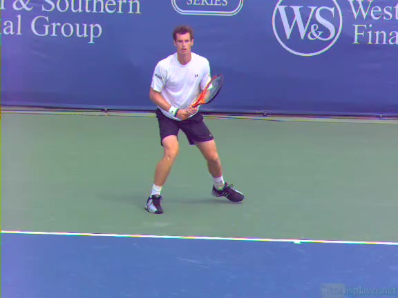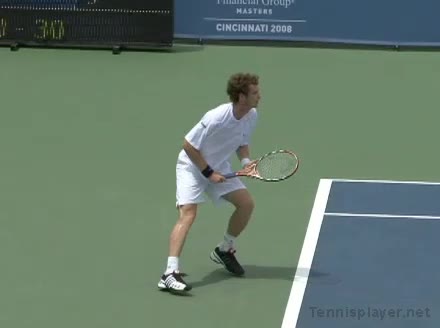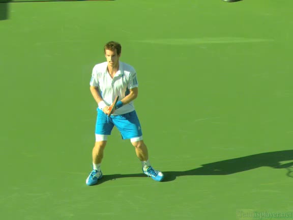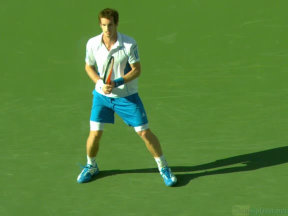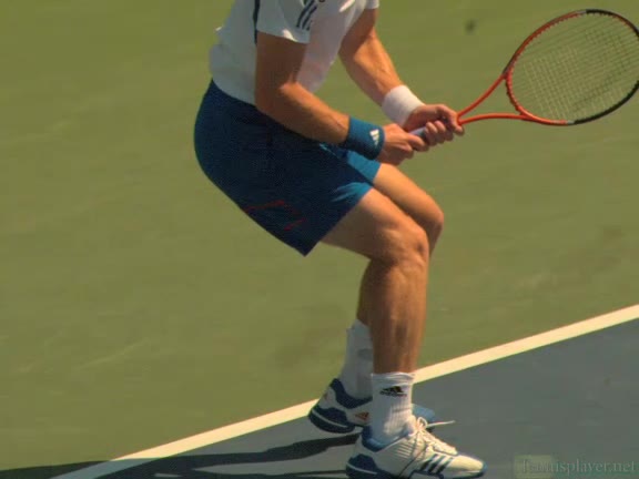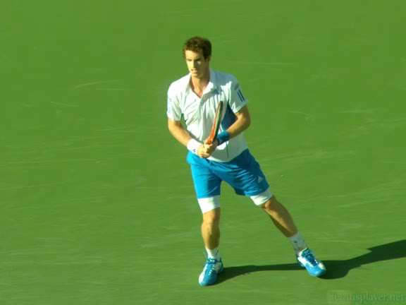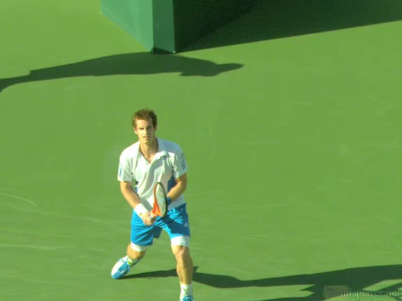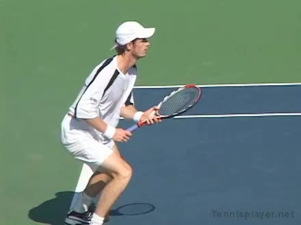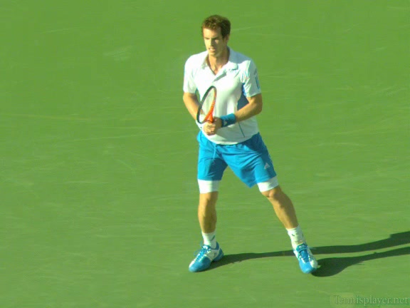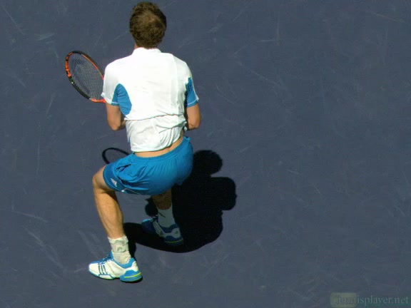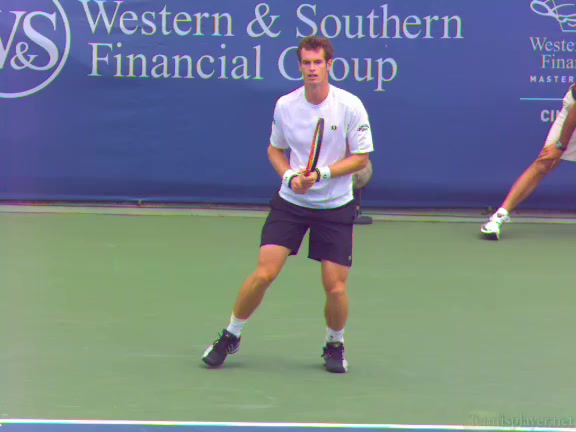 Andy Murray's forehand approach pattern from the ad court, filmed from a court-level angle. His hips stay relatively closed through the first forehand before driving more open on the approach, with a noticeable increase in knee bend and forward leg drive as he moves into the court.