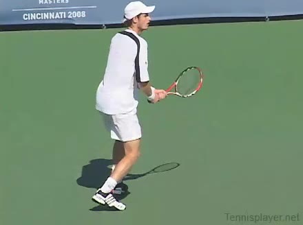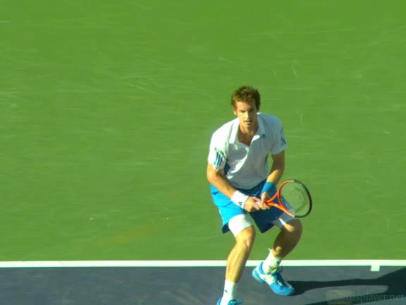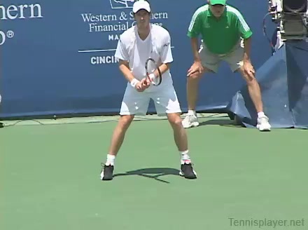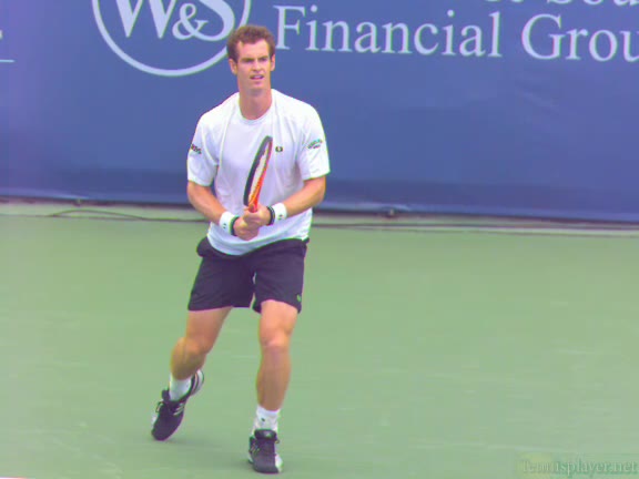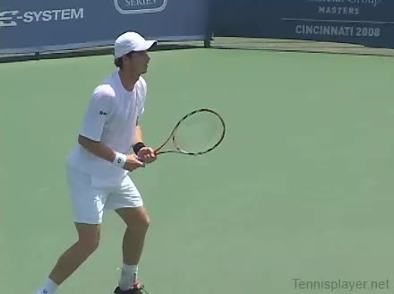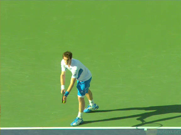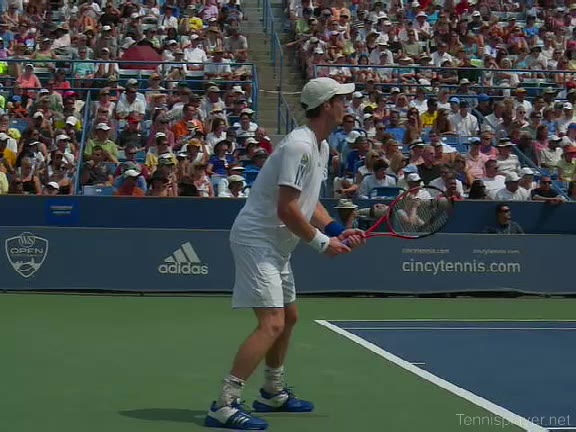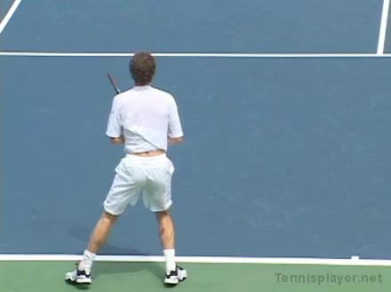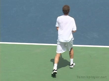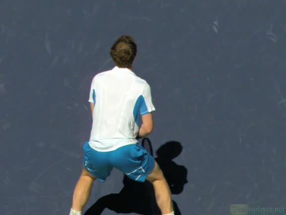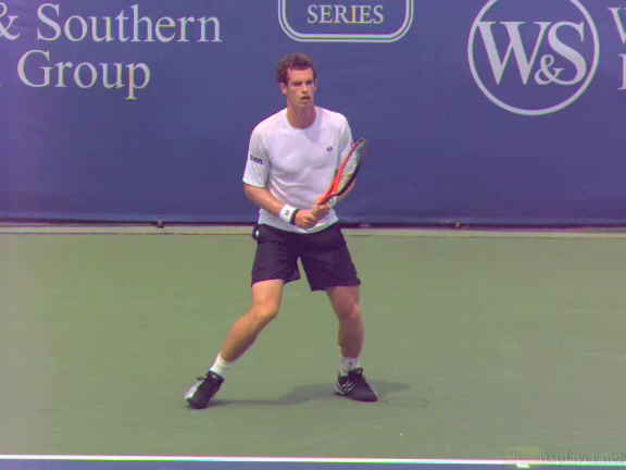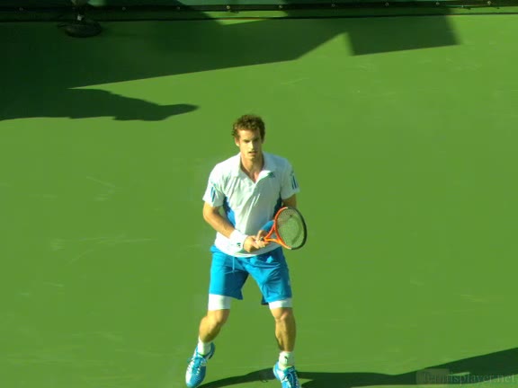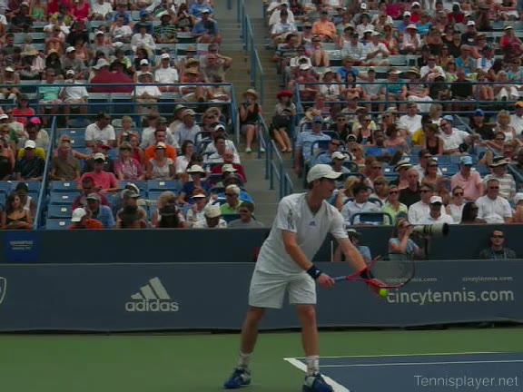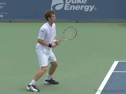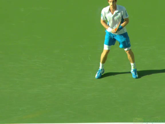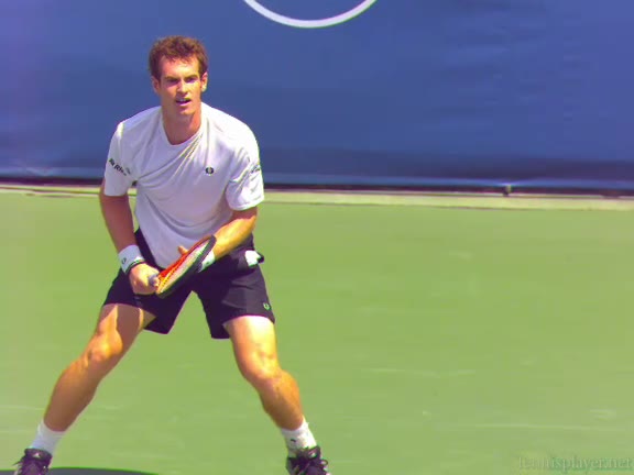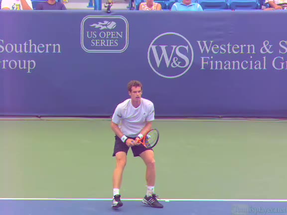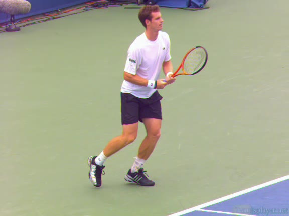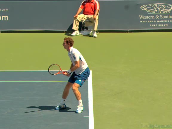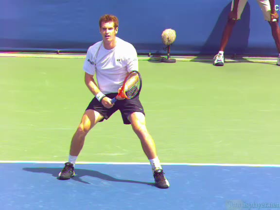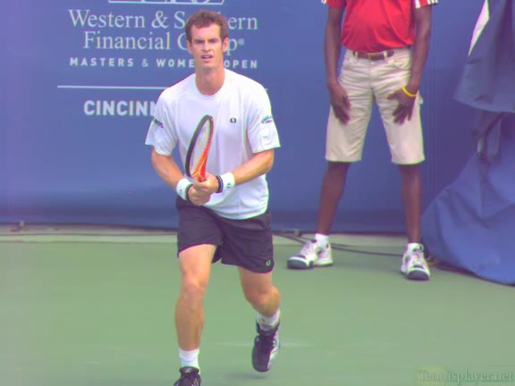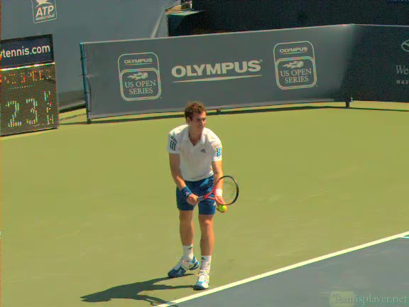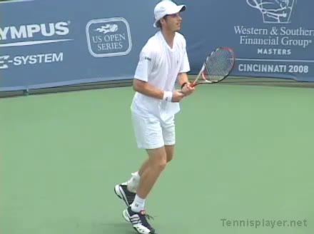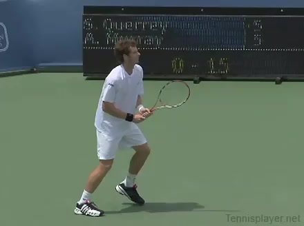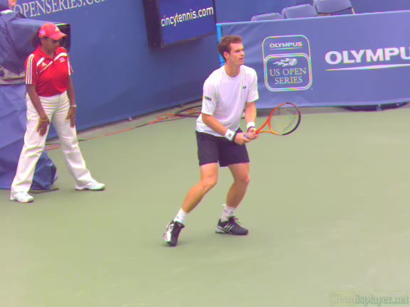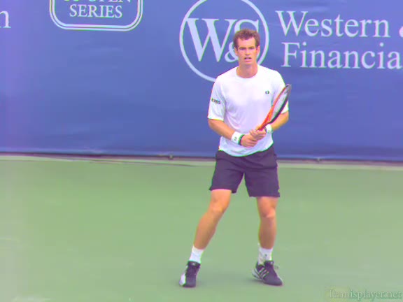 Andy Murray's forehand approach pattern from the ad court, filmed from a court-level angle. His hips stay relatively closed through the first forehand before driving more open on the approach, with a noticeable increase in knee bend and forward leg drive as he moves into the court.