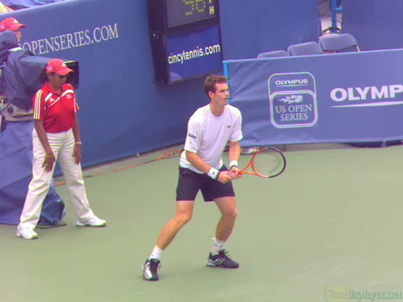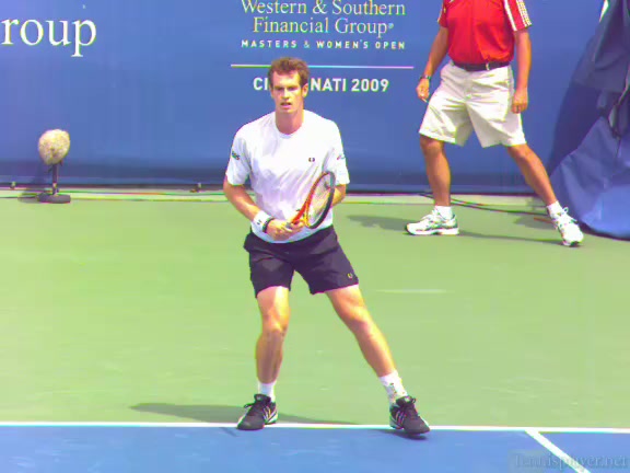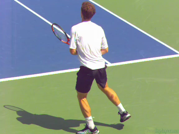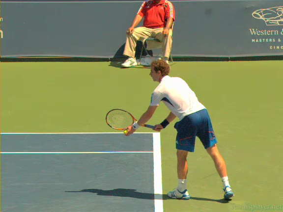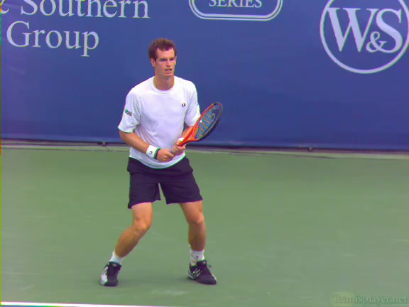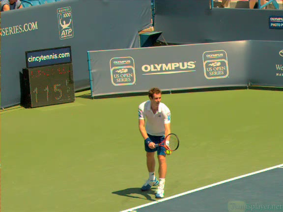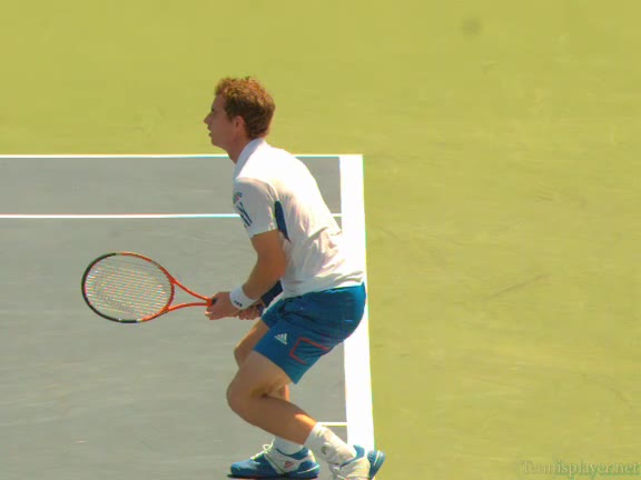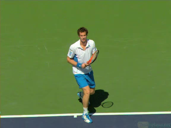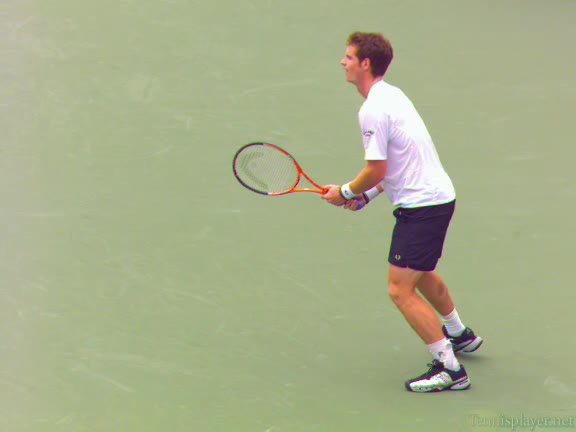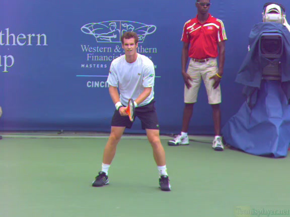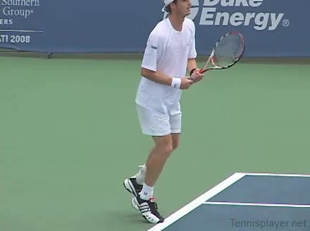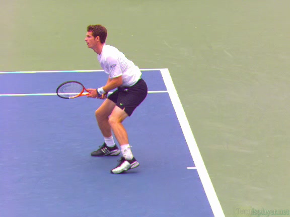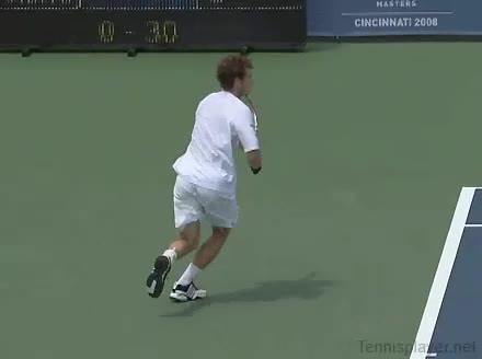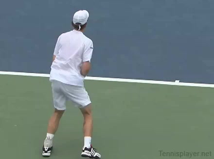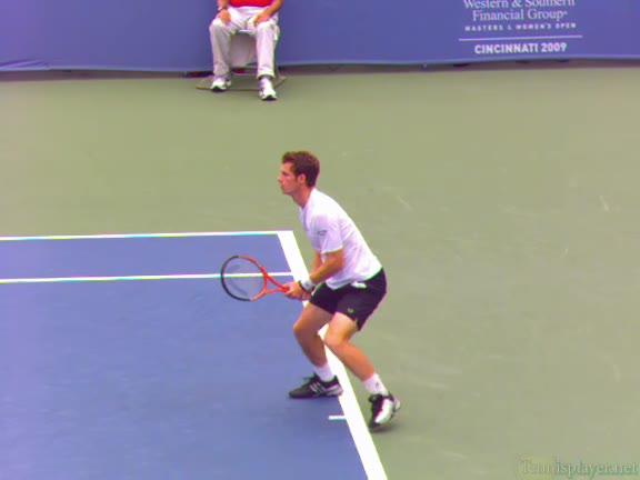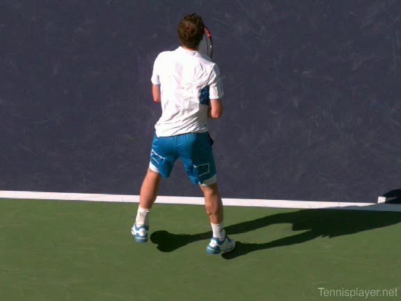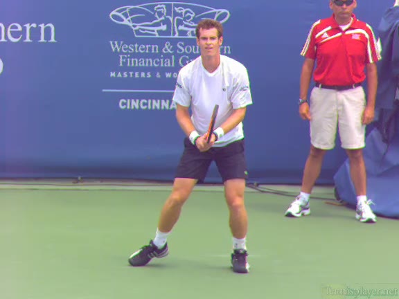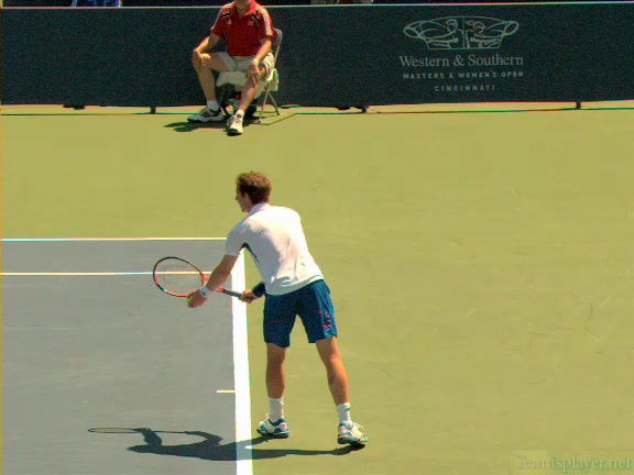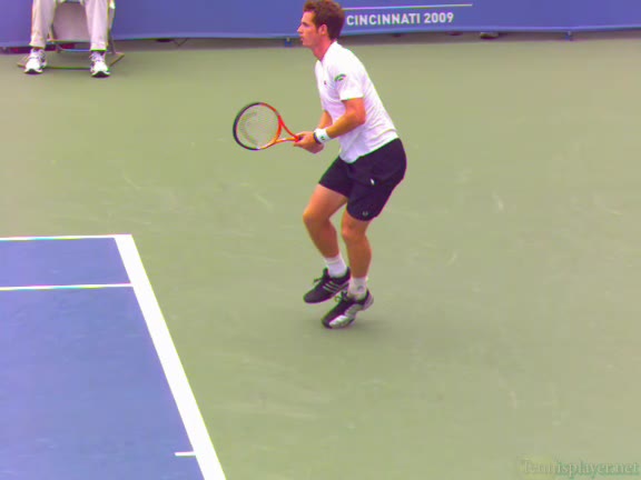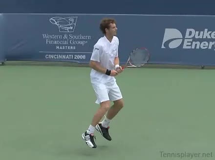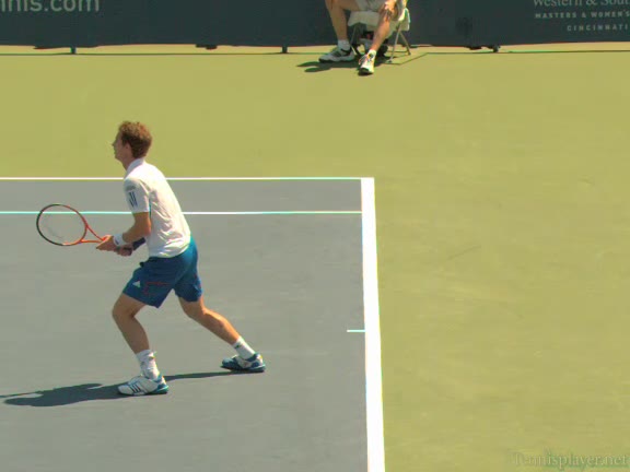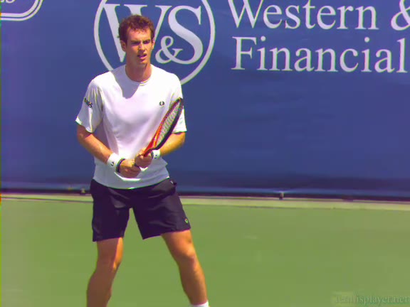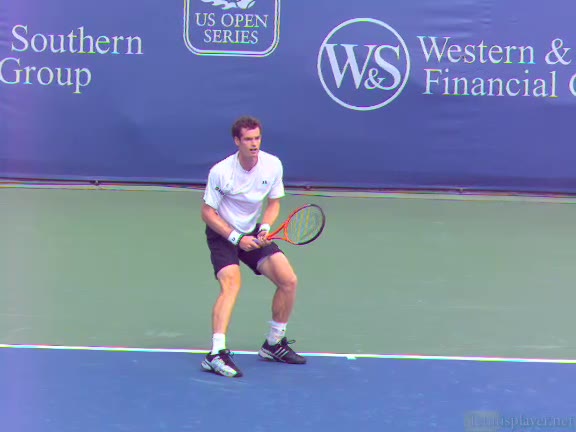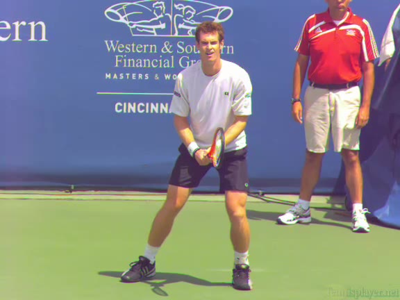 Andy Murray's forehand approach pattern from the ad court, filmed from a court-level angle. His hips stay relatively closed through the first forehand before driving more open on the approach, with a noticeable increase in knee bend and forward leg drive as he moves into the court.