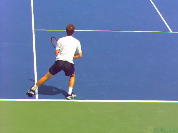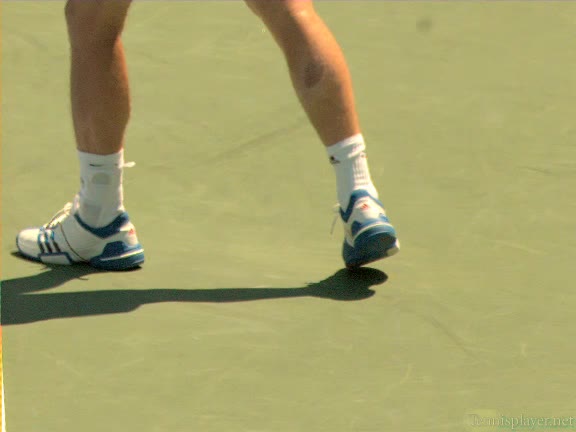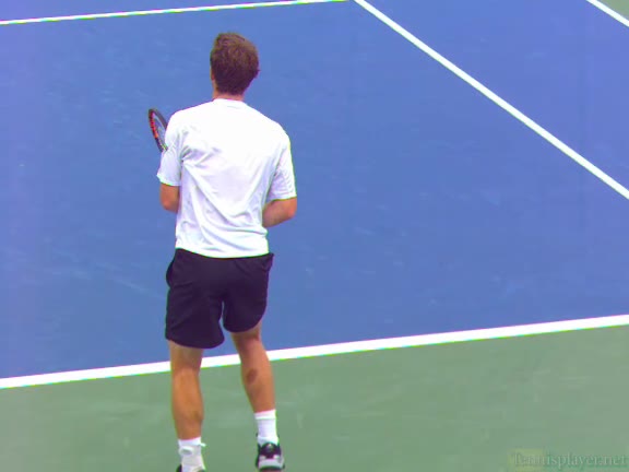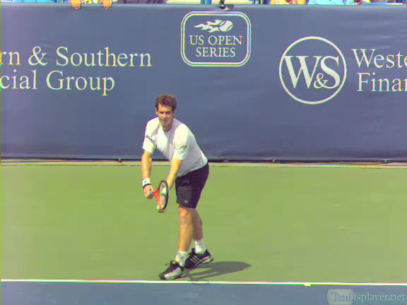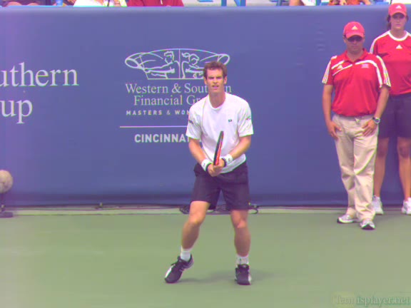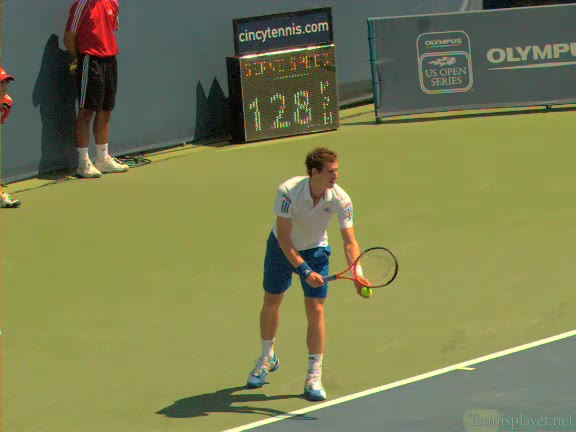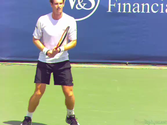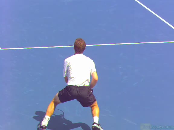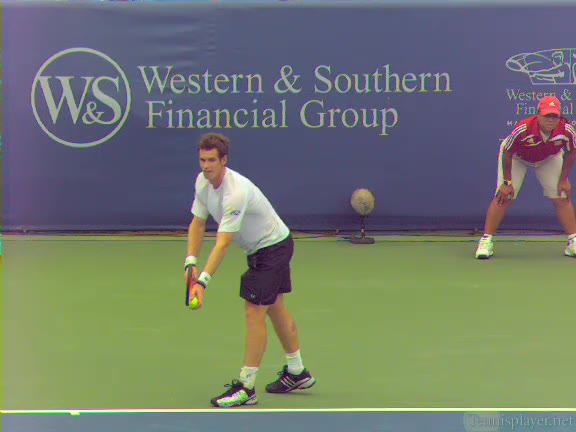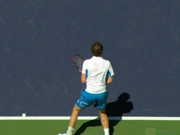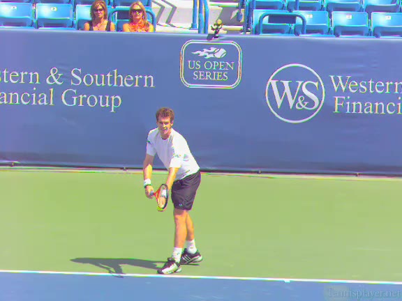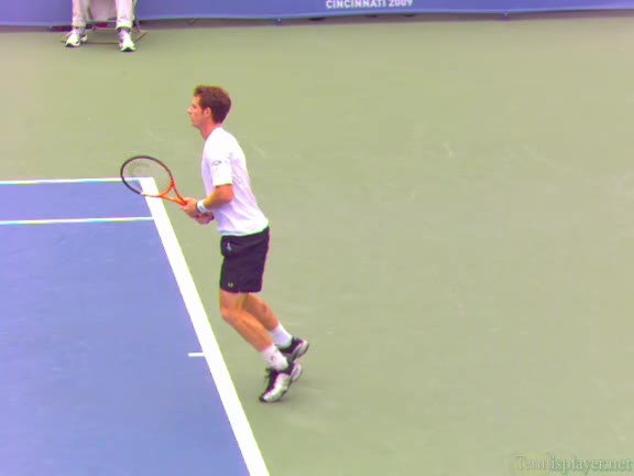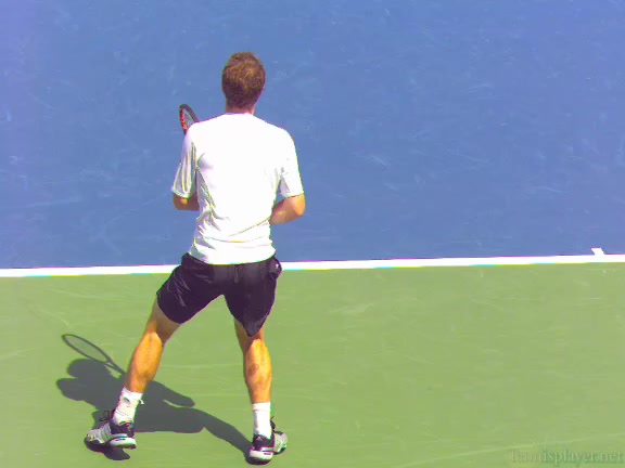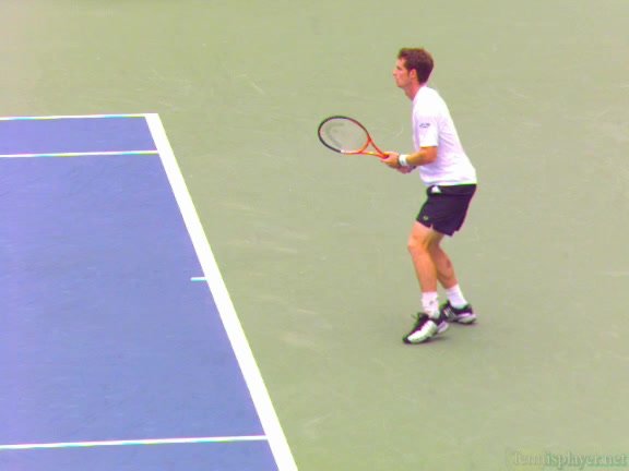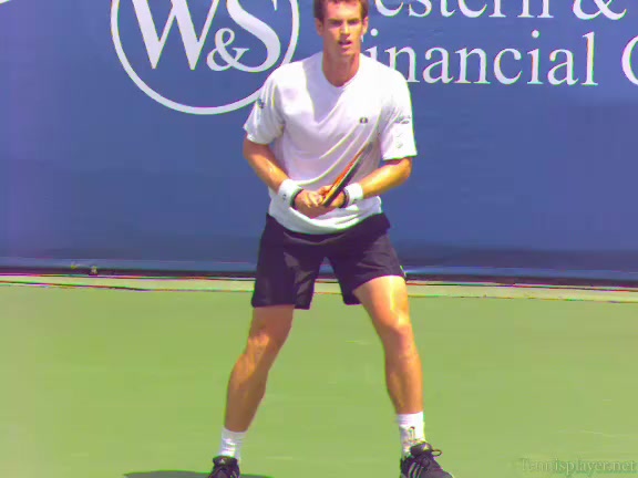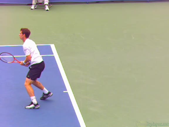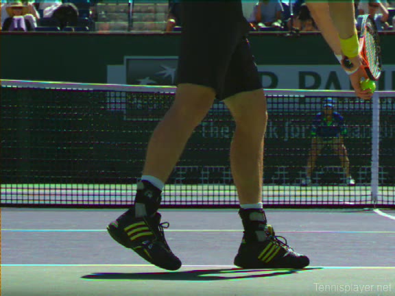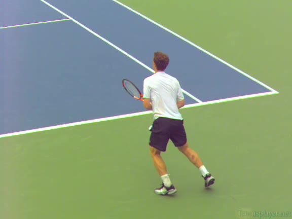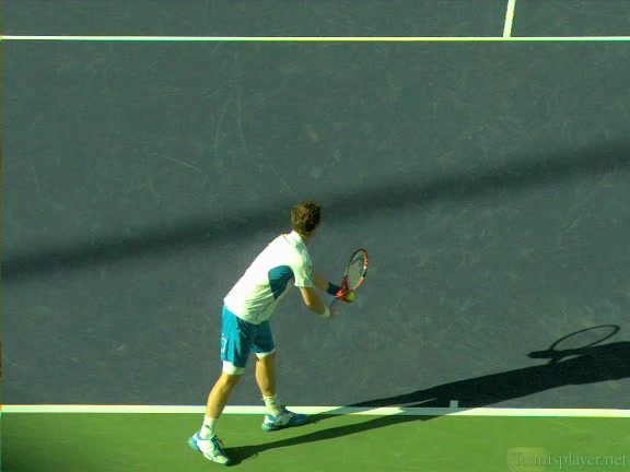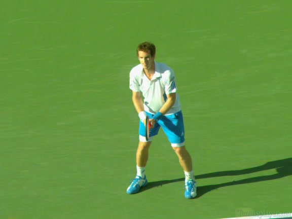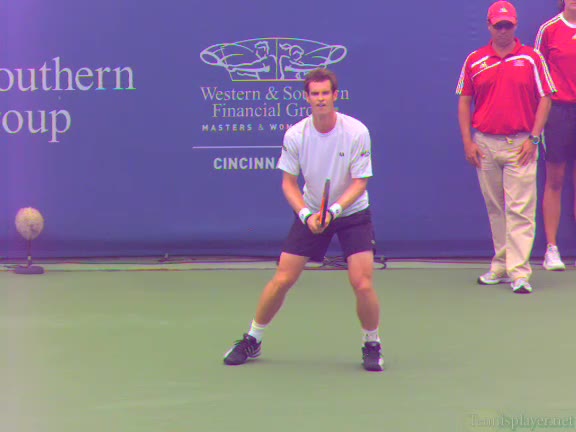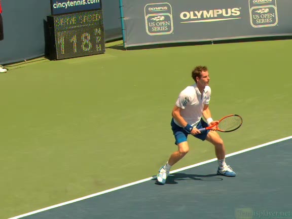 Andy Murray's forehand approach pattern from the ad court, filmed from a court-level angle. His hips stay relatively closed through the first forehand before driving more open on the approach, with a noticeable increase in knee bend and forward leg drive as he moves into the court.