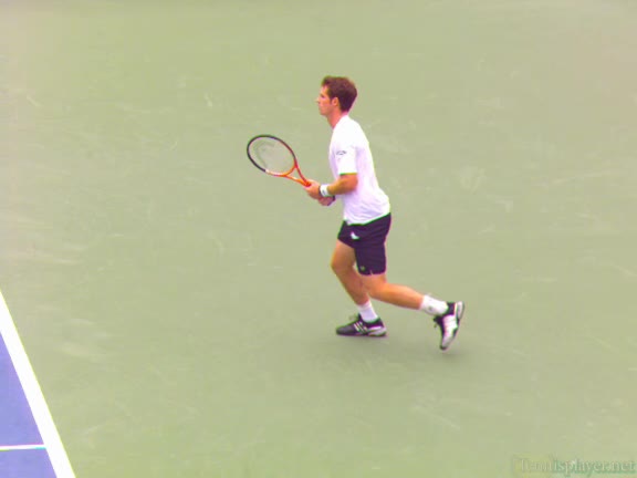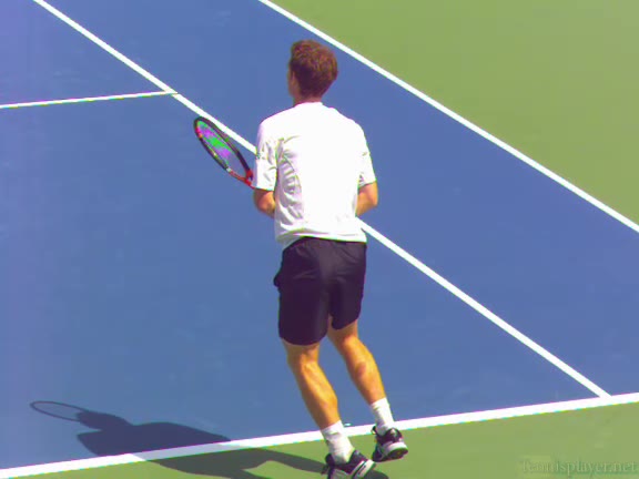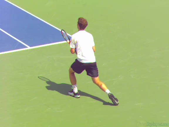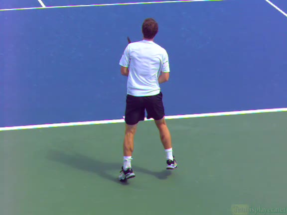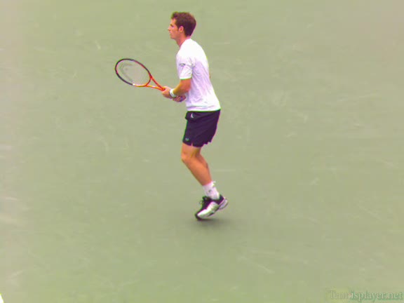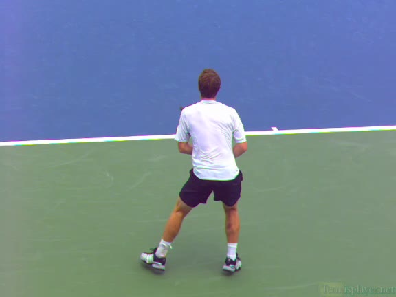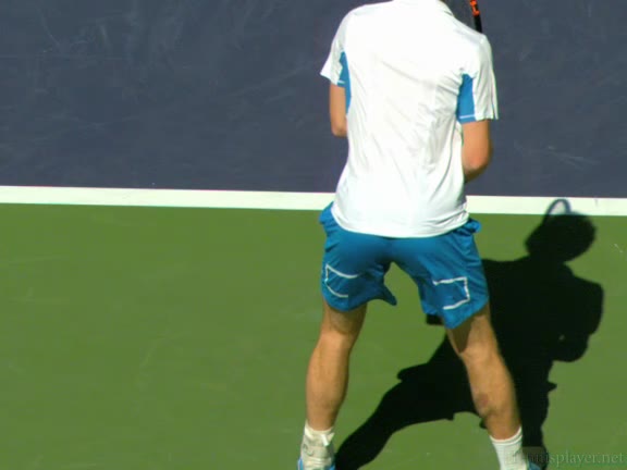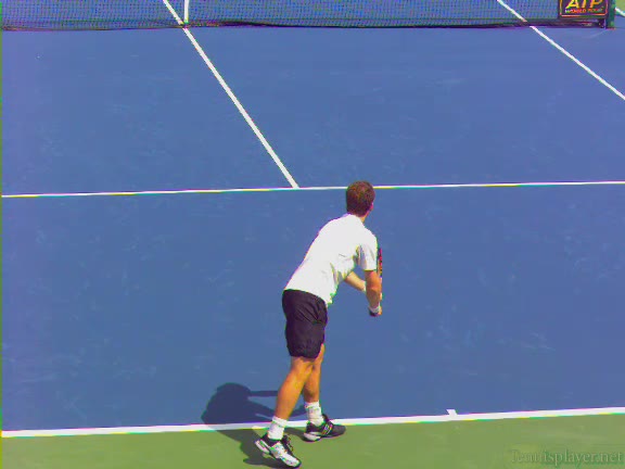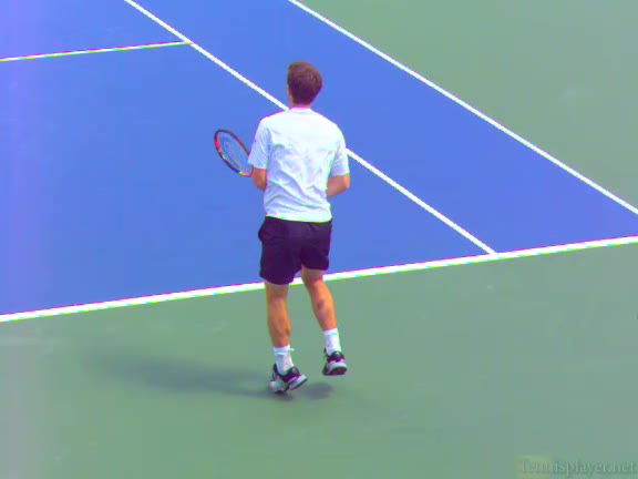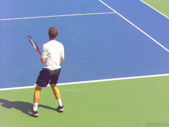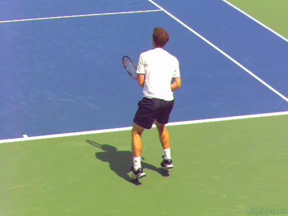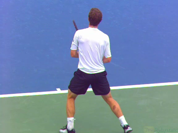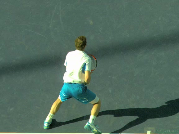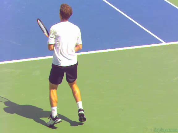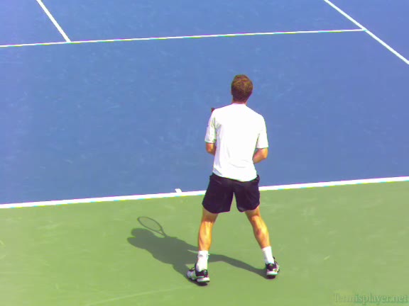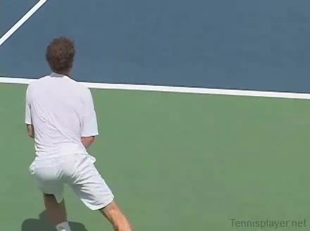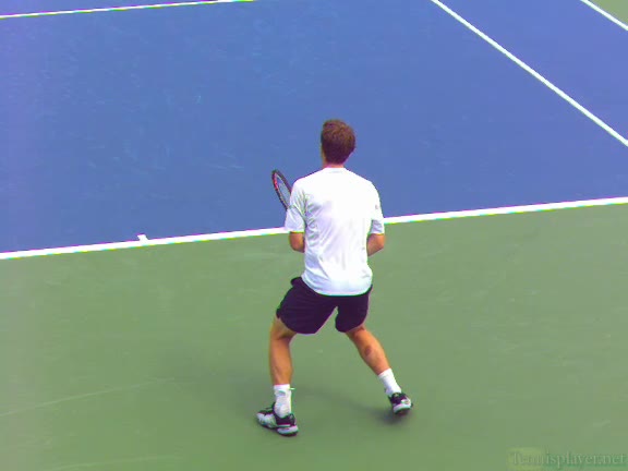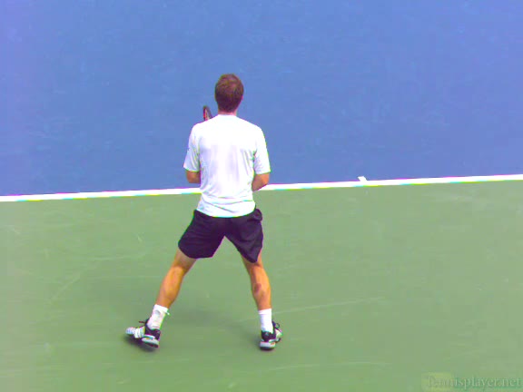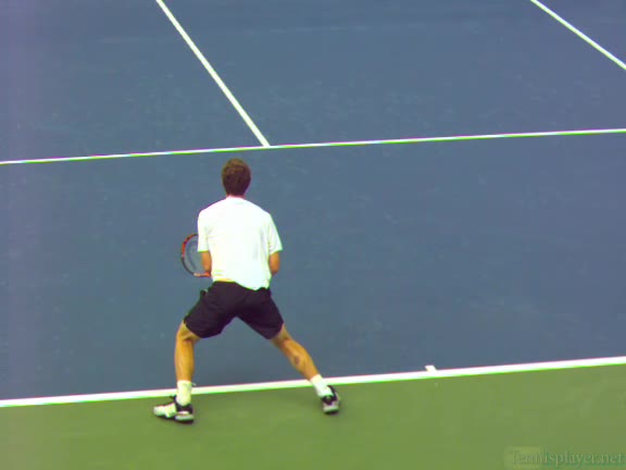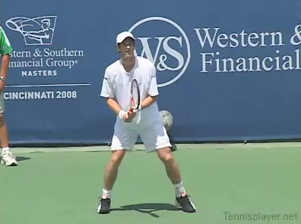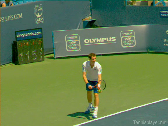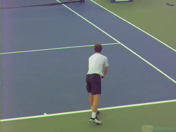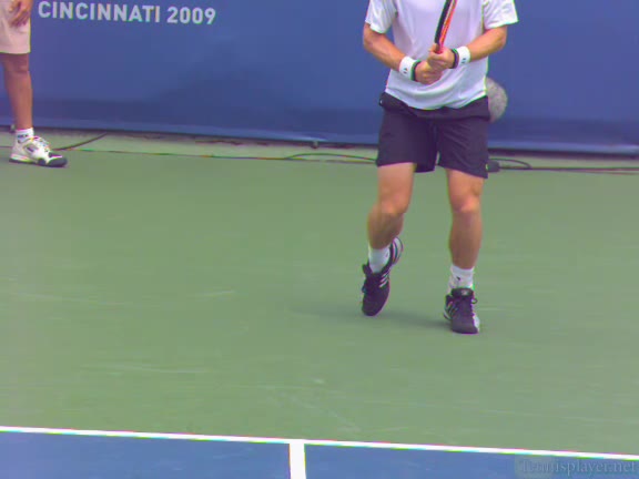 Andy Murray's forehand approach pattern from the ad court, filmed from a court-level angle. His hips stay relatively closed through the first forehand before driving more open on the approach, with a noticeable increase in knee bend and forward leg drive as he moves into the court.