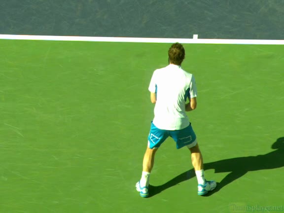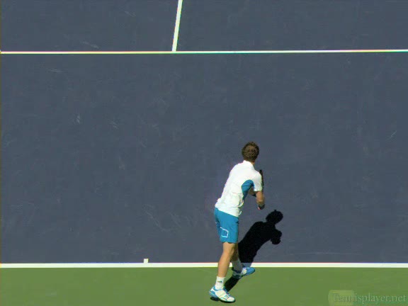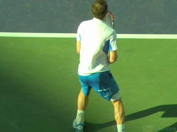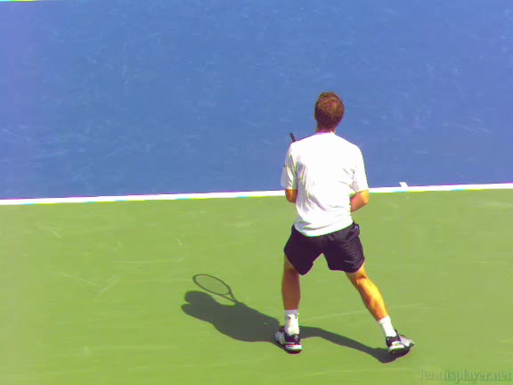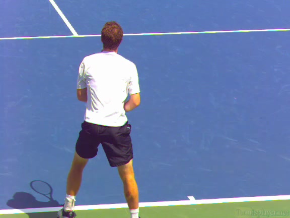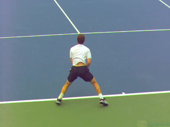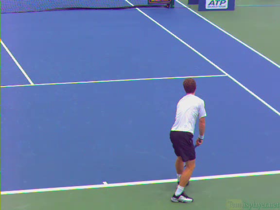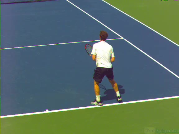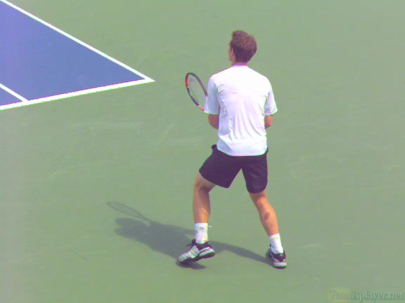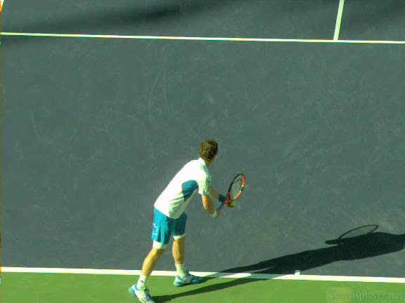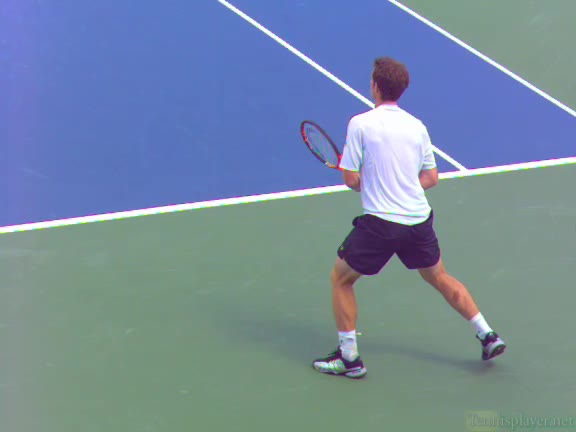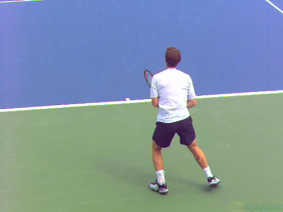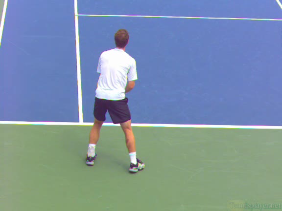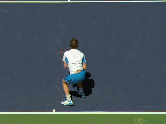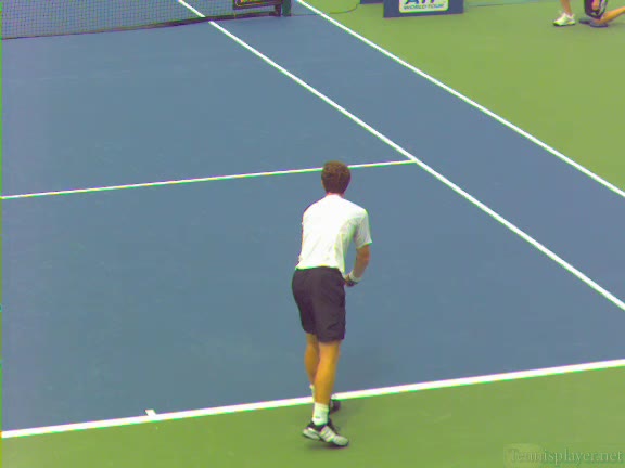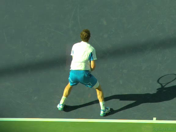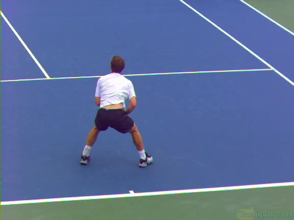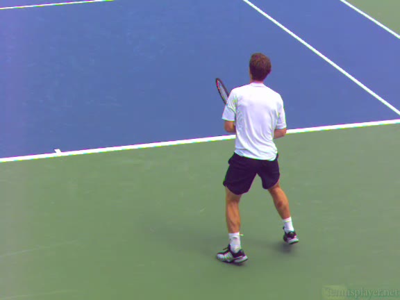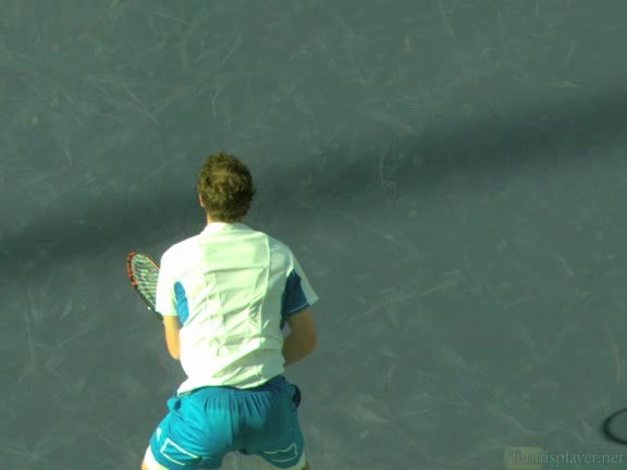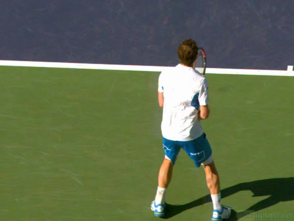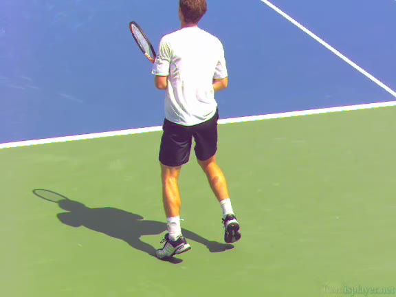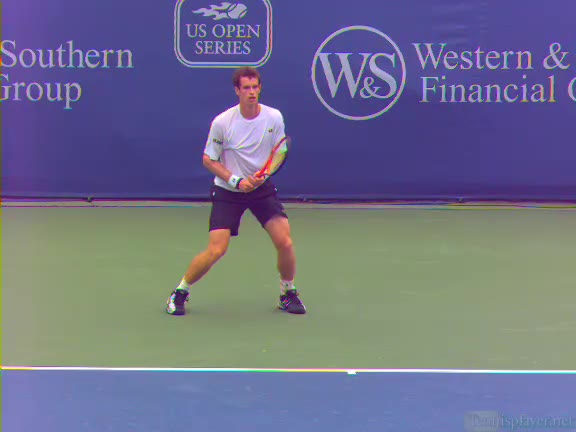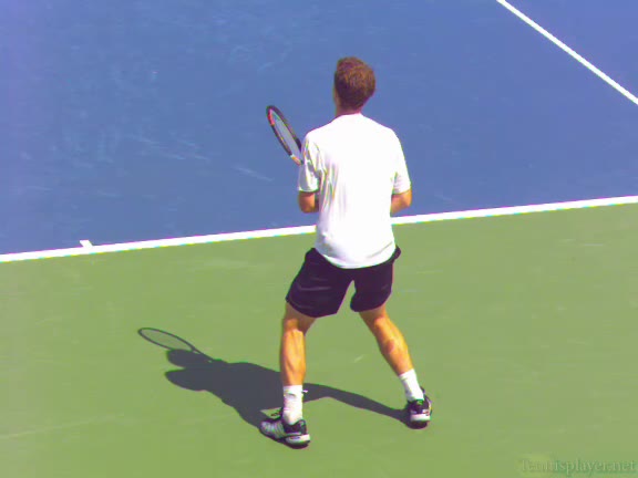 Andy Murray's forehand approach pattern from the ad court, filmed from a court-level angle. His hips stay relatively closed through the first forehand before driving more open on the approach, with a noticeable increase in knee bend and forward leg drive as he moves into the court.