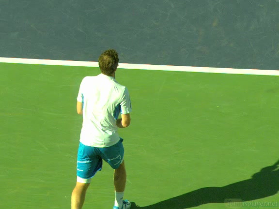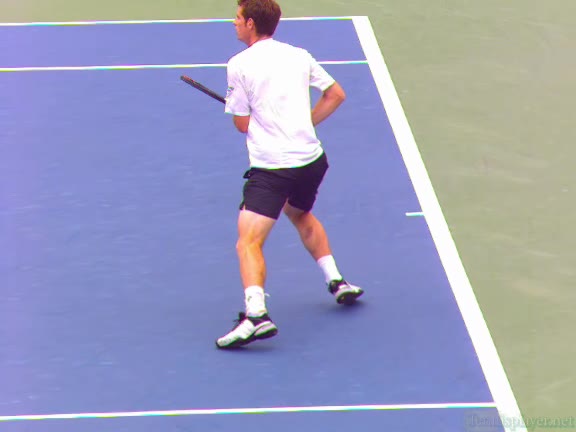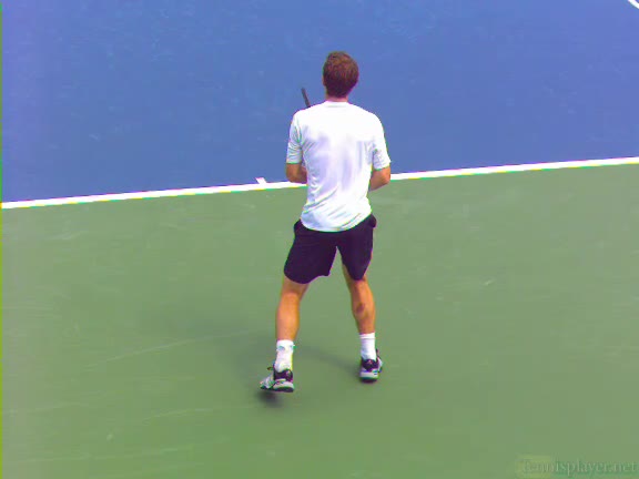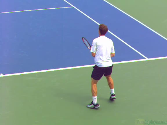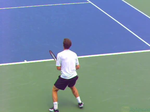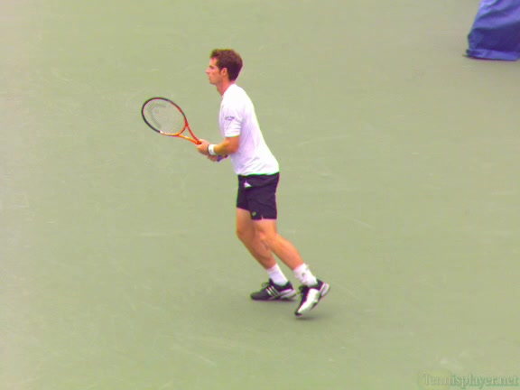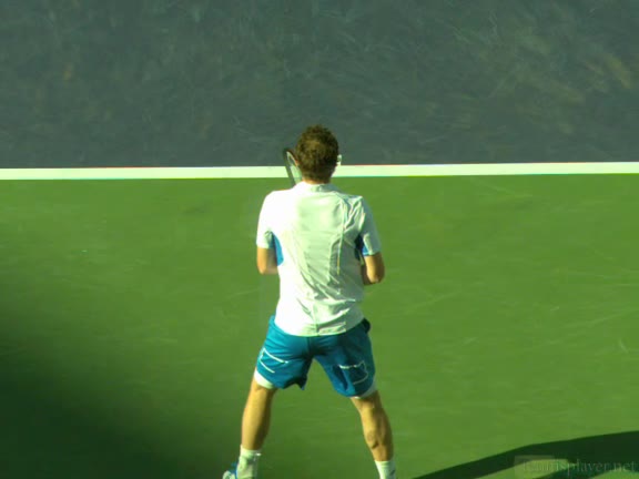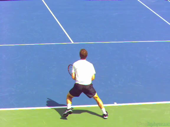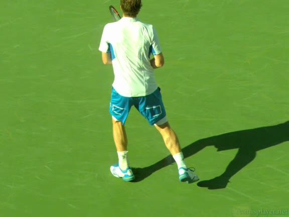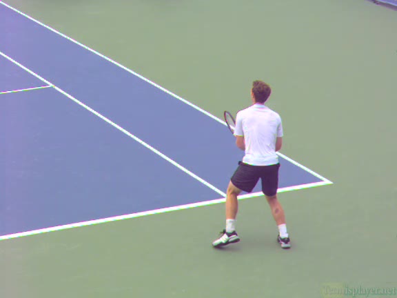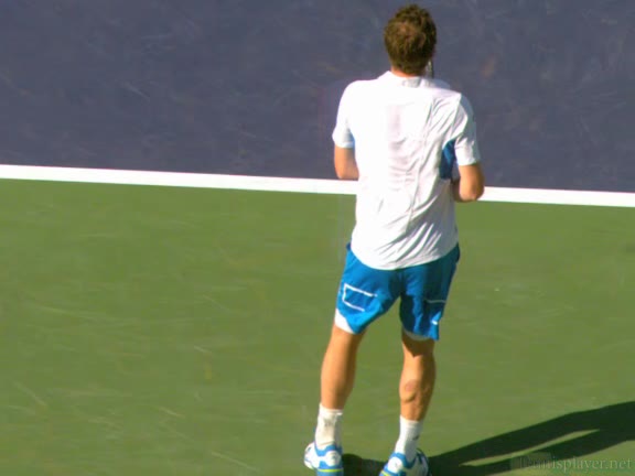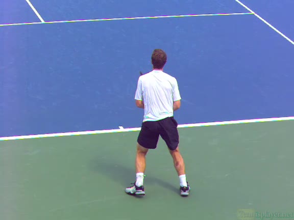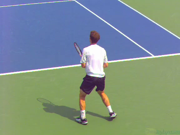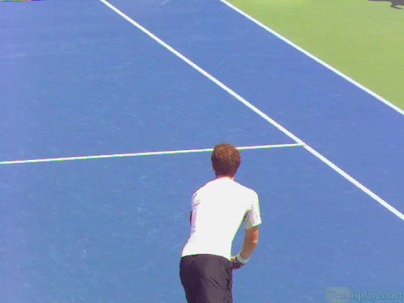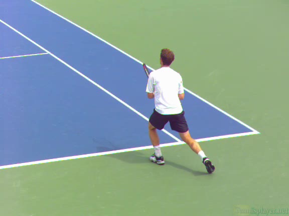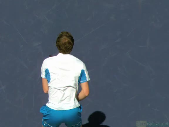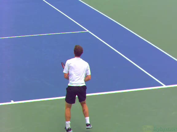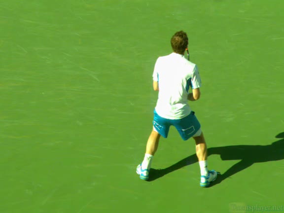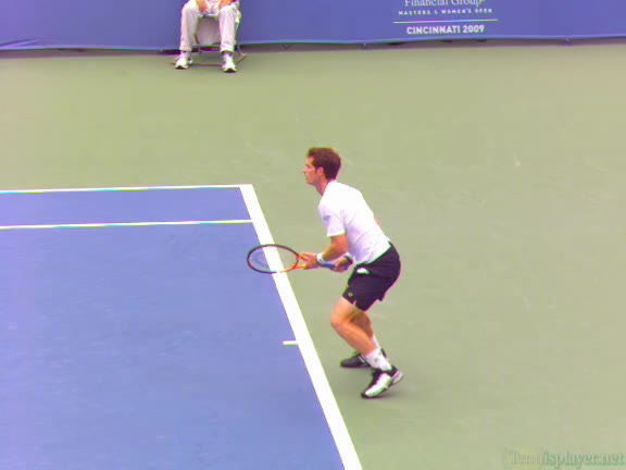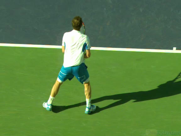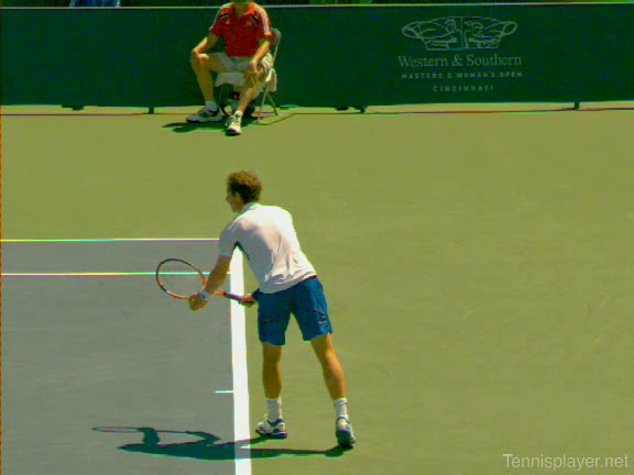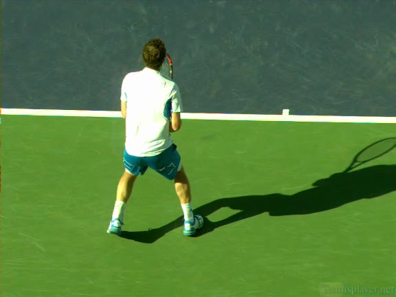 Andy Murray's forehand approach pattern from the ad court, filmed from a court-level angle. His hips stay relatively closed through the first forehand before driving more open on the approach, with a noticeable increase in knee bend and forward leg drive as he moves into the court.