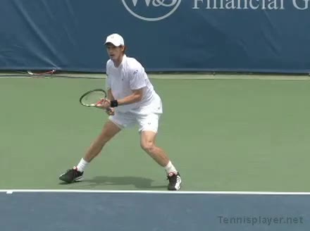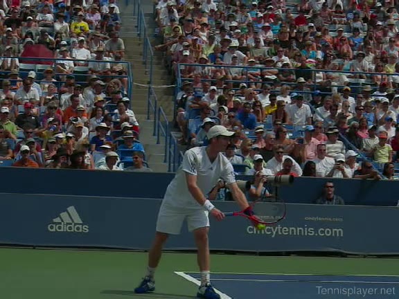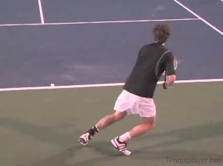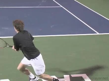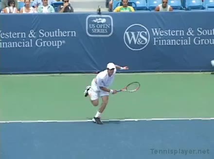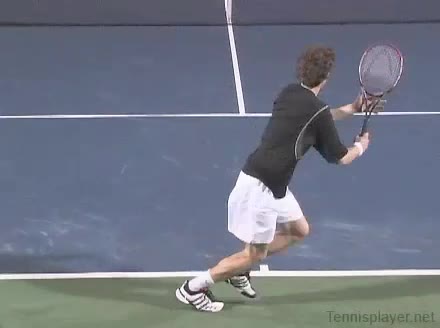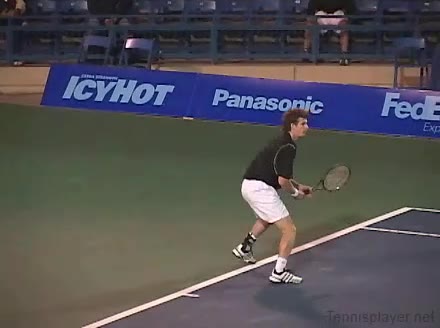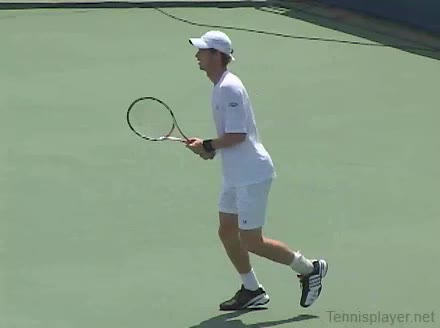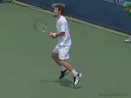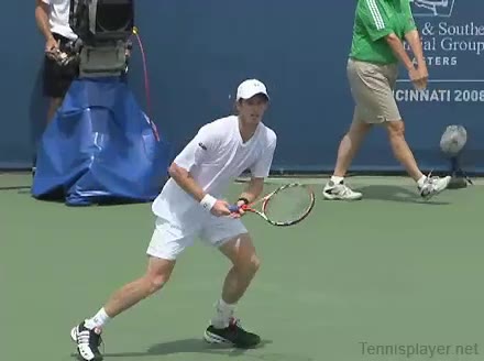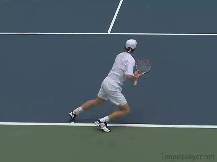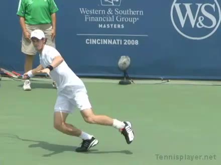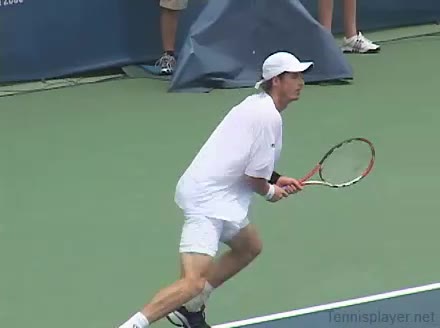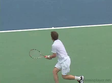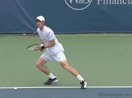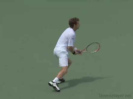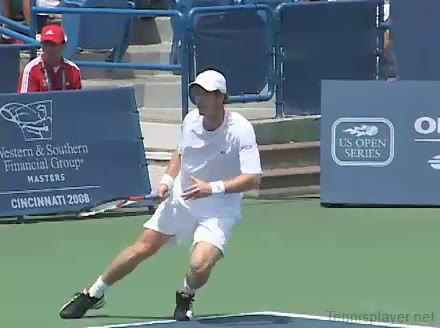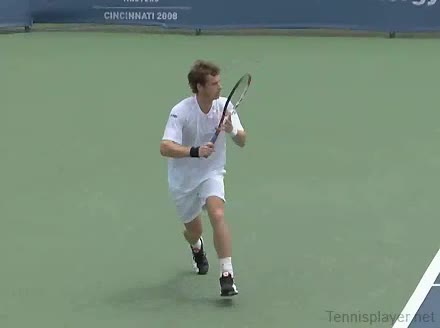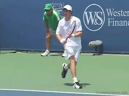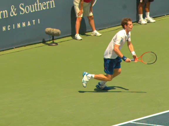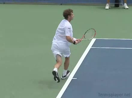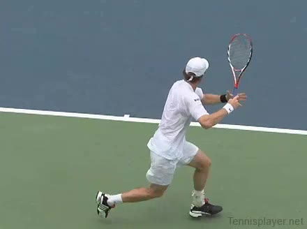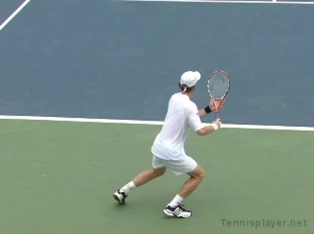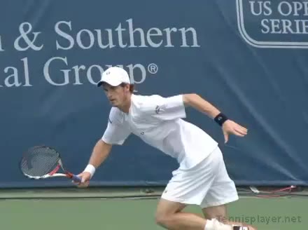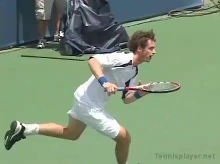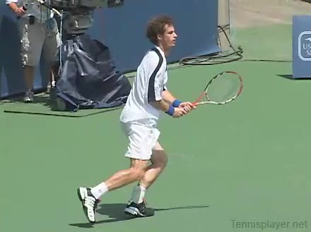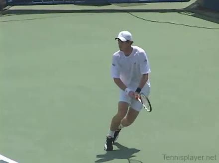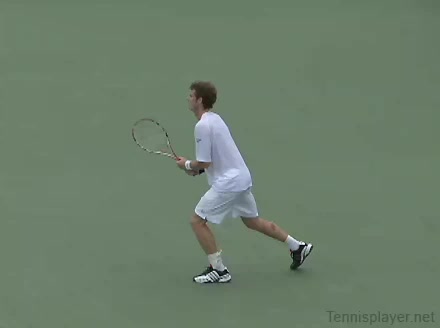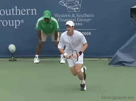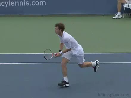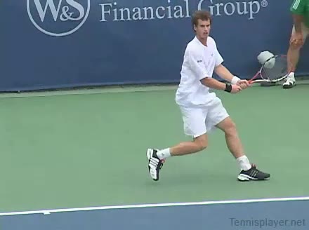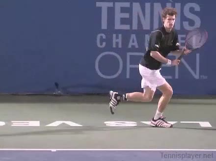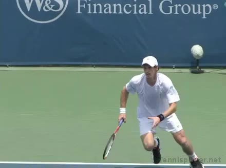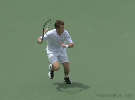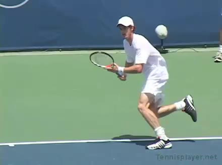 Andy Murray's running backhand from the center of the court, filmed from a court_level front angle. His hips stay relatively closed to the net while his outside leg plants with a deep knee bend, driving his body laterally through the shot as he recovers.