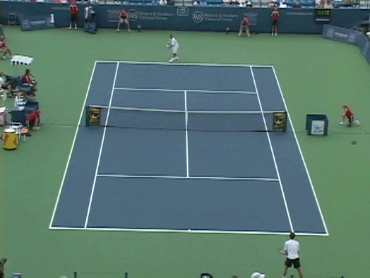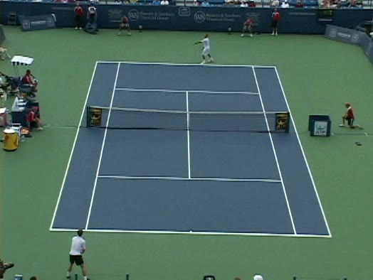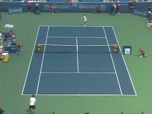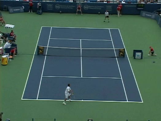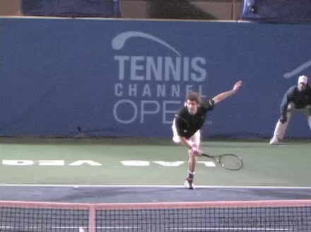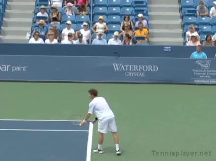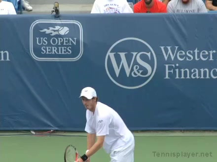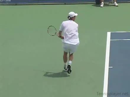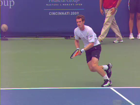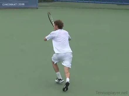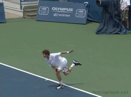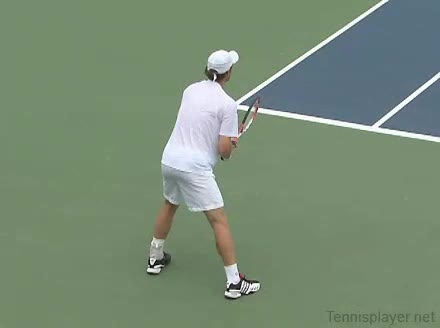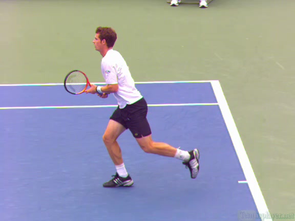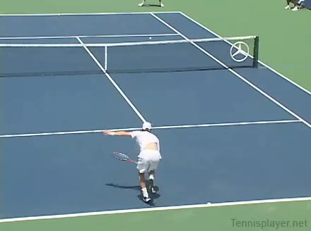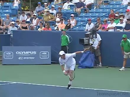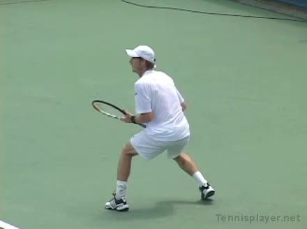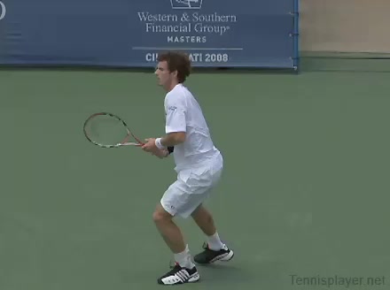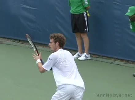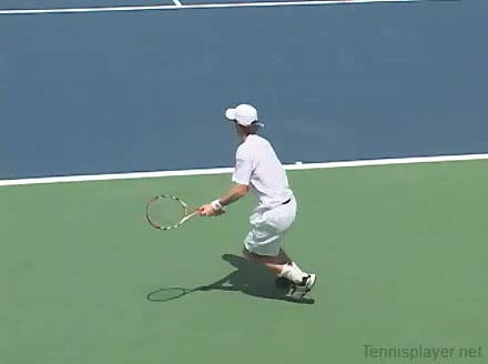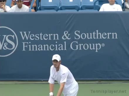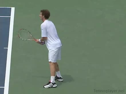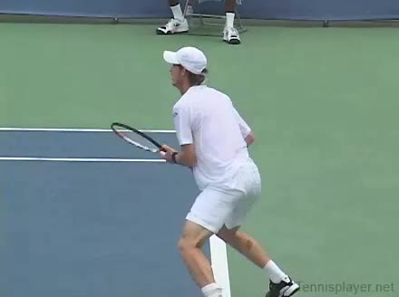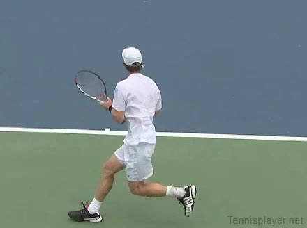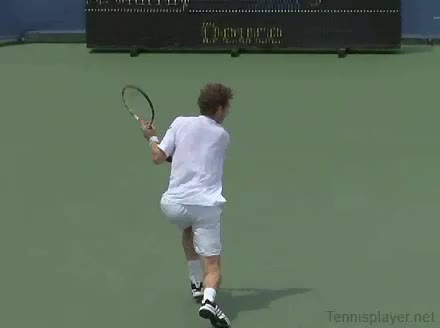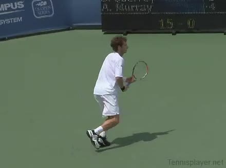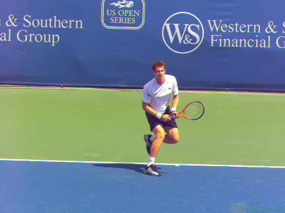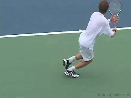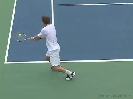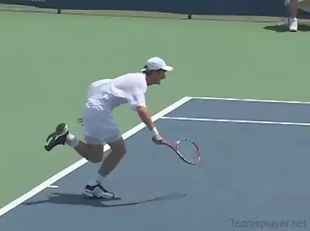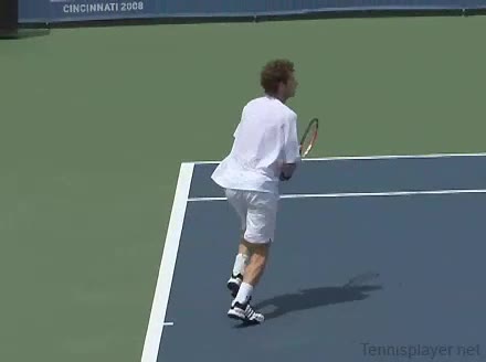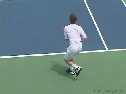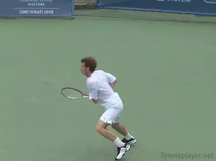 Andy Murray's running backhand from the center of the court, filmed from a court_level front angle. His hips stay relatively closed to the net while his outside leg plants with a deep knee bend, driving his body laterally through the shot as he recovers.