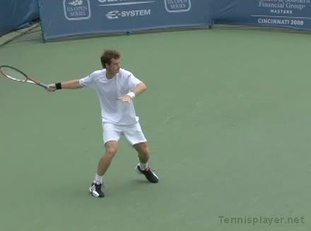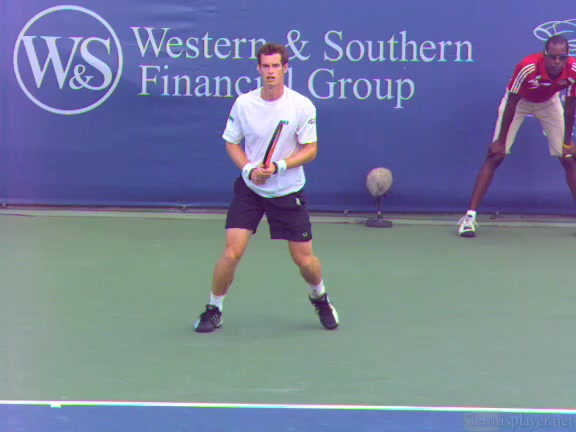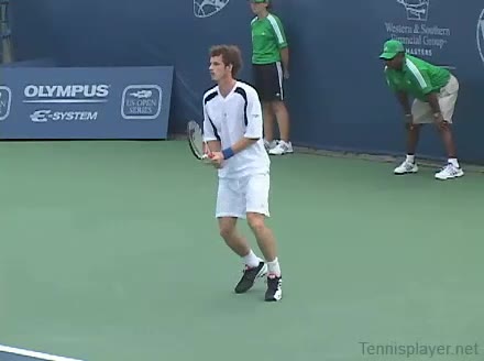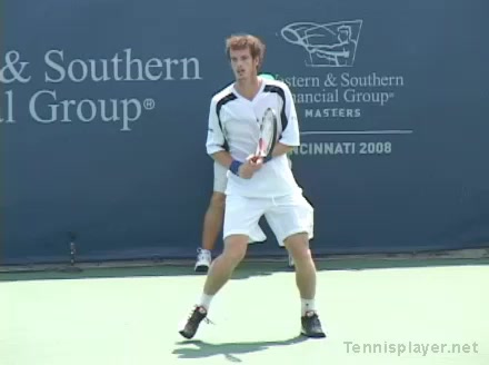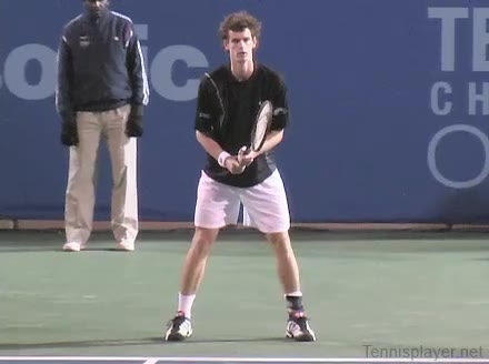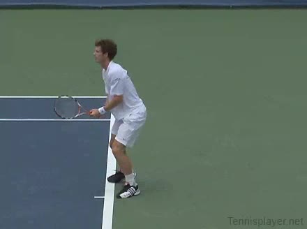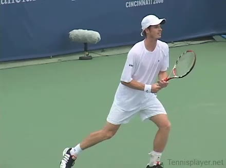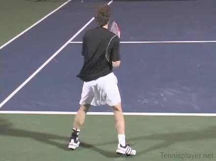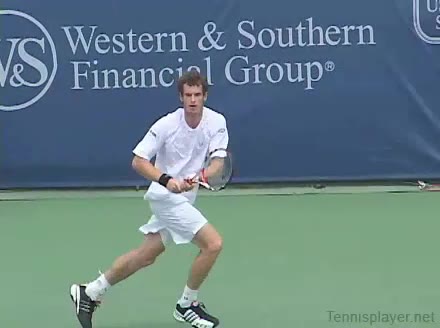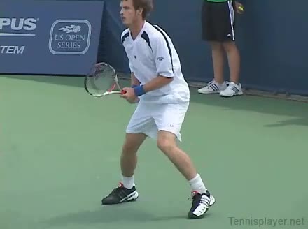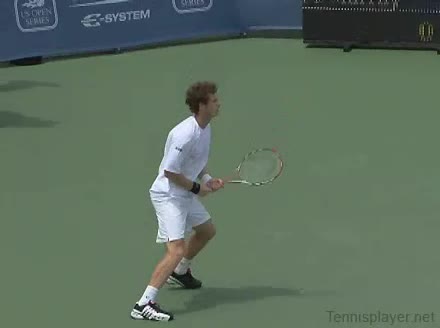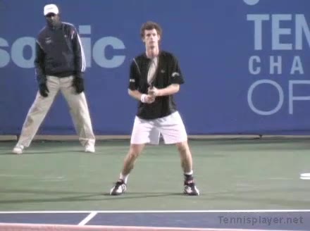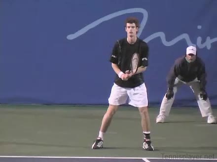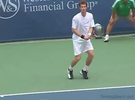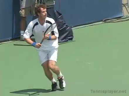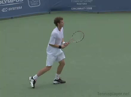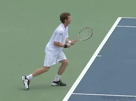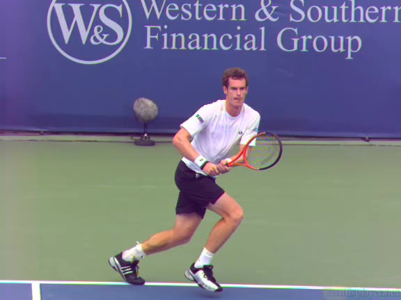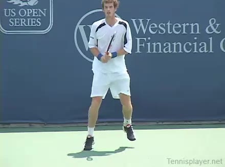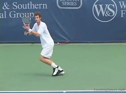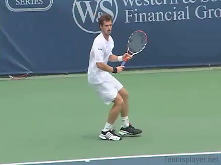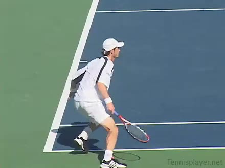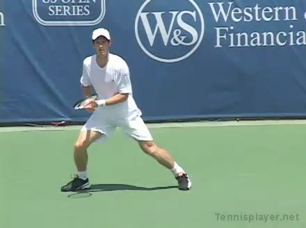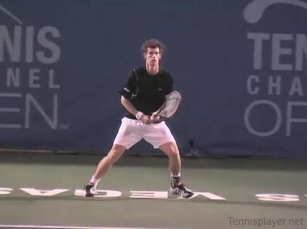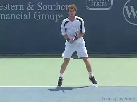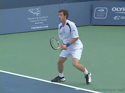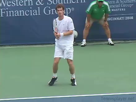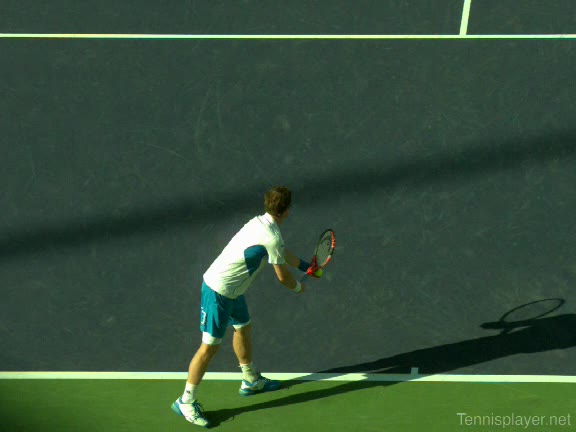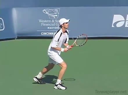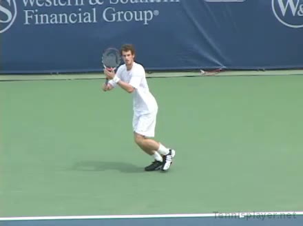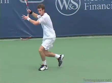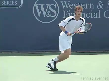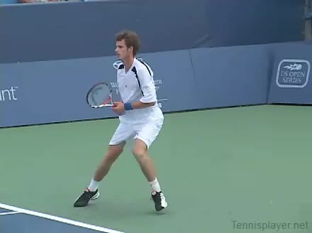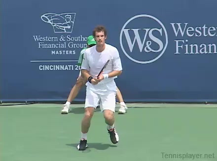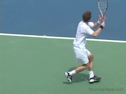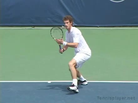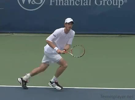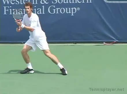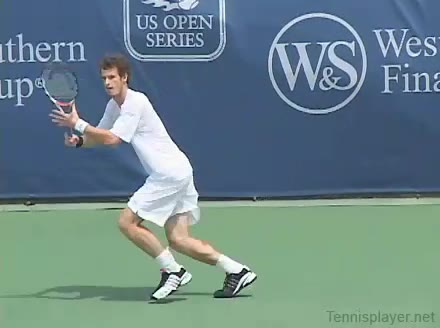 Andy Murray's forehand approach shot followed by a backhand volley from the center of the court, filmed from the side. His shoulders load with a pronounced turn on the forehand approach, then his trunk quickly uncoils and stays relatively closed through contact before rotating more square as he transitions into the backhand volley.