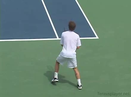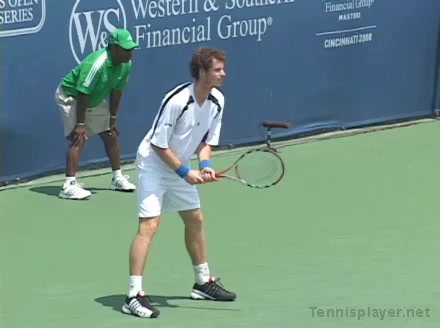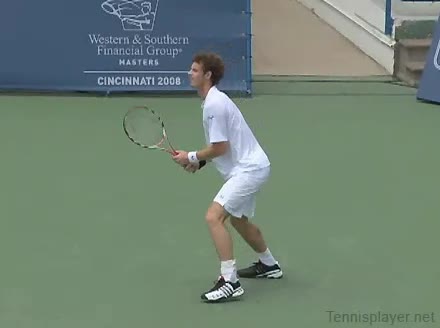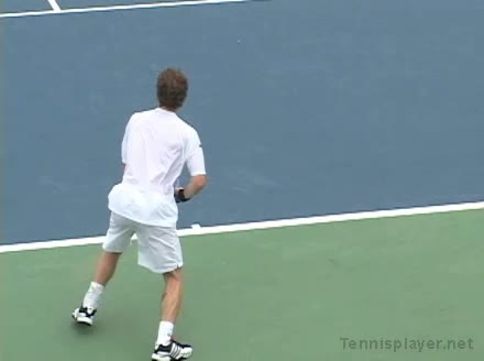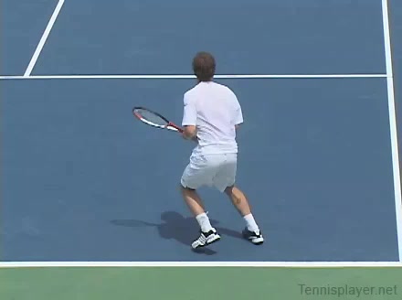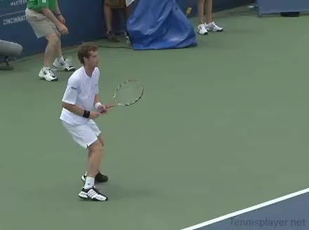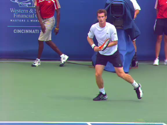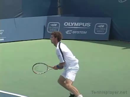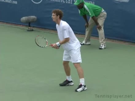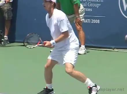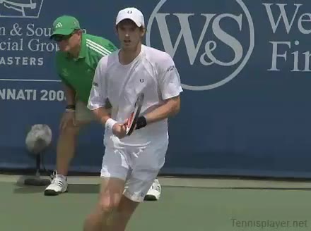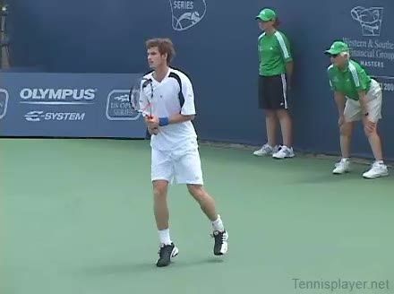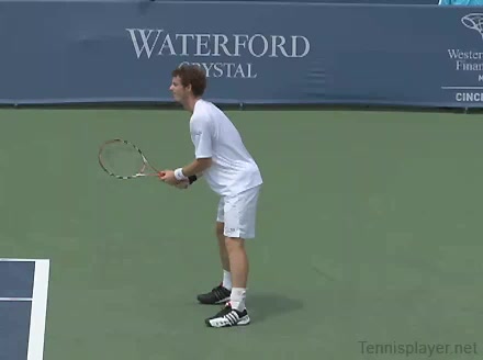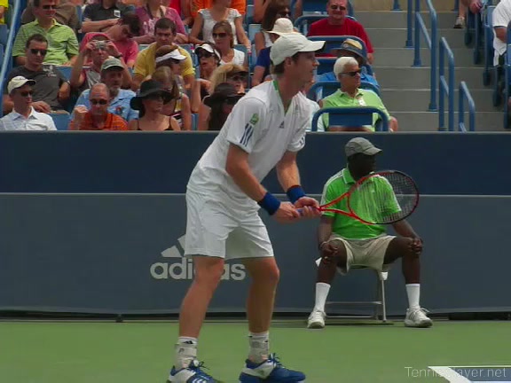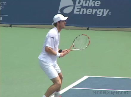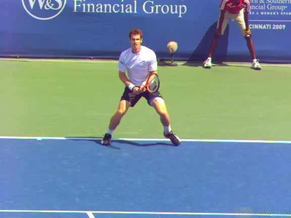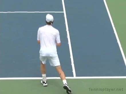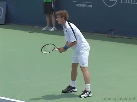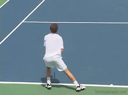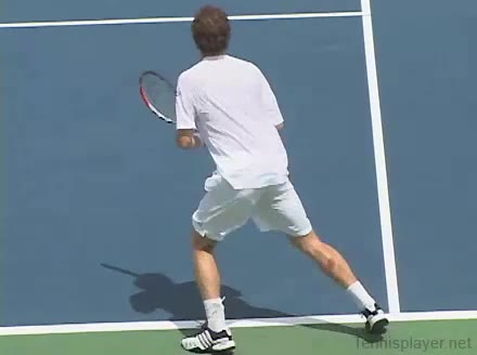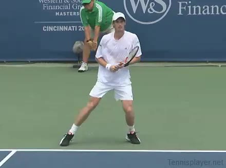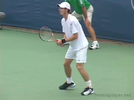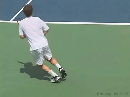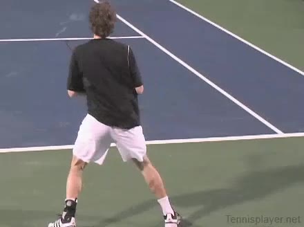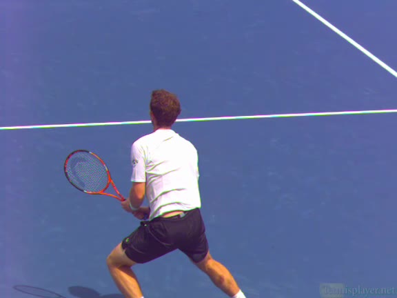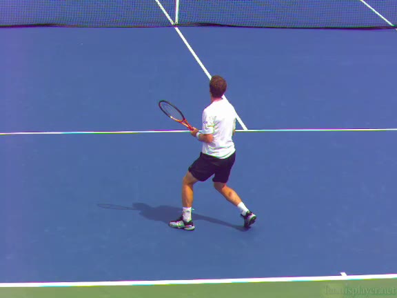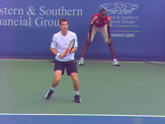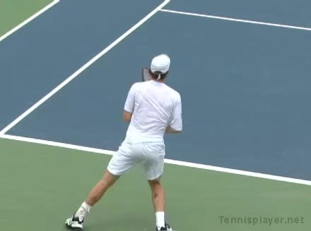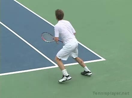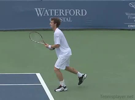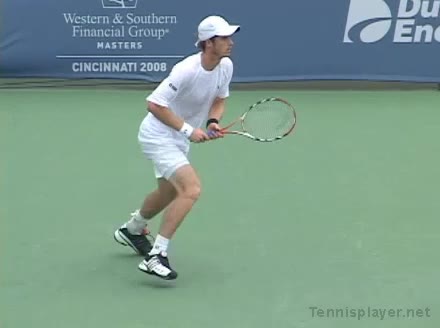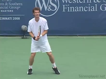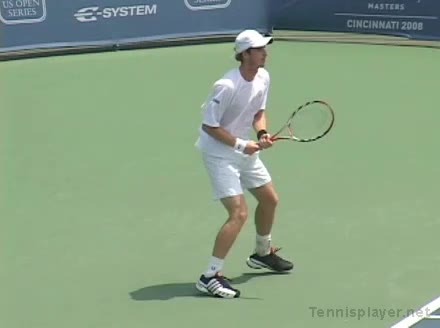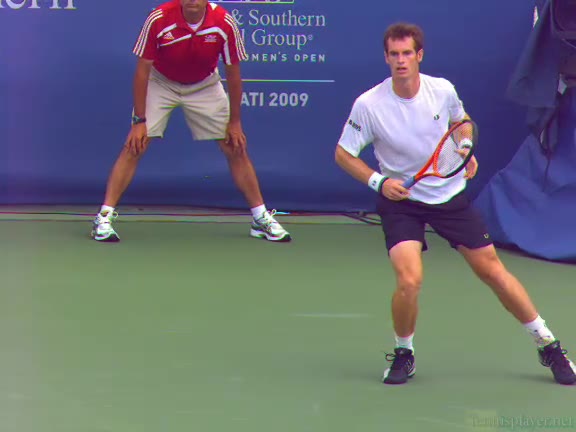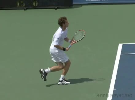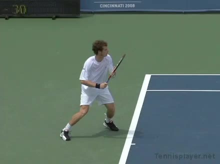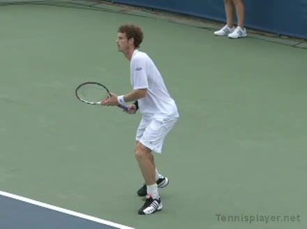 Andy Murray's forehand approach shot followed by a backhand volley from the center of the court, filmed from the side. His shoulders load with a pronounced turn on the forehand approach, then his trunk quickly uncoils and stays relatively closed through contact before rotating more square as he transitions into the backhand volley.