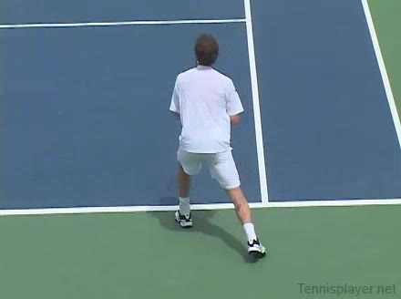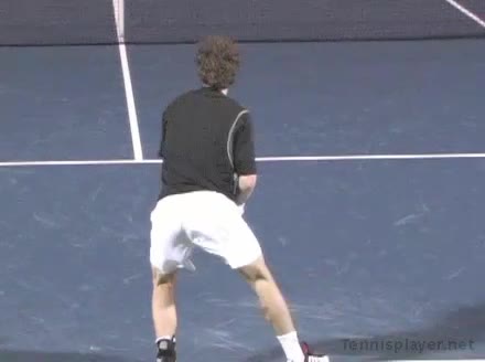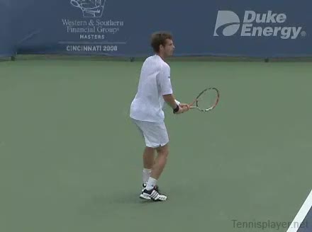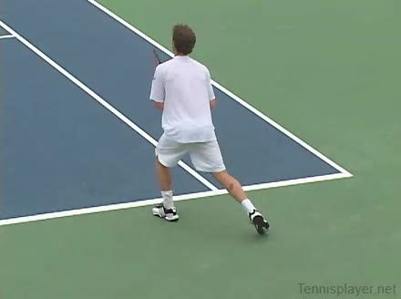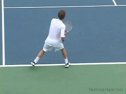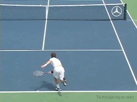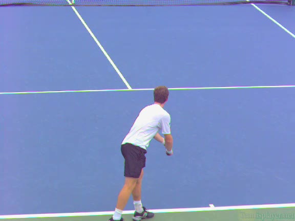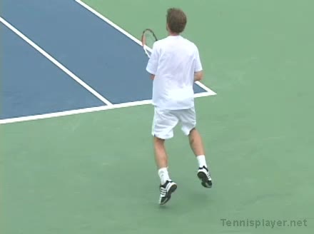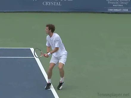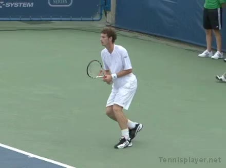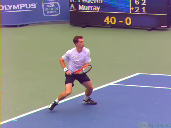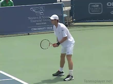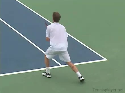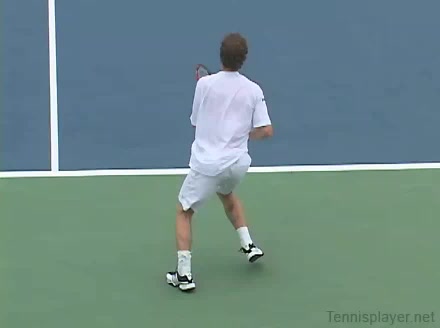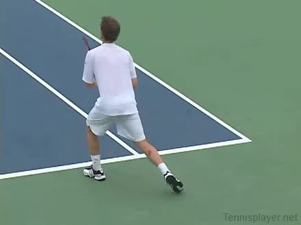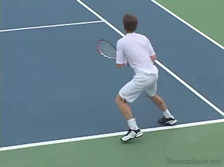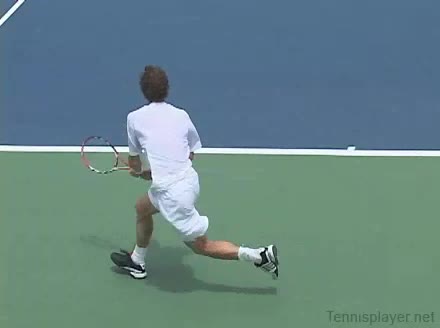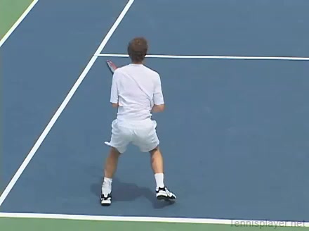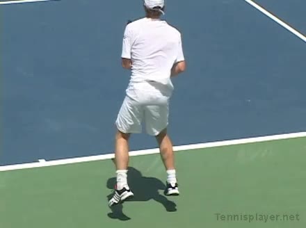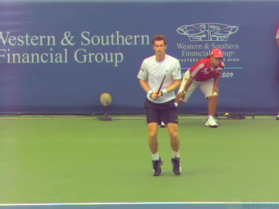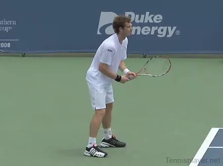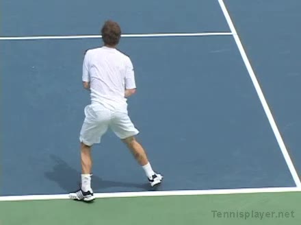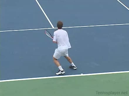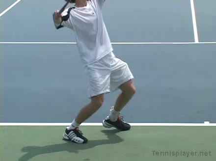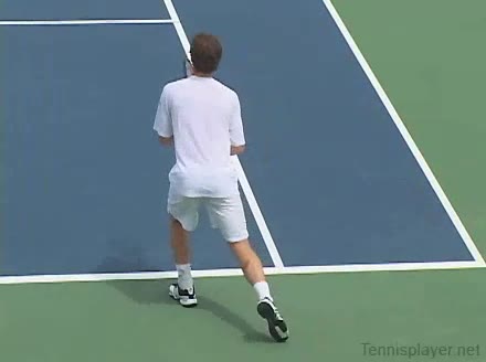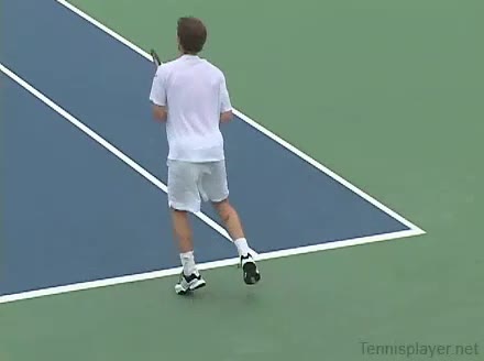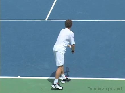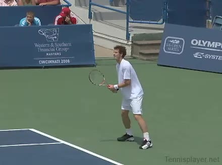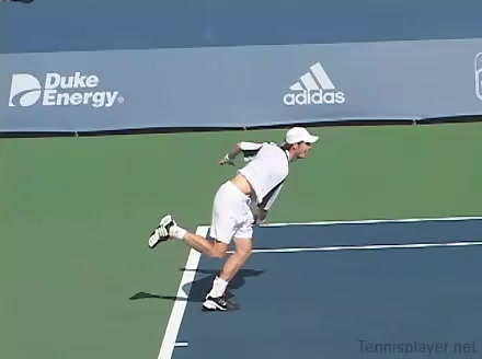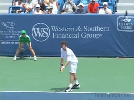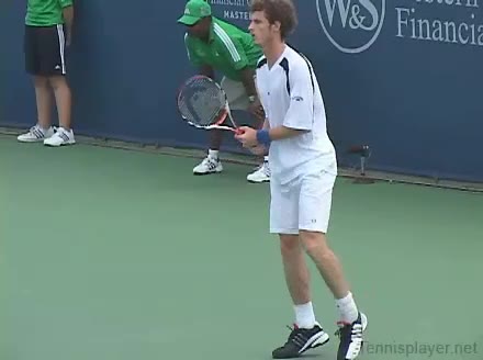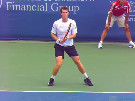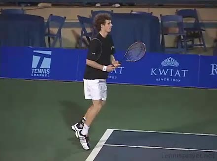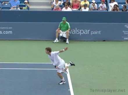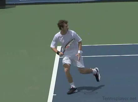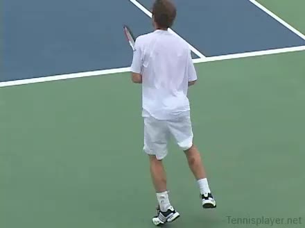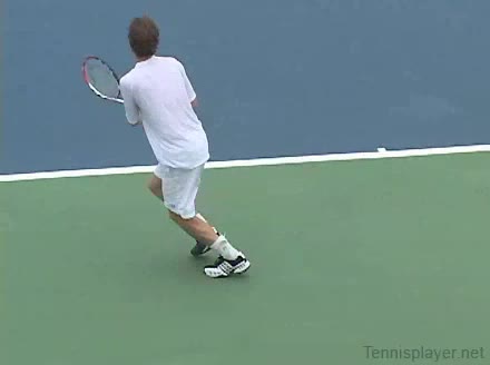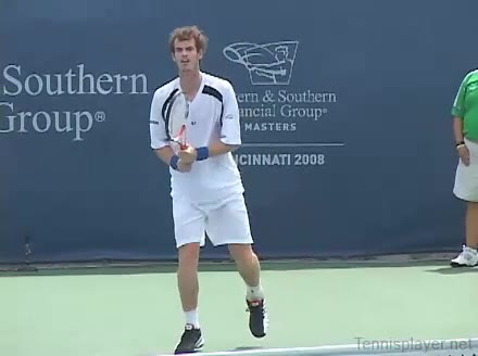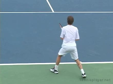 Andy Murray's forehand approach shot followed by a backhand volley from the center of the court, filmed from the side. His shoulders load with a pronounced turn on the forehand approach, then his trunk quickly uncoils and stays relatively closed through contact before rotating more square as he transitions into the backhand volley.