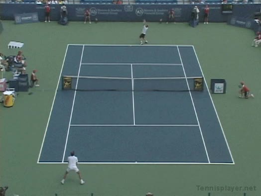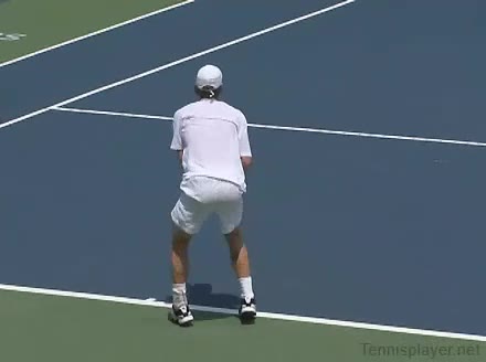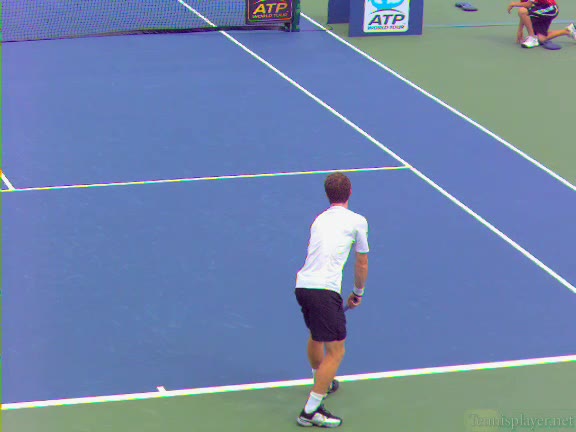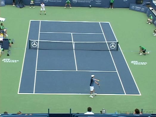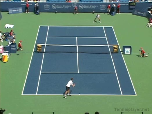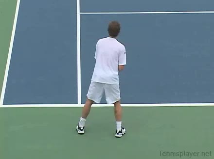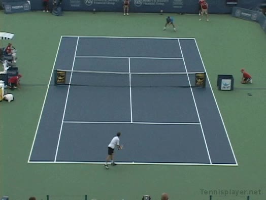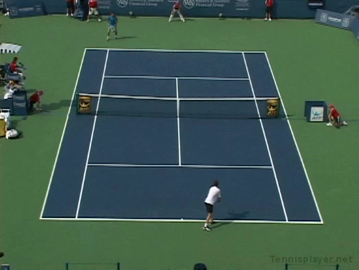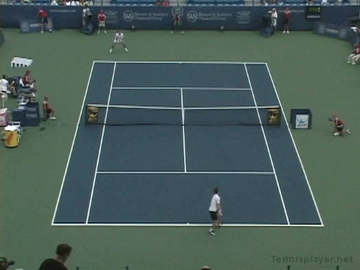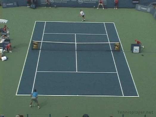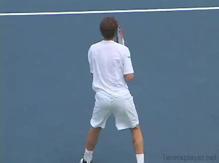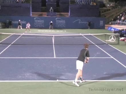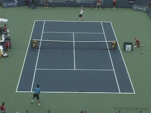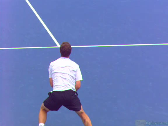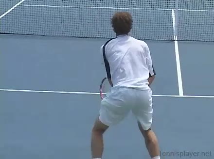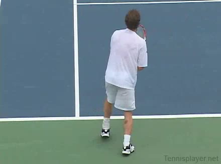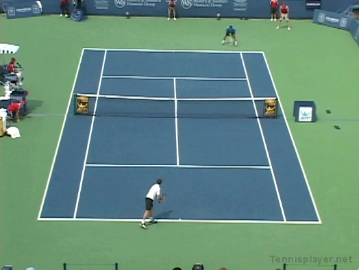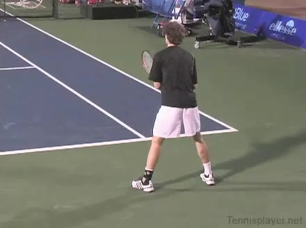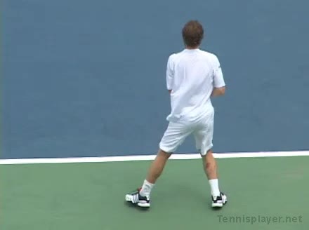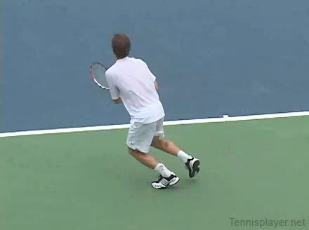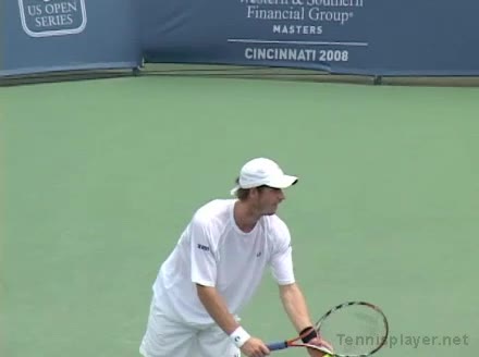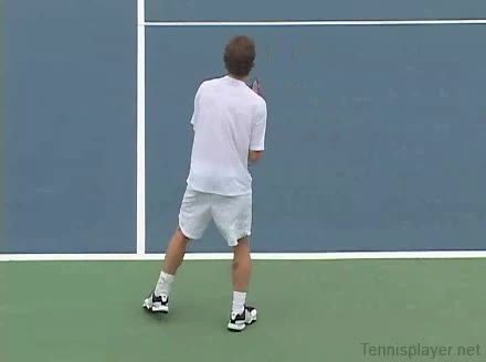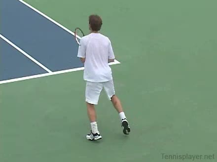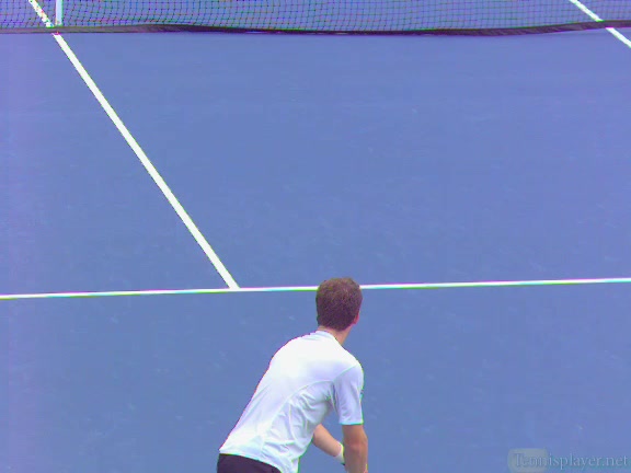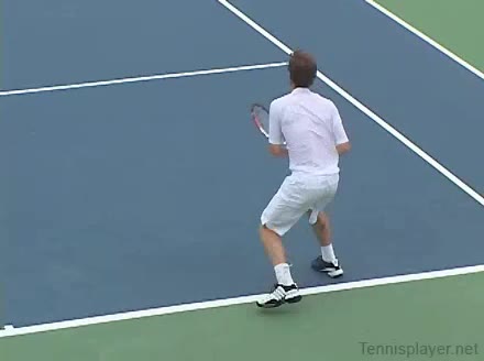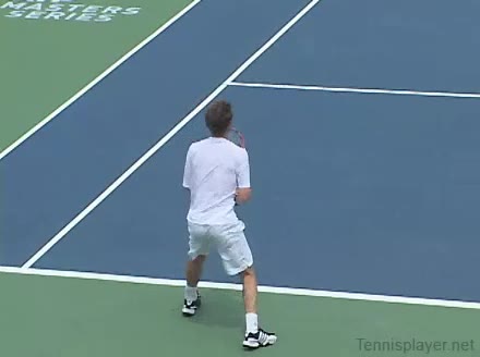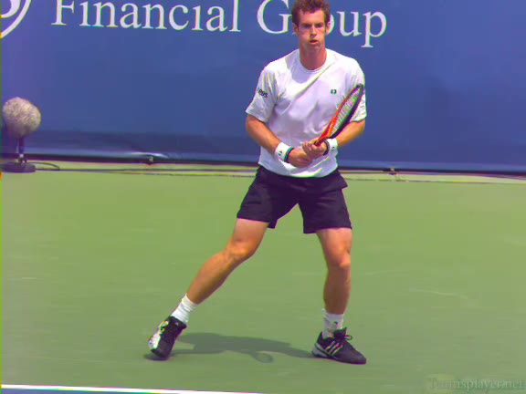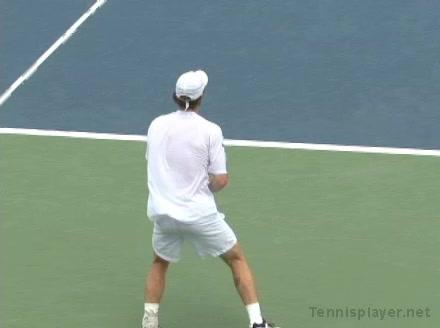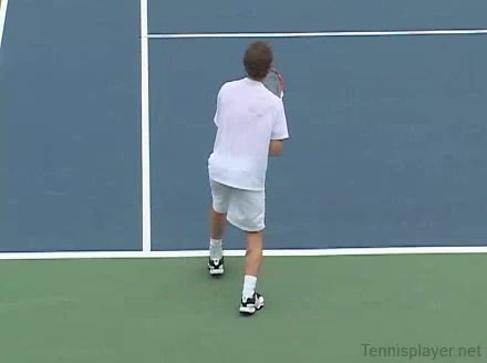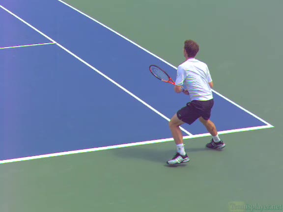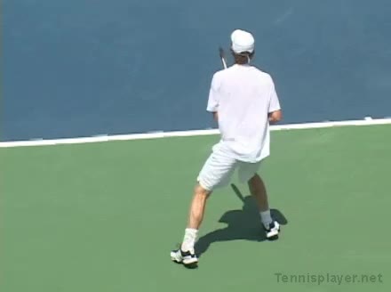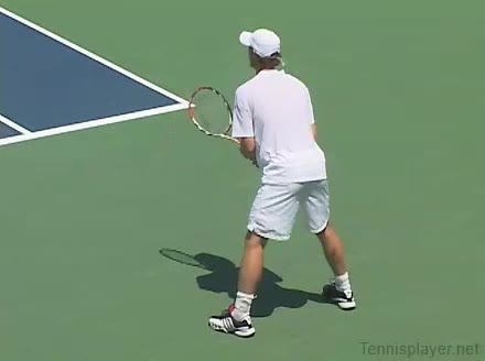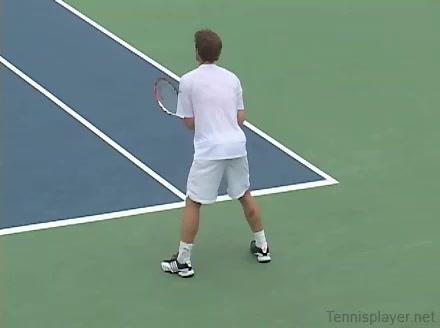 Andy Murray's forehand approach shot followed by a backhand volley from the center of the court, filmed from the side. His shoulders load with a pronounced turn on the forehand approach, then his trunk quickly uncoils and stays relatively closed through contact before rotating more square as he transitions into the backhand volley.