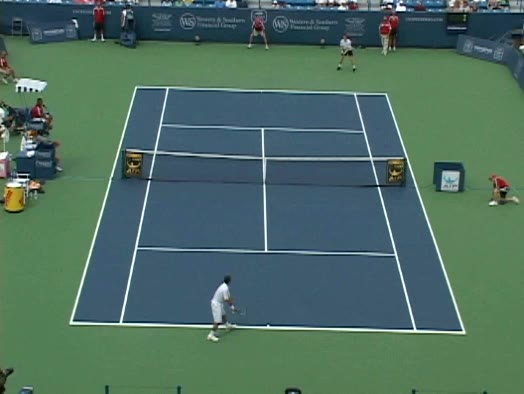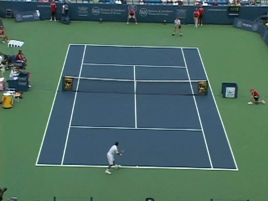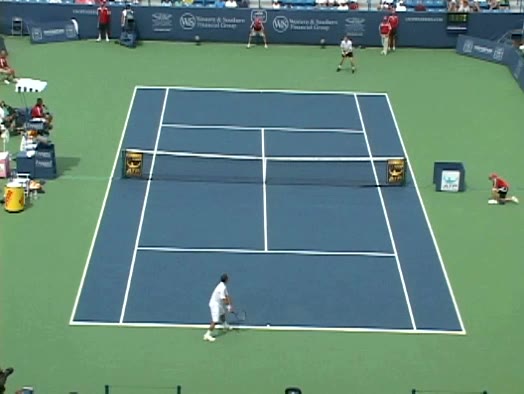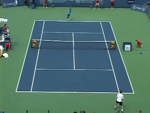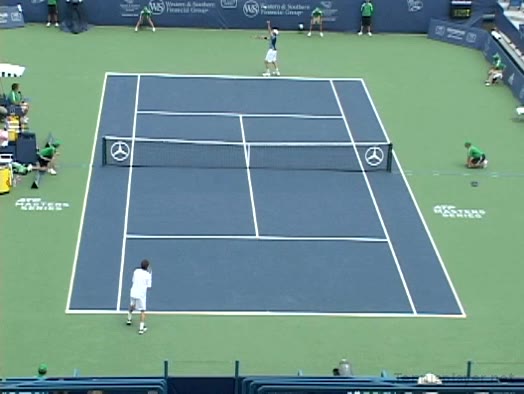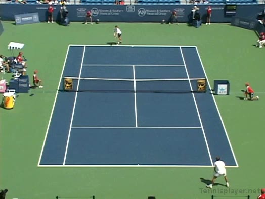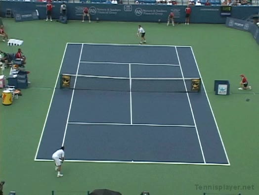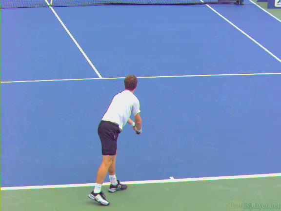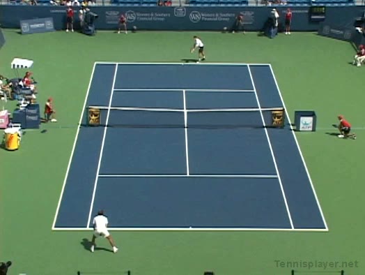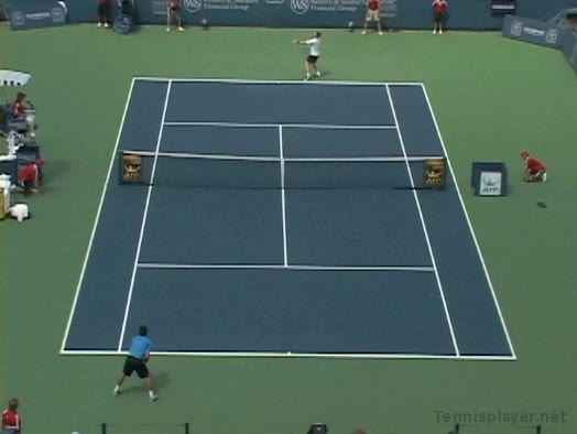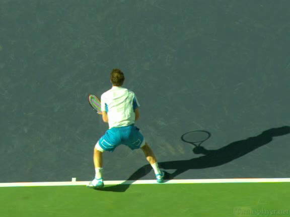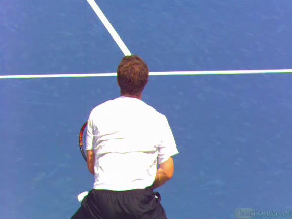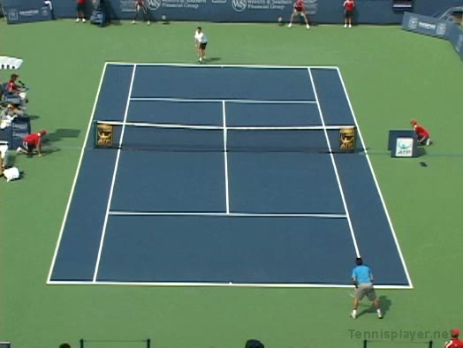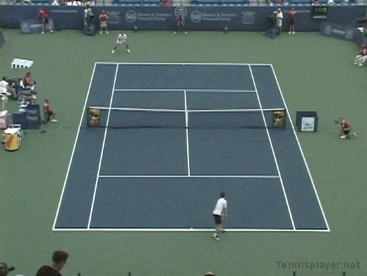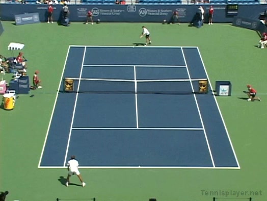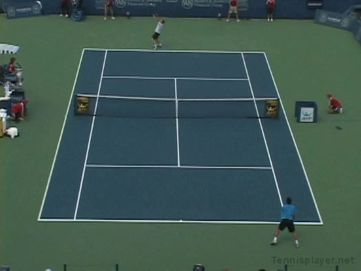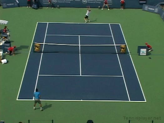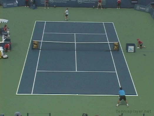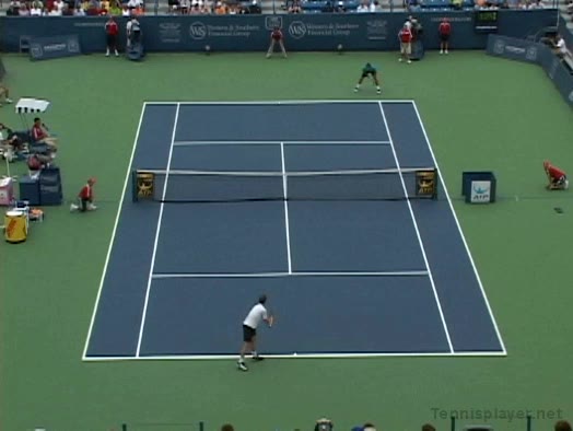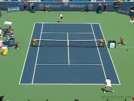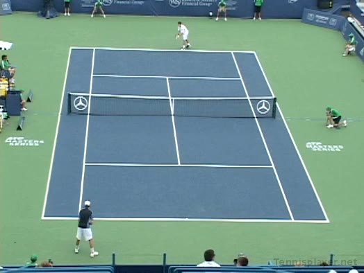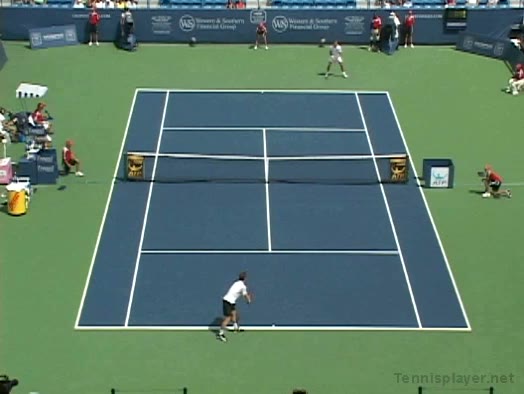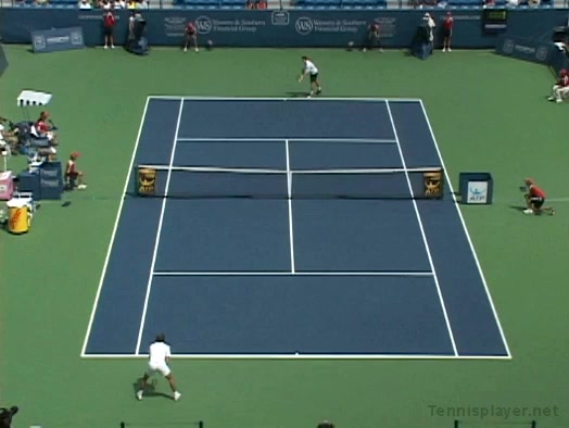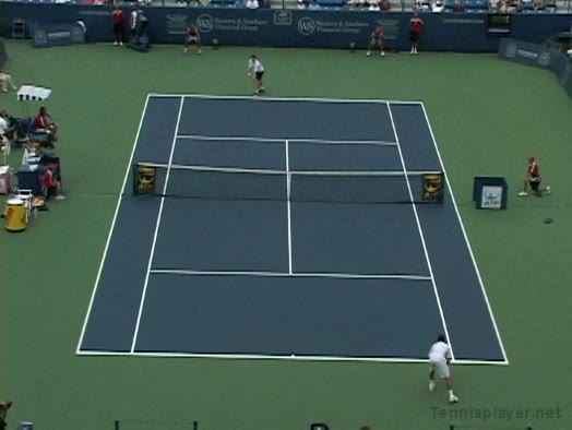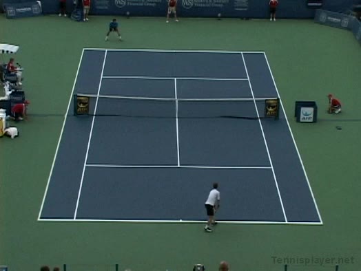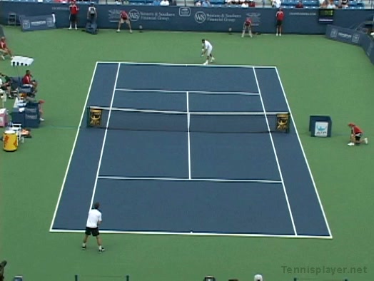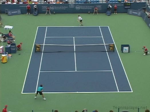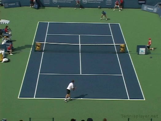 Andy Murray's forehand approach shot followed by a backhand volley from the center of the court, filmed from the side. His shoulders load with a pronounced turn on the forehand approach, then his trunk quickly uncoils and stays relatively closed through contact before rotating more square as he transitions into the backhand volley.