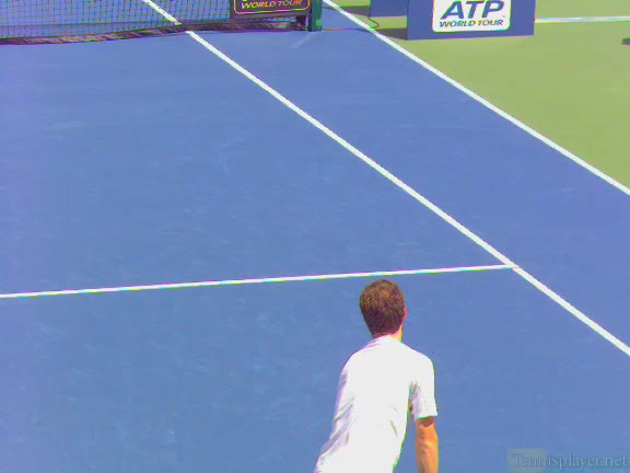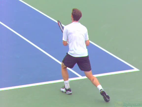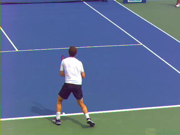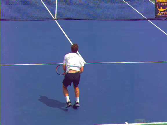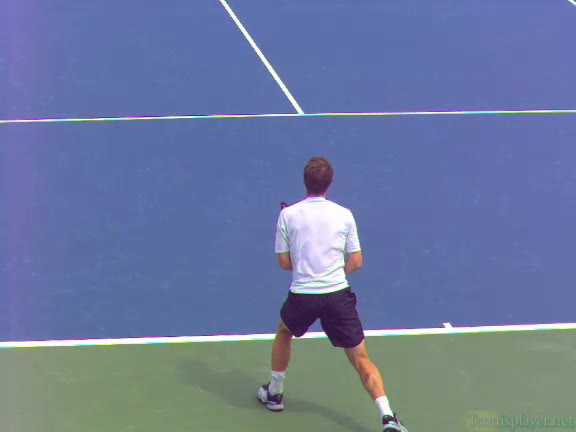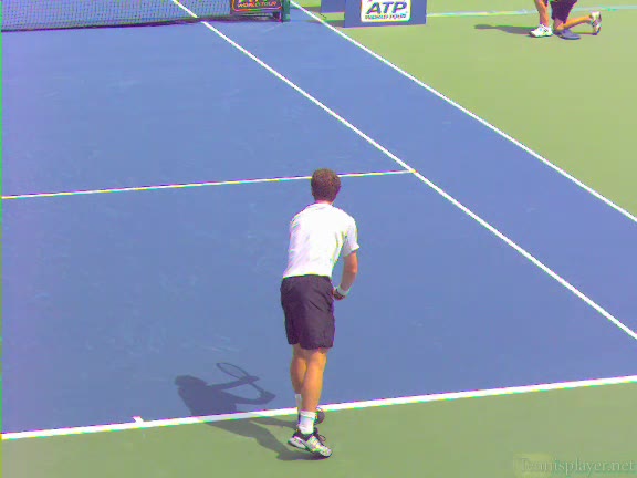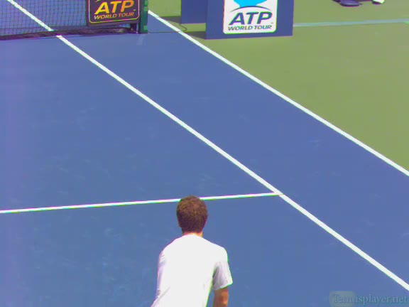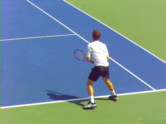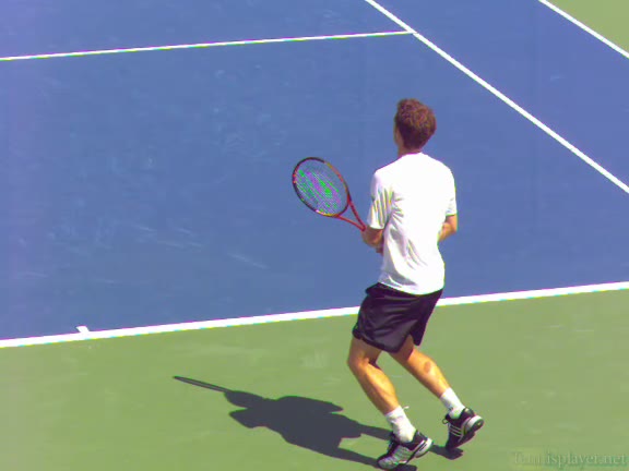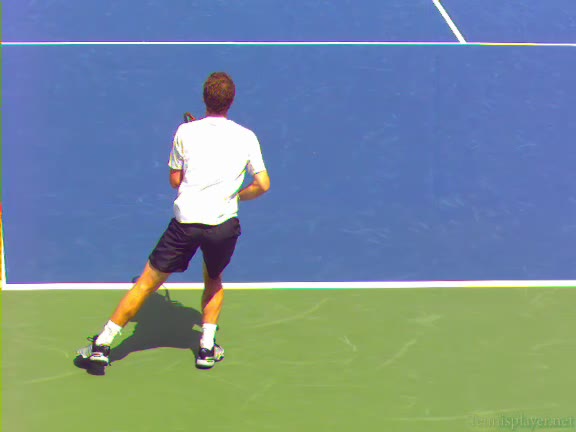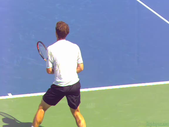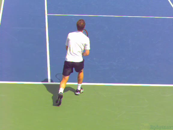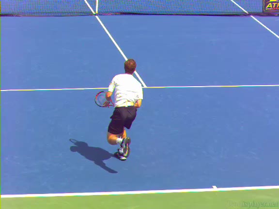 Andy Murray's running backhand slice from the rear, filmed from a high-speed 250 fps angle. After contact he extends the racquet hand along the target line while his non-hitting arm opens behind him for counterbalance before he regathers into a neutral ready position.