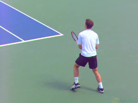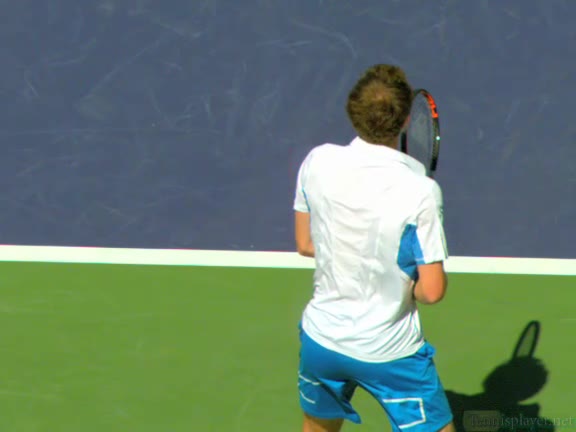 Andy Murray's backhand slice from a wide neutral stance, filmed from the rear at 250fps. The high-speed rear view makes it easy to see his slightly open racket face at contact and the steep, downward cutting path of the racket through the ball.