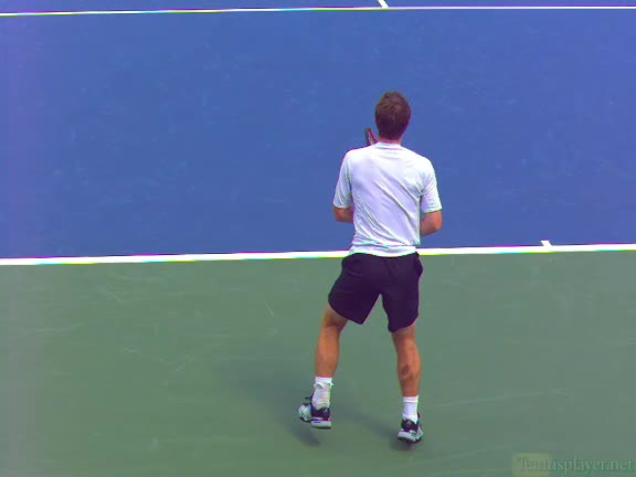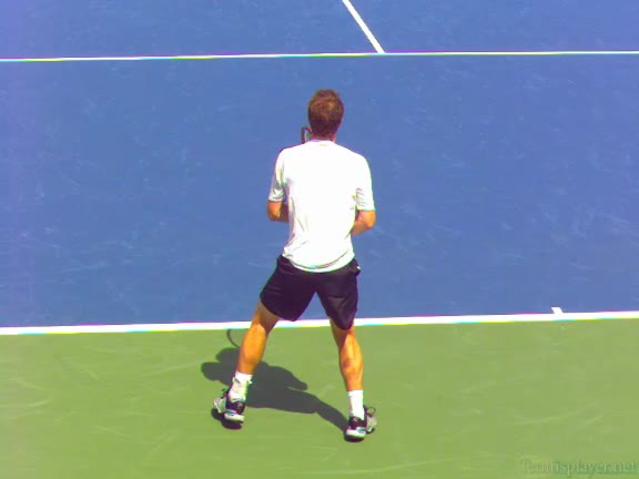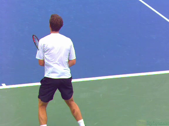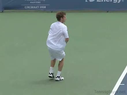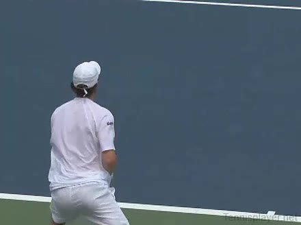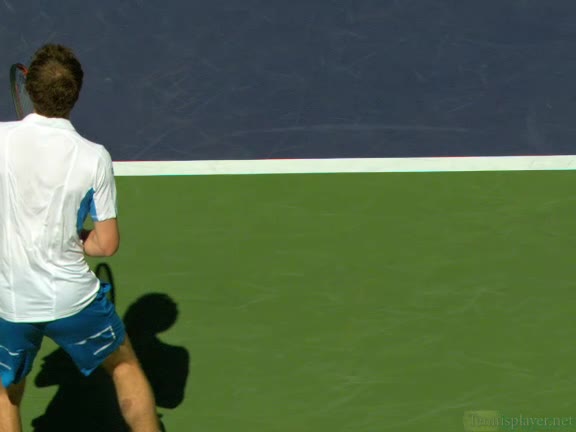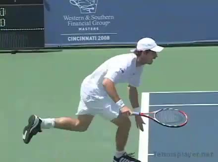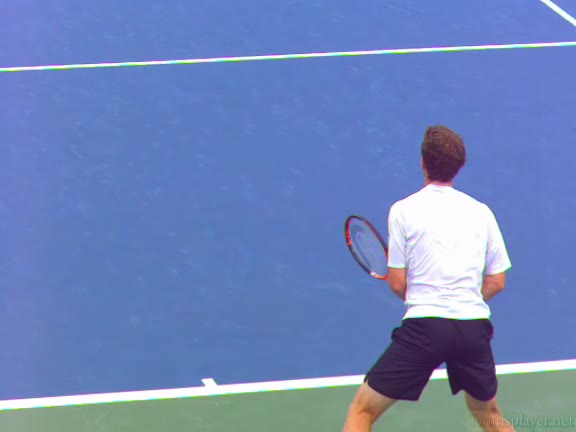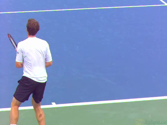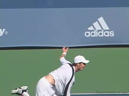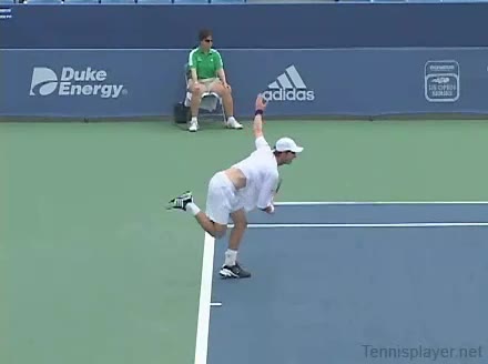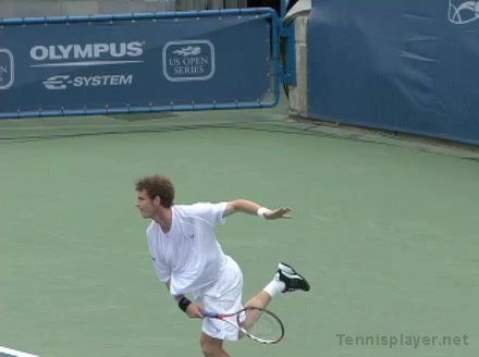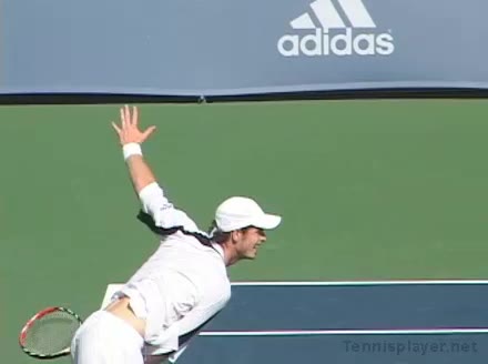 Andy Murray's backhand slice from a wide defensive position, filmed from a rear angle. After contact his racquet finishes out in front with the non-hitting hand extending back for counterbalance as he recovers laterally and begins to reset his feet toward a neutral ready position.