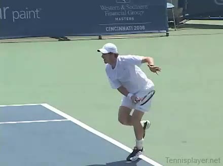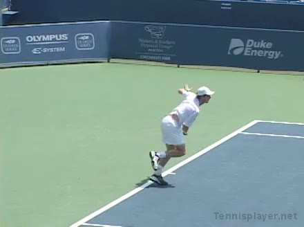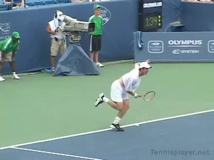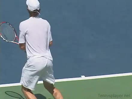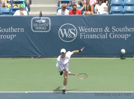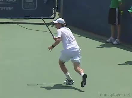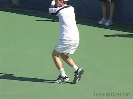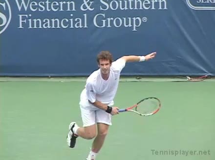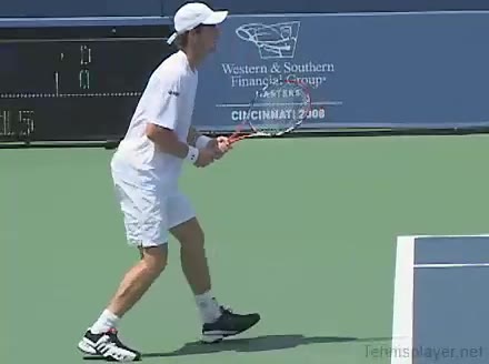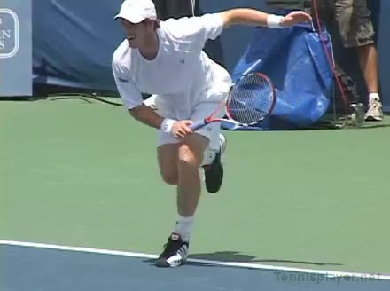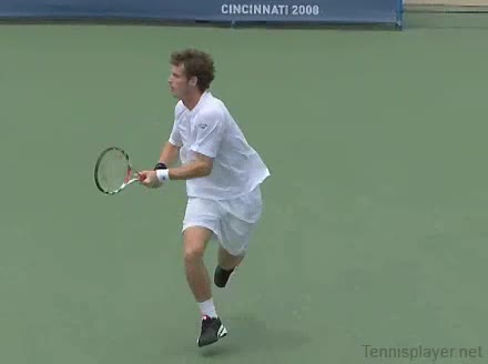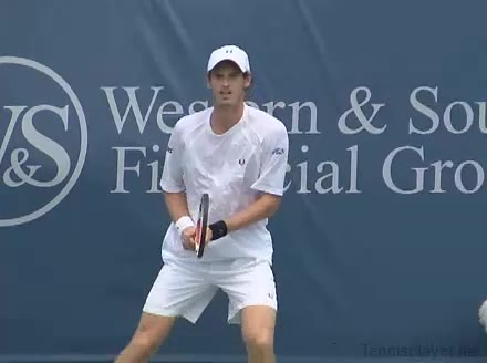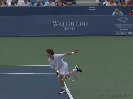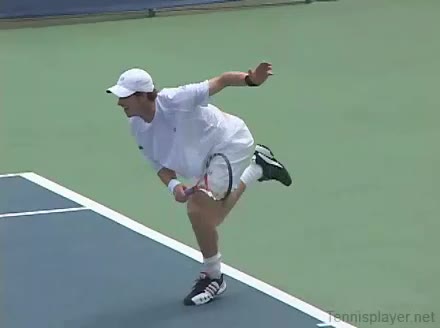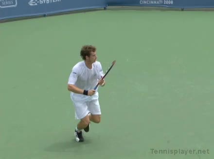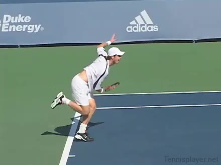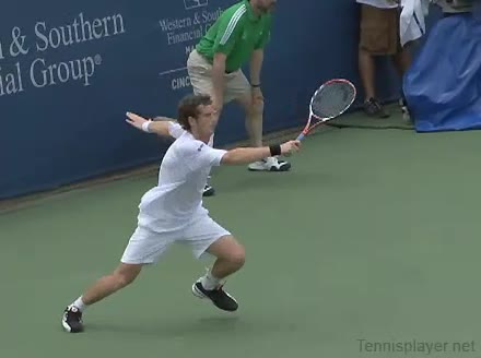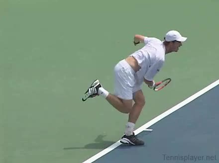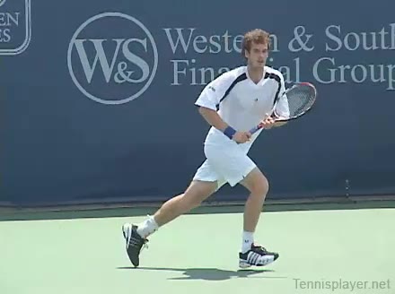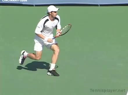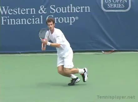 Andy Murray's running backhand slice from the side, filmed from a side angle. His shoulders rotate early to set the racquet path while his trunk stays relatively closed through contact, then gently uncoils down the target line as his momentum carries him past the shot.