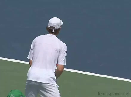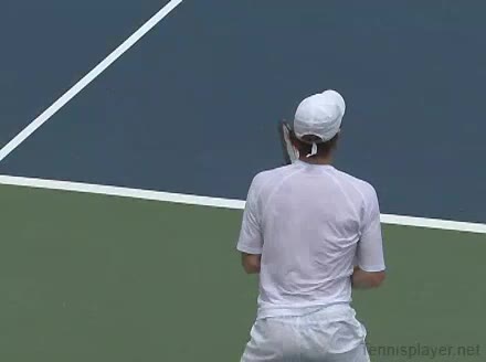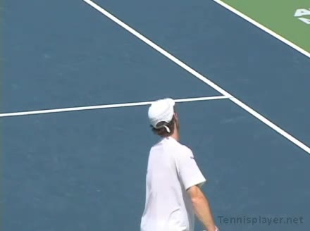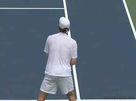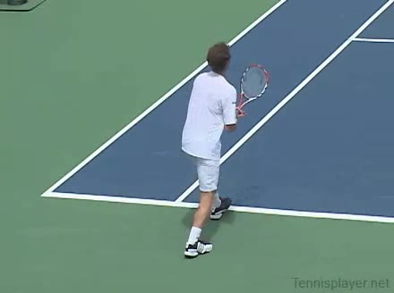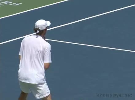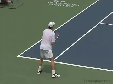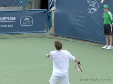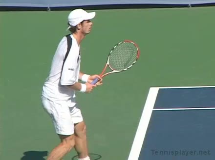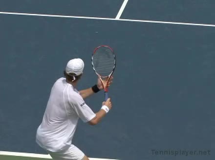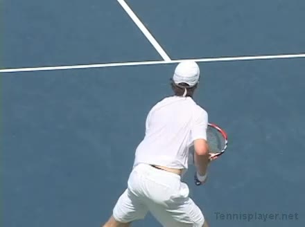 Andy Murray's backhand slice InsideOut from the baseline, filmed from a rear angle. His follow-through finishes with the racquet hand extending out toward the target while his weight transfers onto the front foot, bringing him quickly back into a compact ready position.