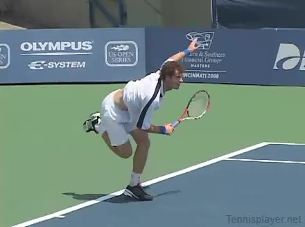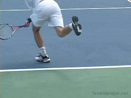 Andy Murray's backhand slice from a wide position, filmed from the side. His hips stay relatively closed to the net while his knees flex to lower his center of gravity, with the back leg lightly driving off the court to reach the wide ball.
