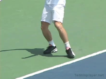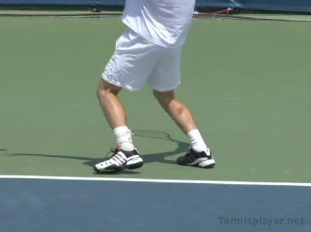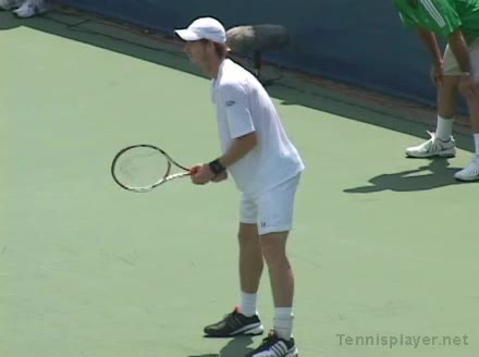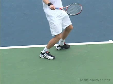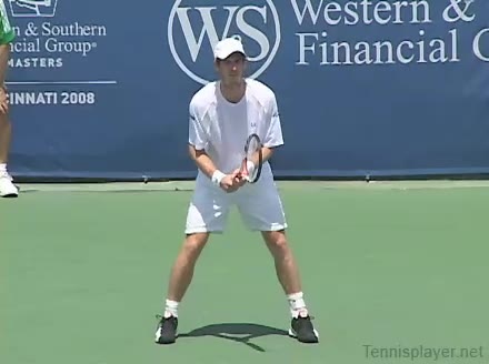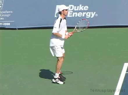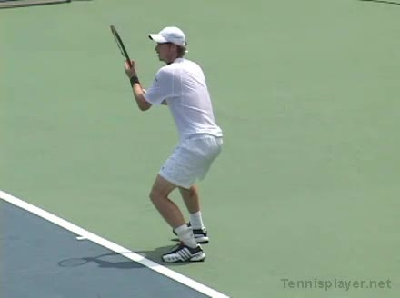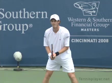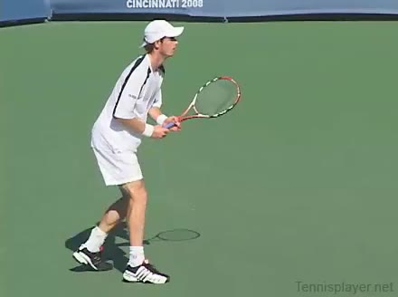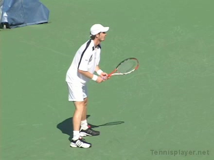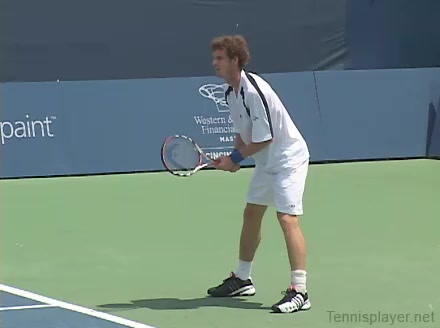 Andy Murray's backhand slice from the baseline, filmed from a side angle. His feet set in a neutral stance with a small adjustment step before contact, and you can clearly see the front foot planting early to support the upper-body rotation through the slice.