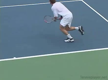 Andy Murray's backhand drop shot approach followed by a forehand volley from the center of the court, filmed from the front. His hips stay relatively closed on the backhand drop shot with a pronounced knee bend, then drive forward with an aggressive push off the legs as he transitions into the forehand volley.